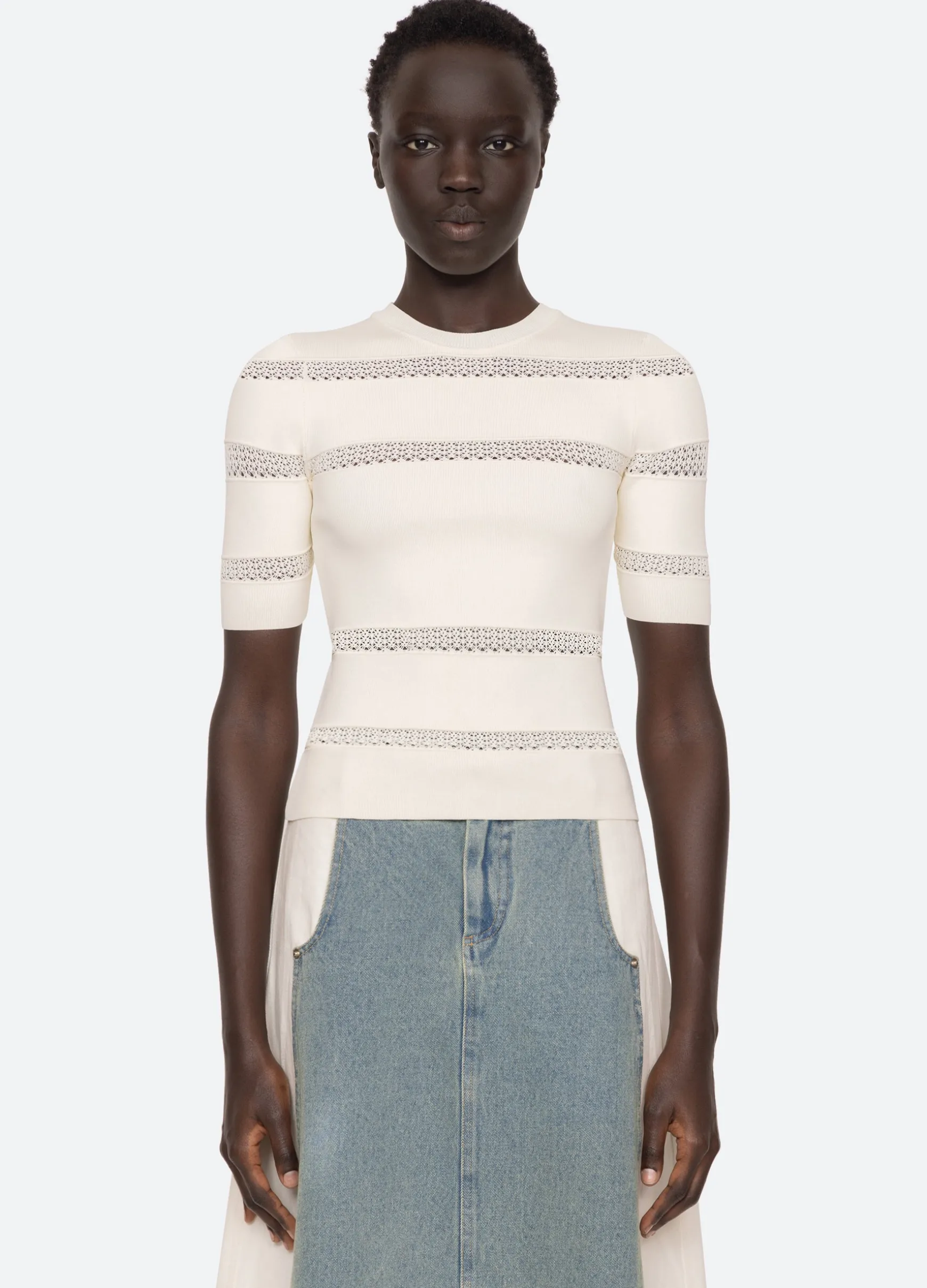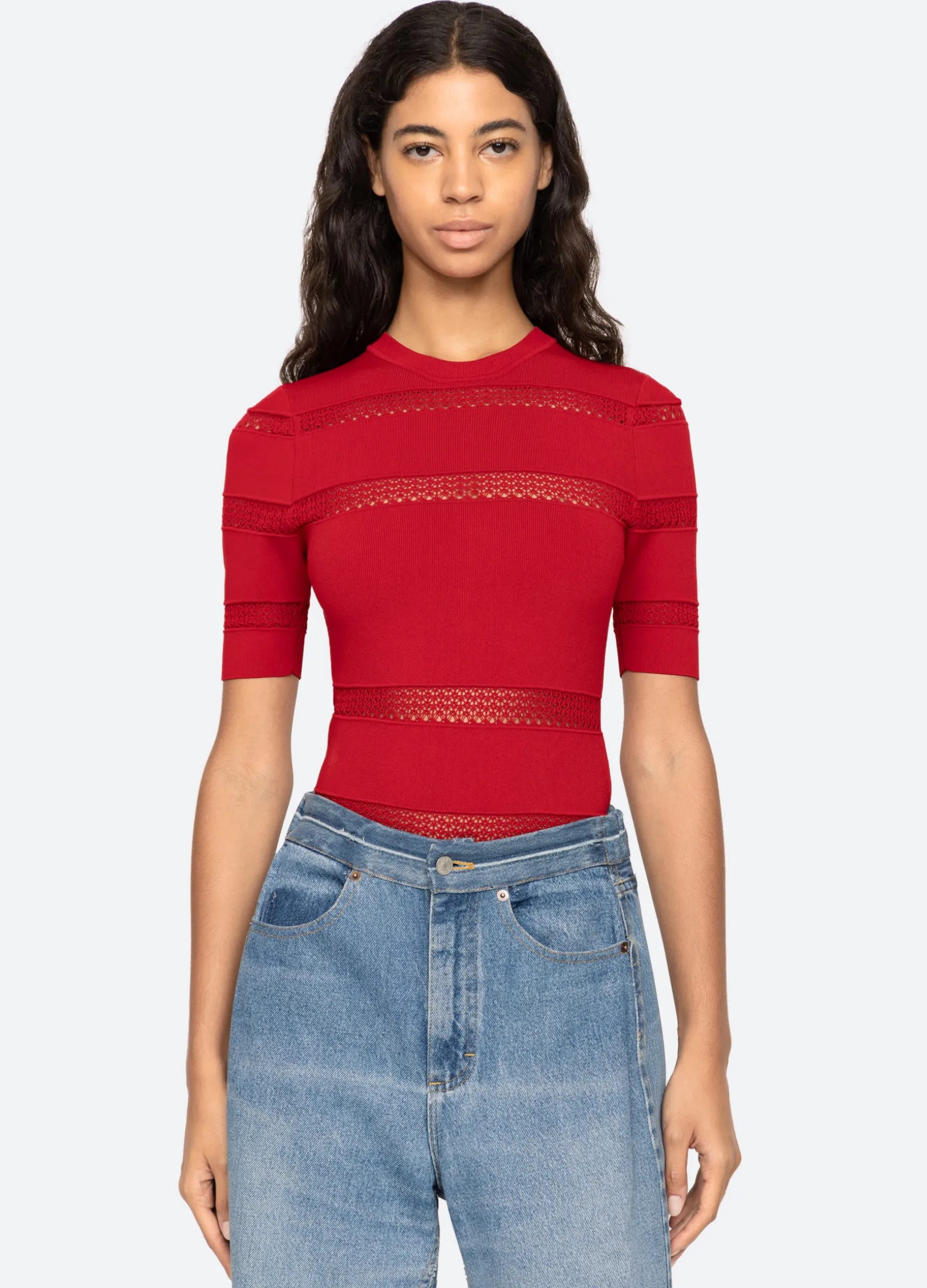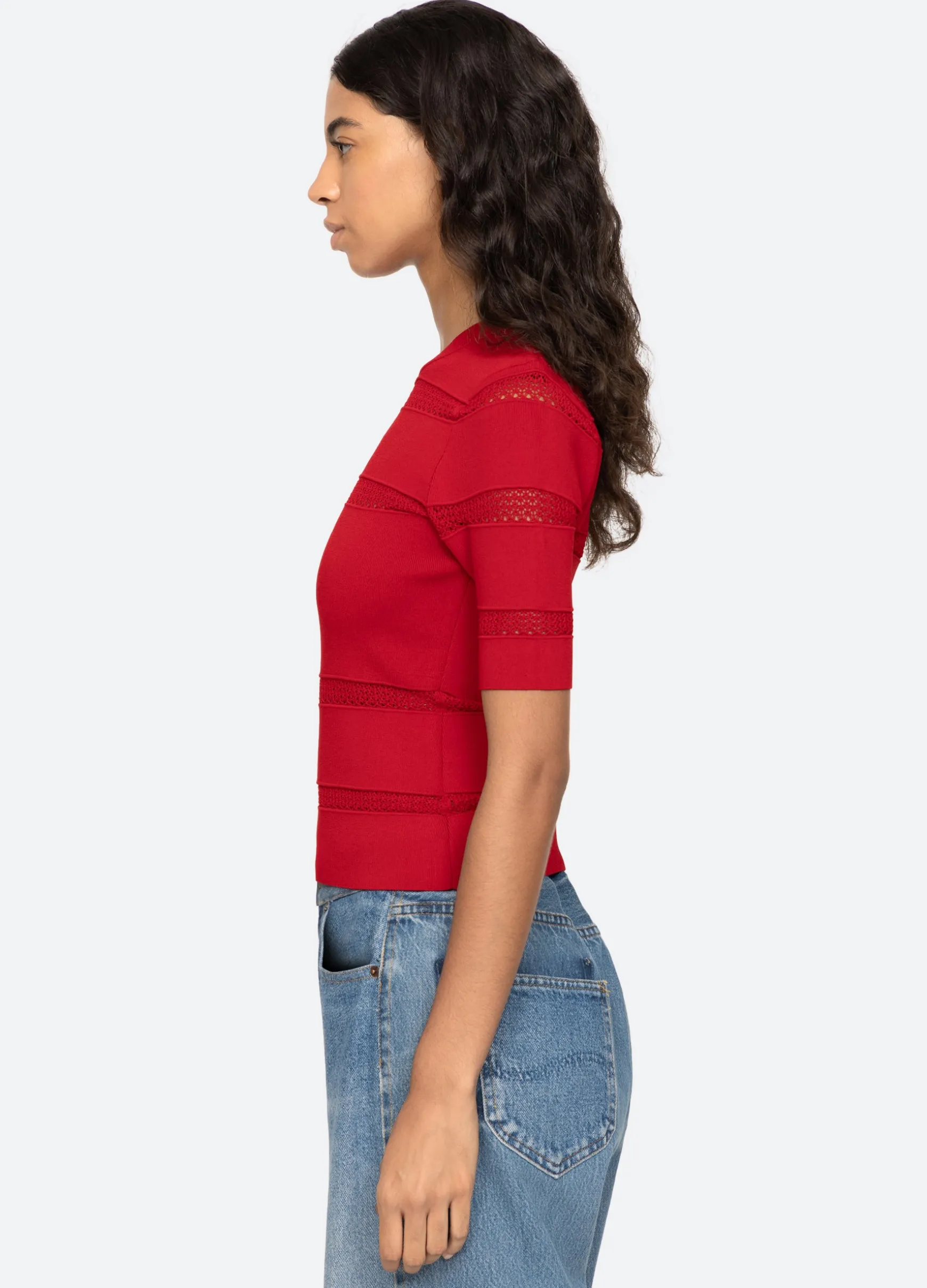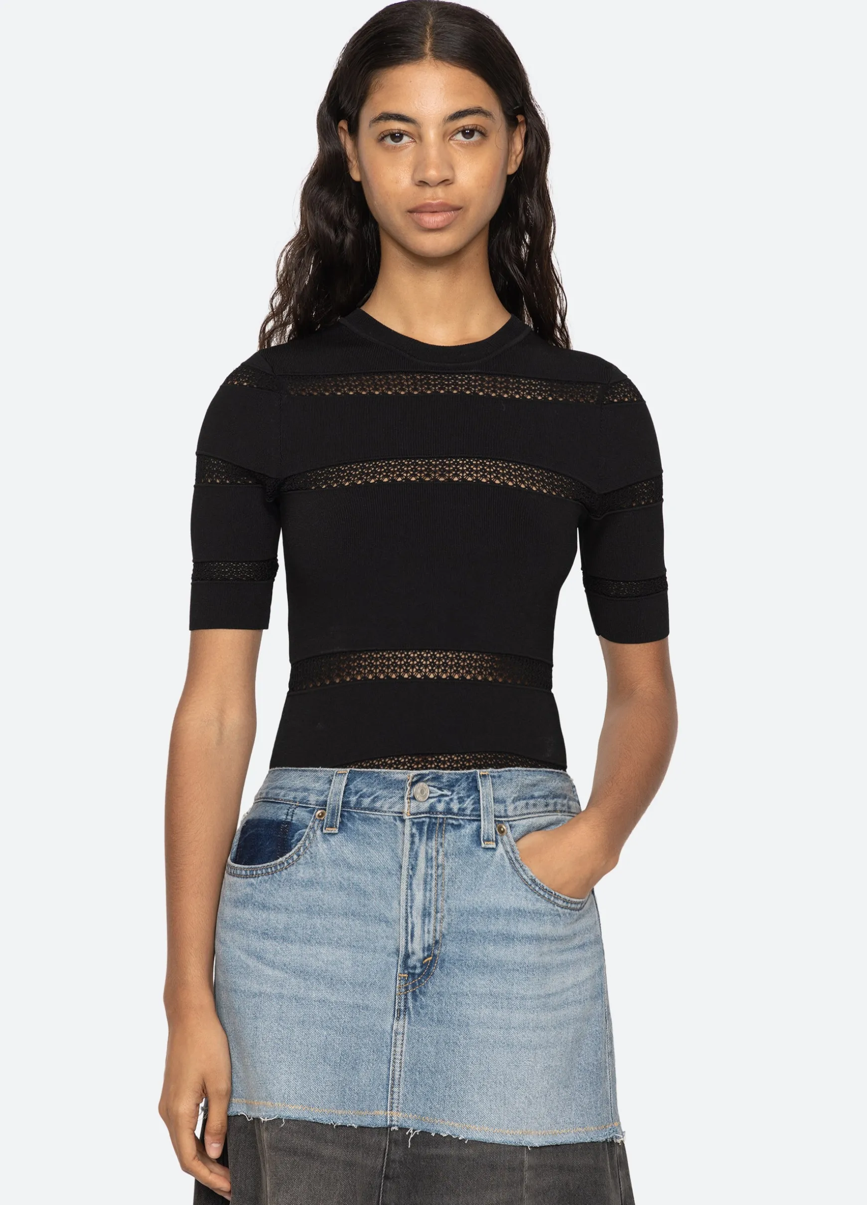 The Devon knit short sleeve top features sheer accents and is designed for a slim fit. The perfect layering piece.