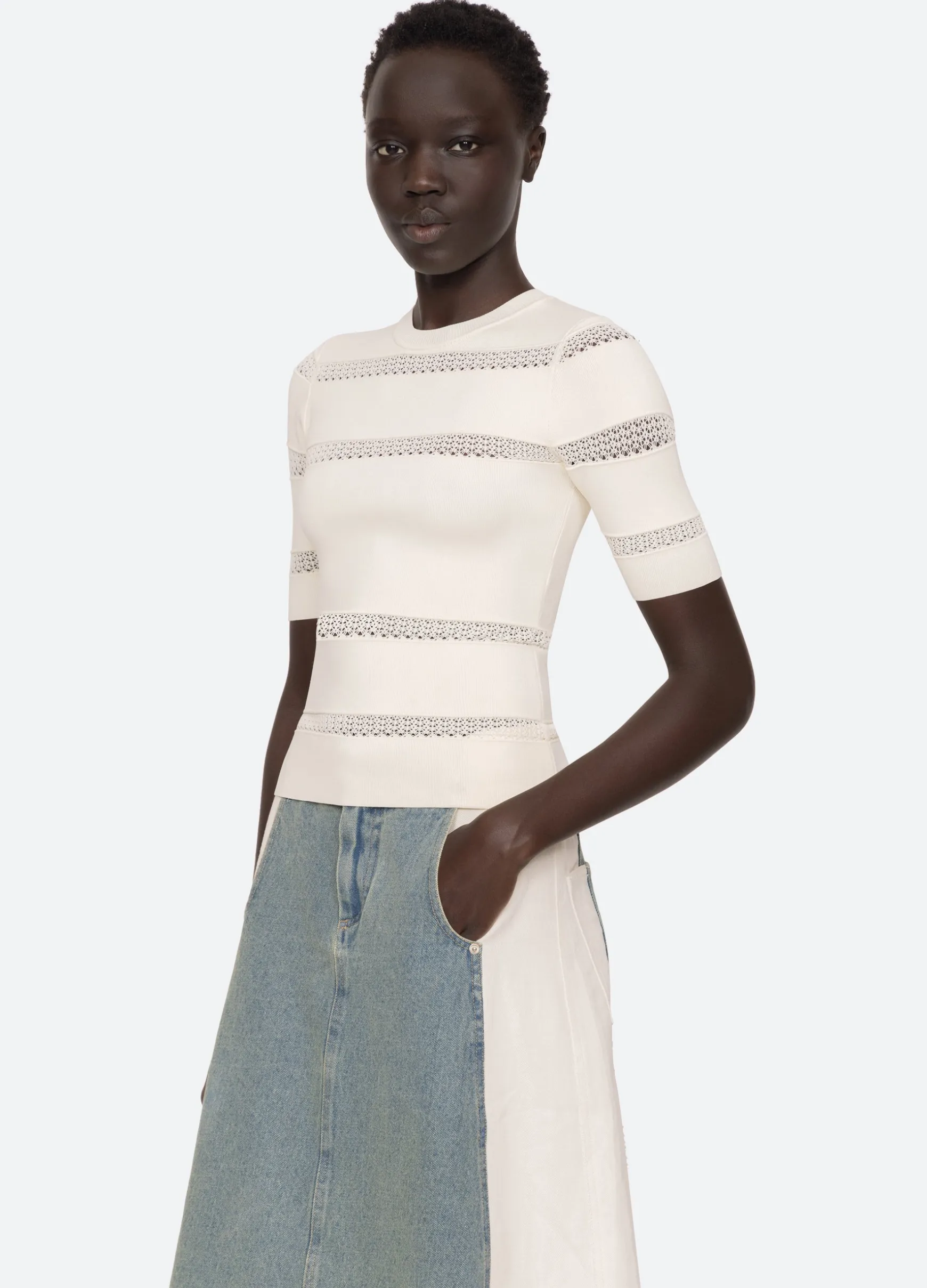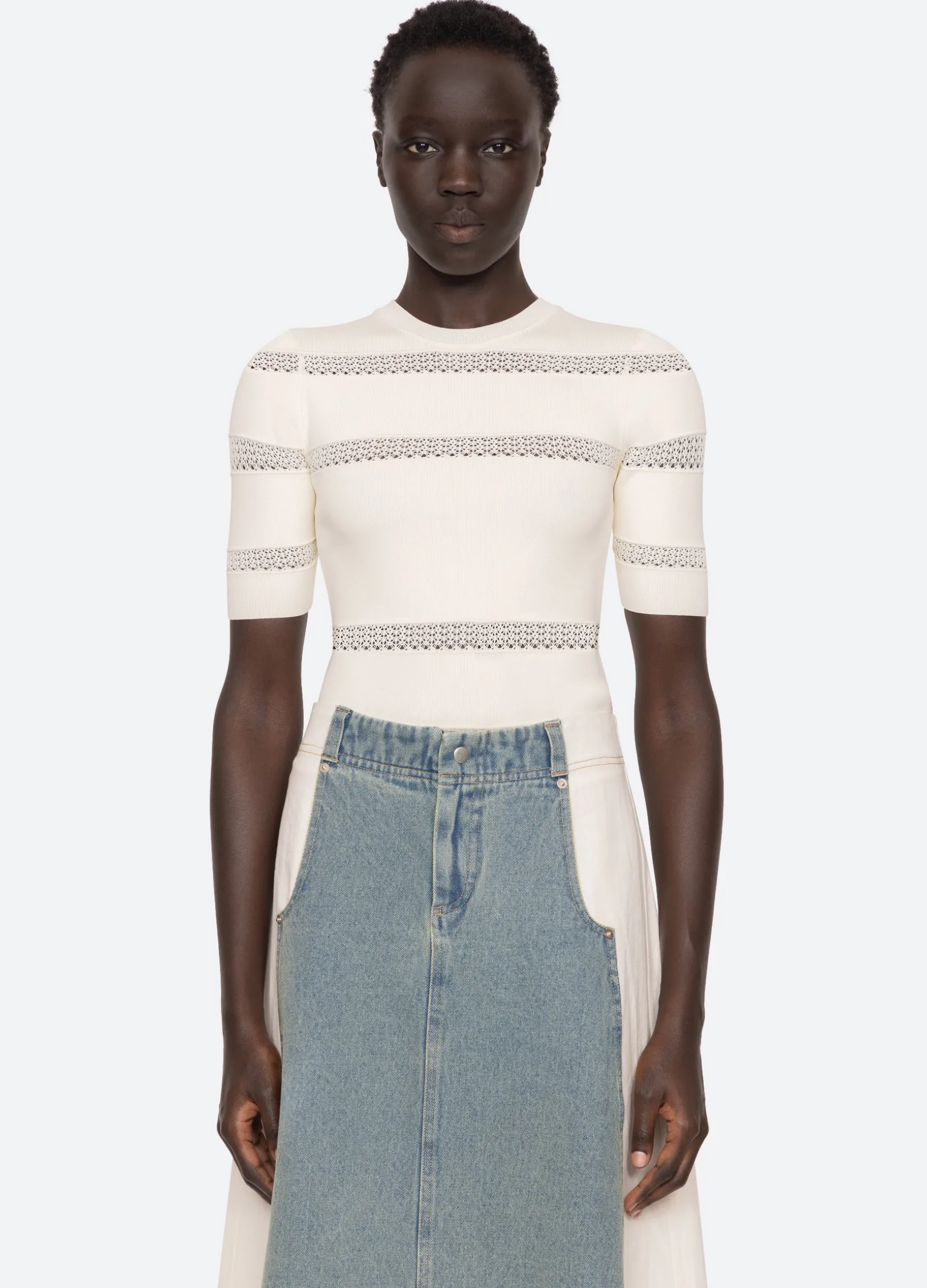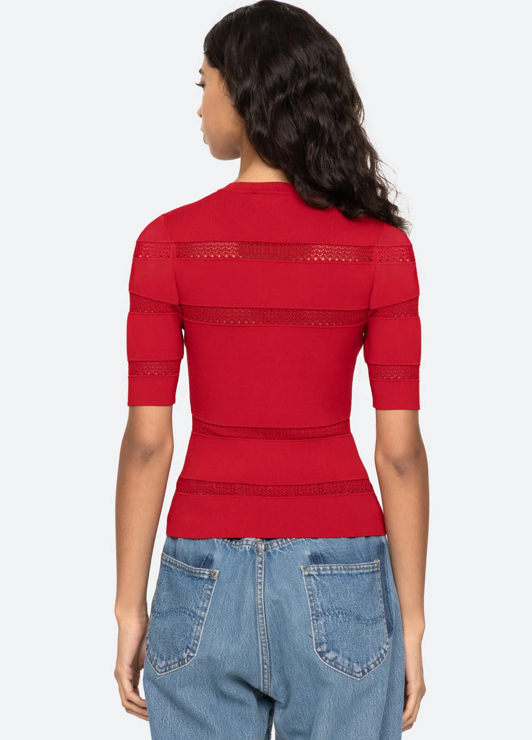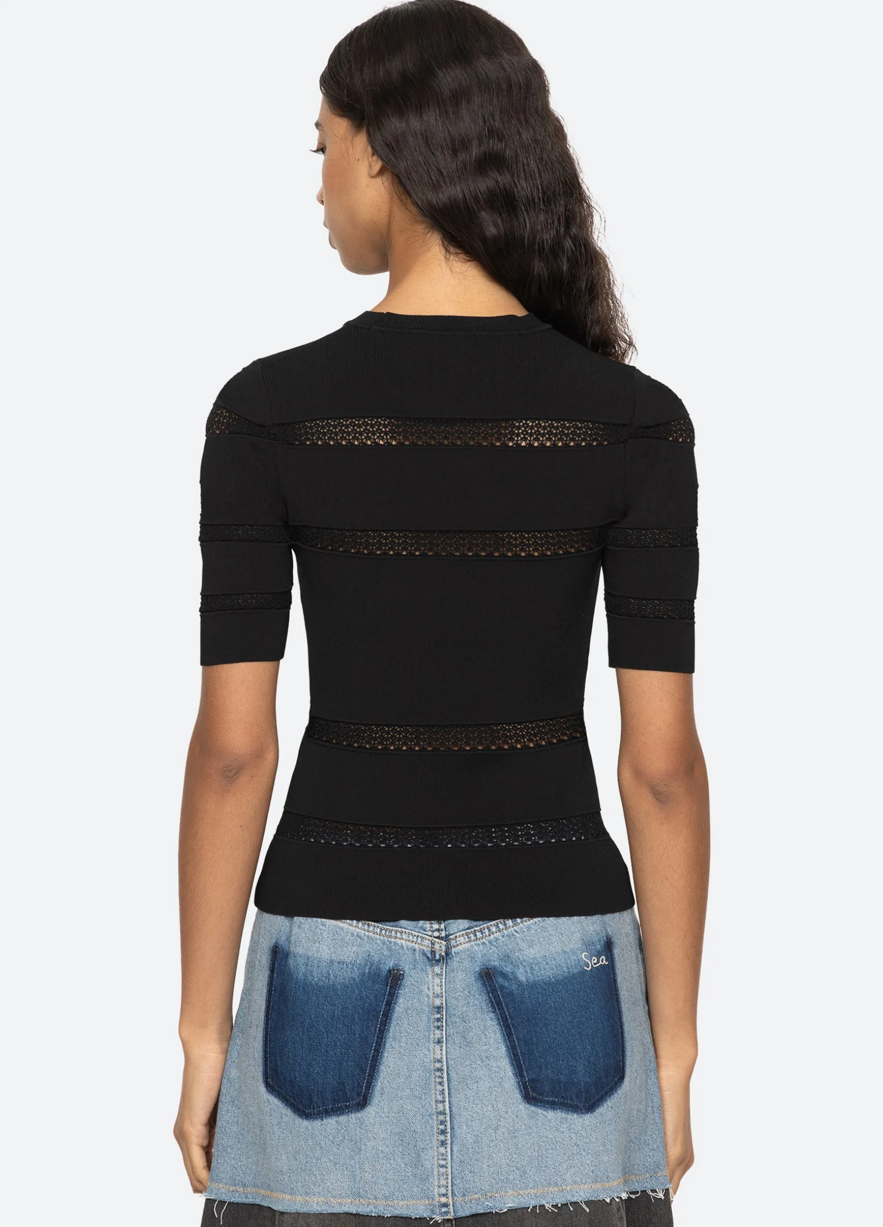 The Devon knit short sleeve top features sheer accents and is designed for a slim fit. The perfect layering piece.
