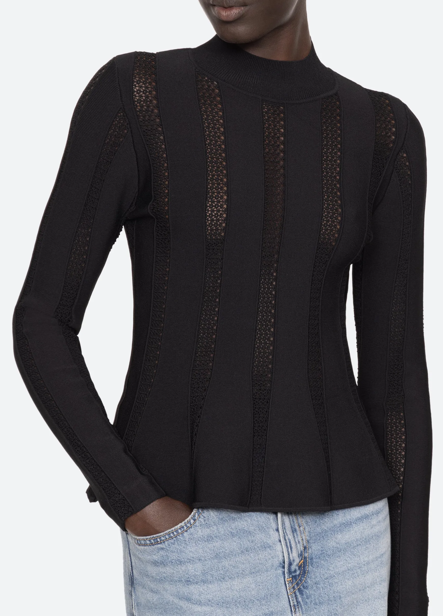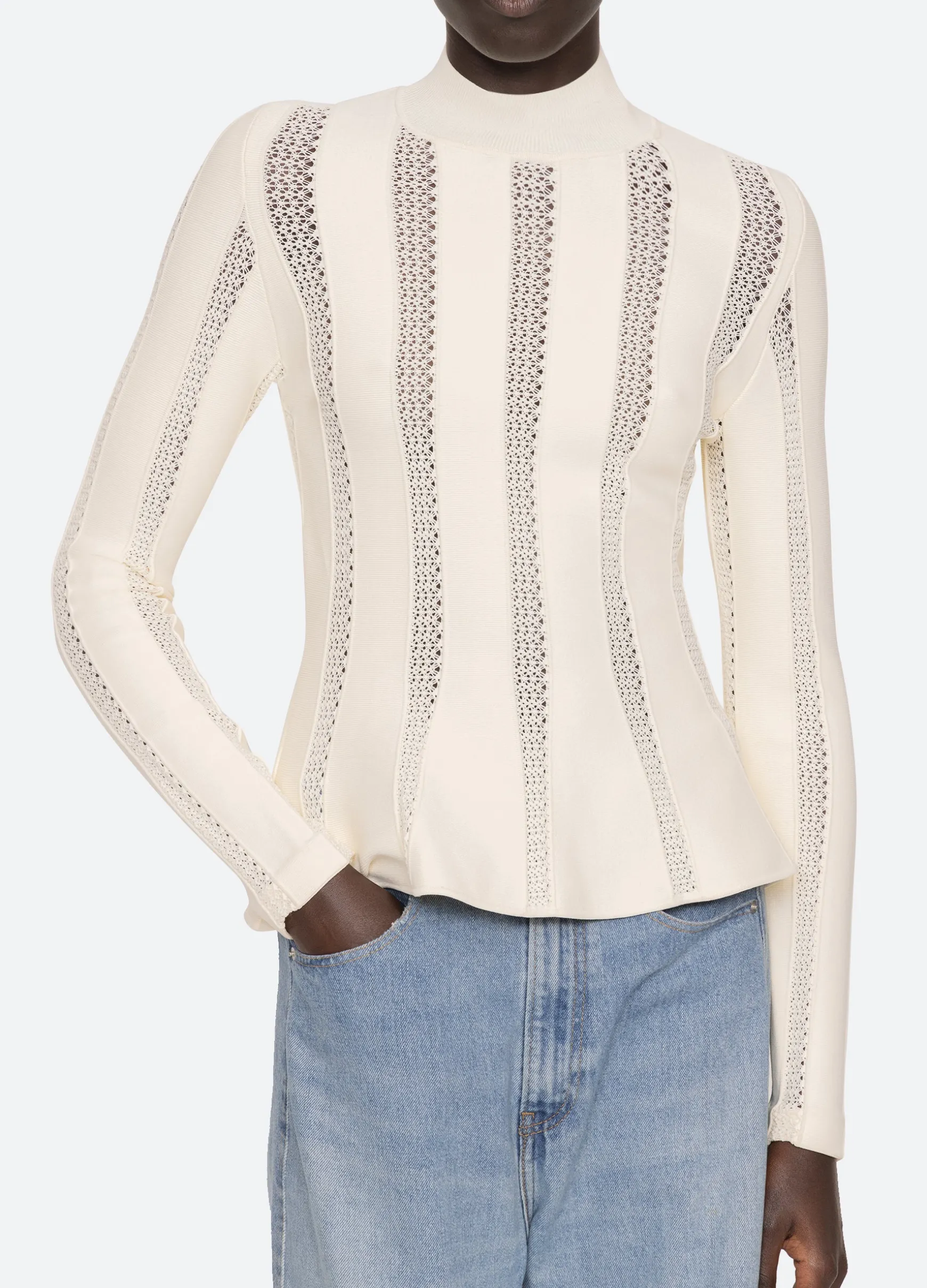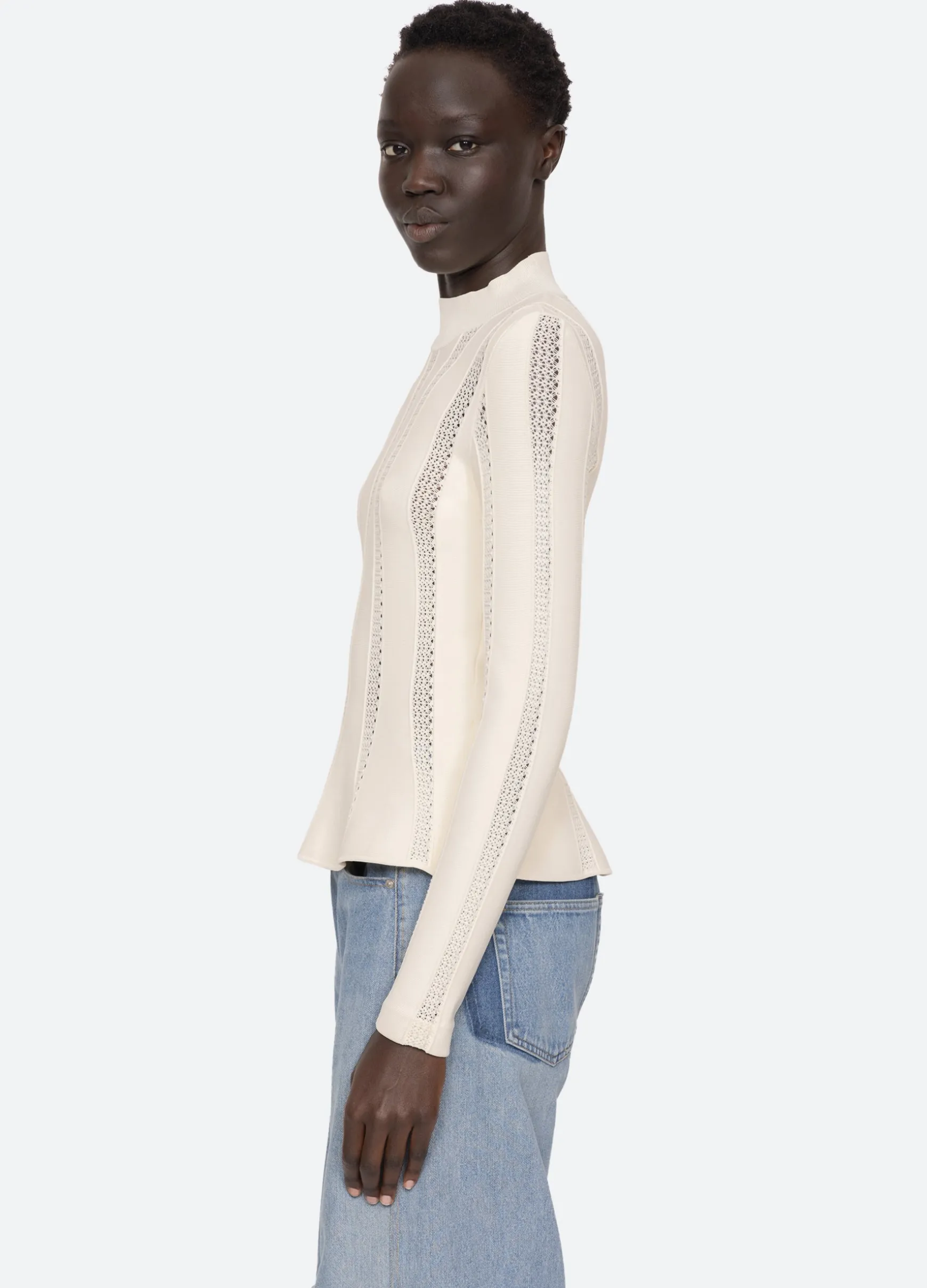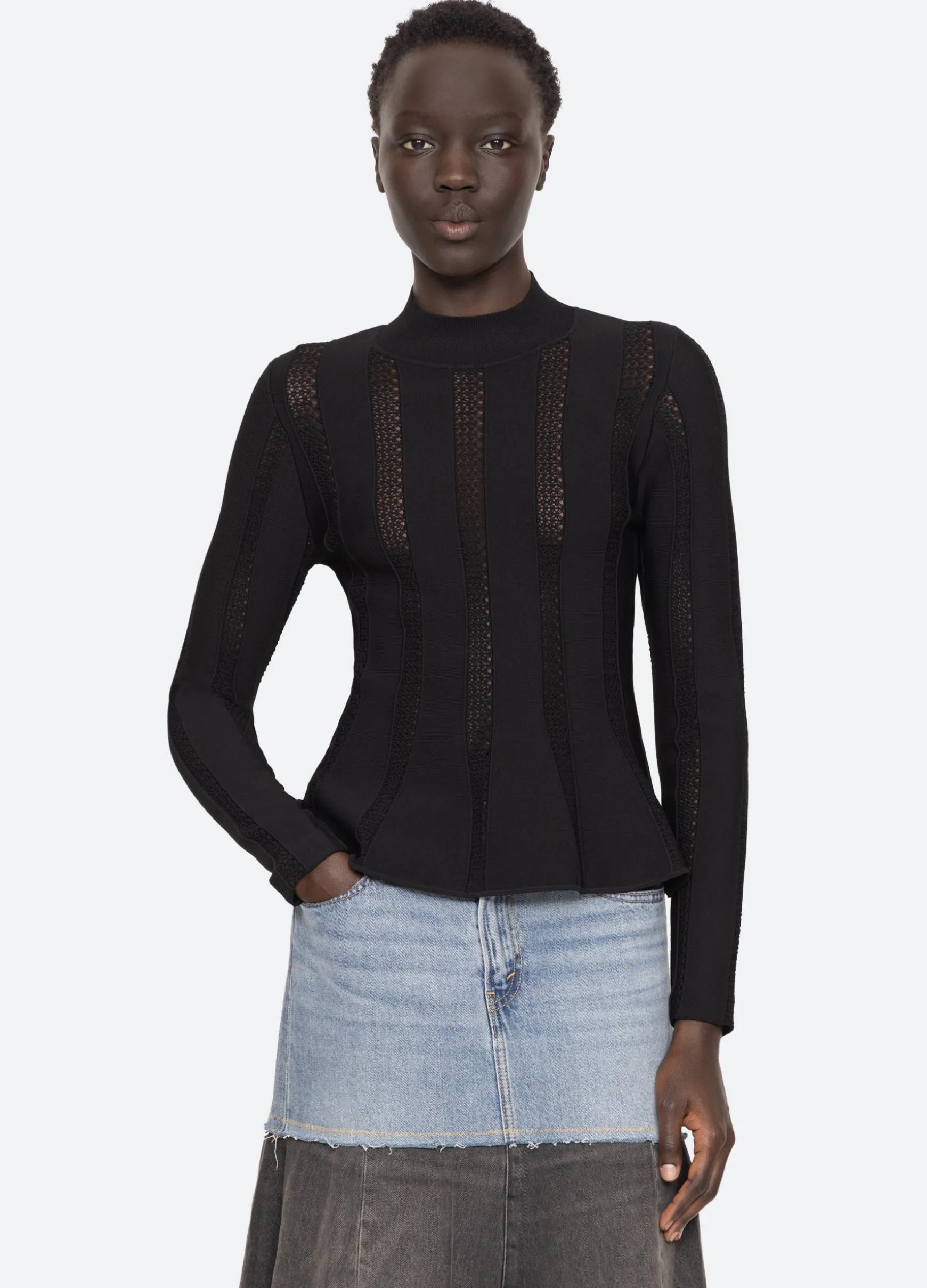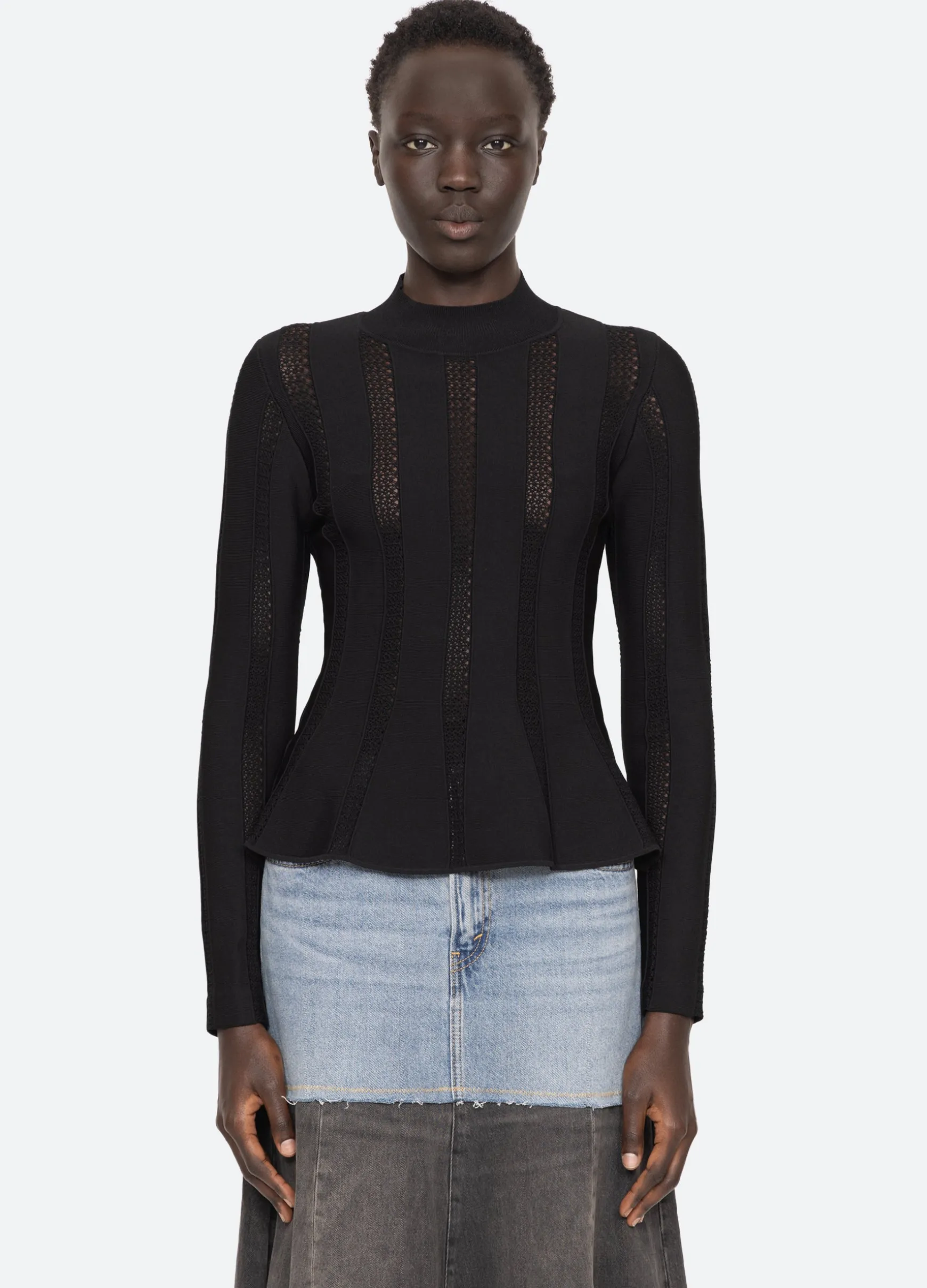 The Devon knit peplum top features a high neckline, sheer accents, and is designed for a slim fit.