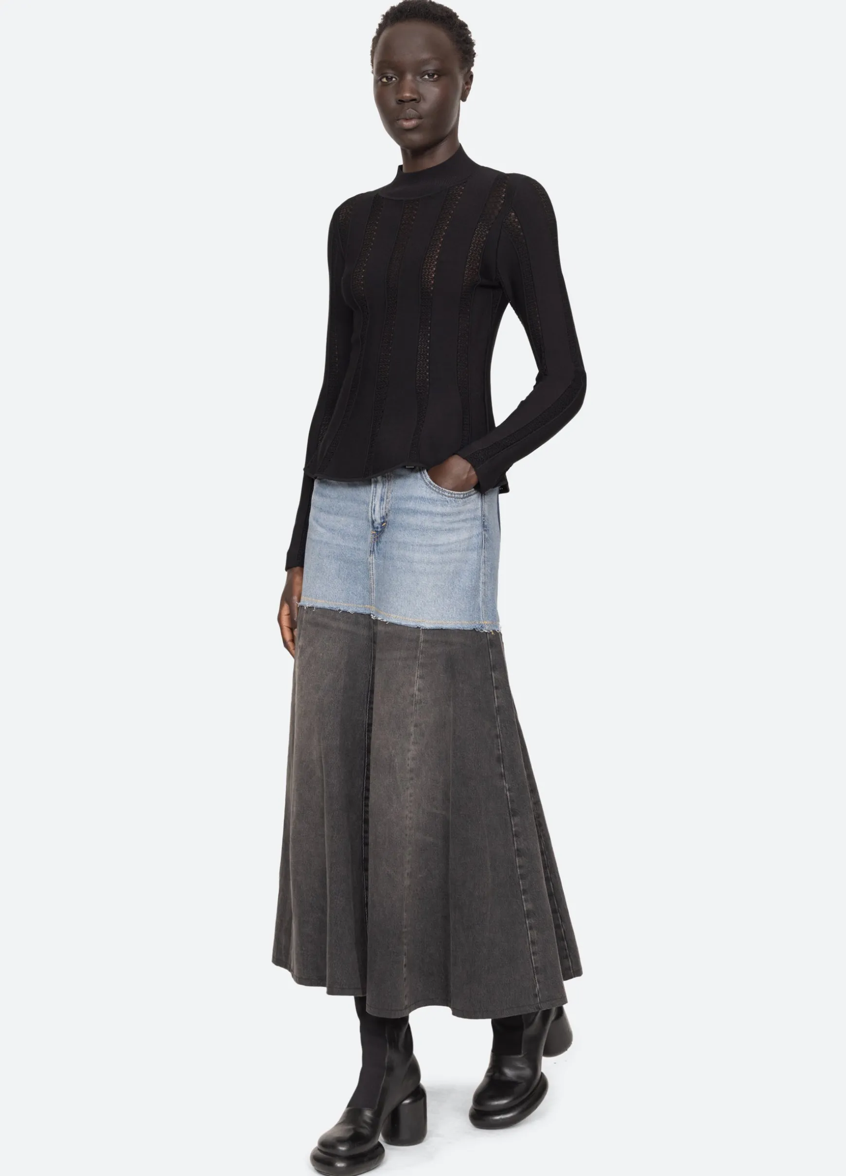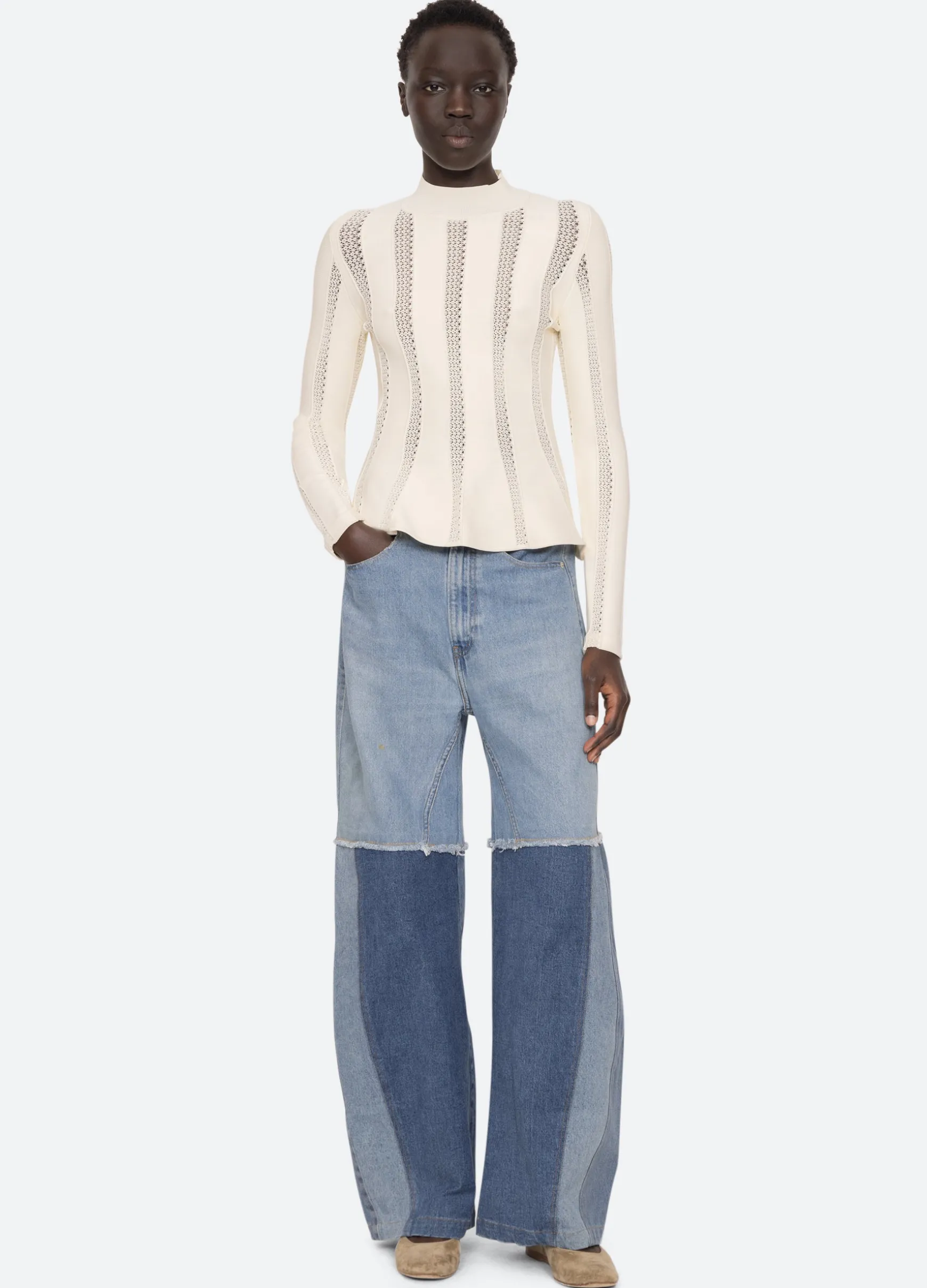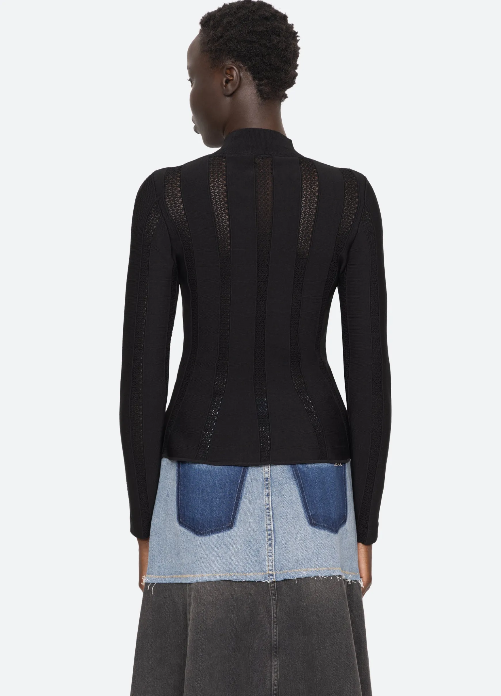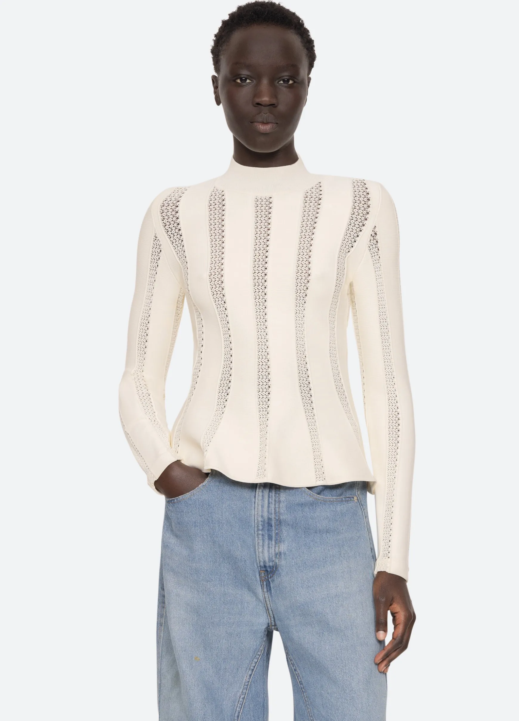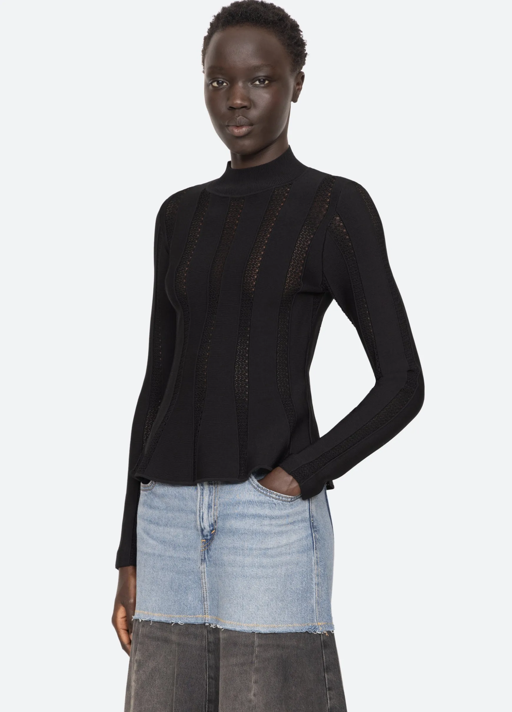 The Devon knit peplum top features a high neckline, sheer accents, and is designed for a slim fit.