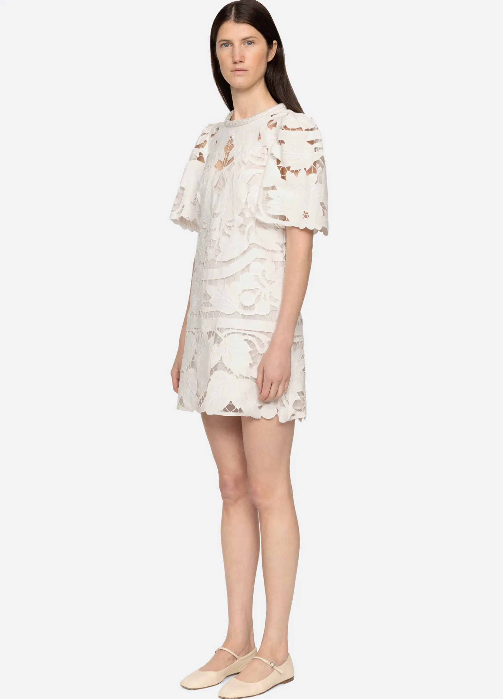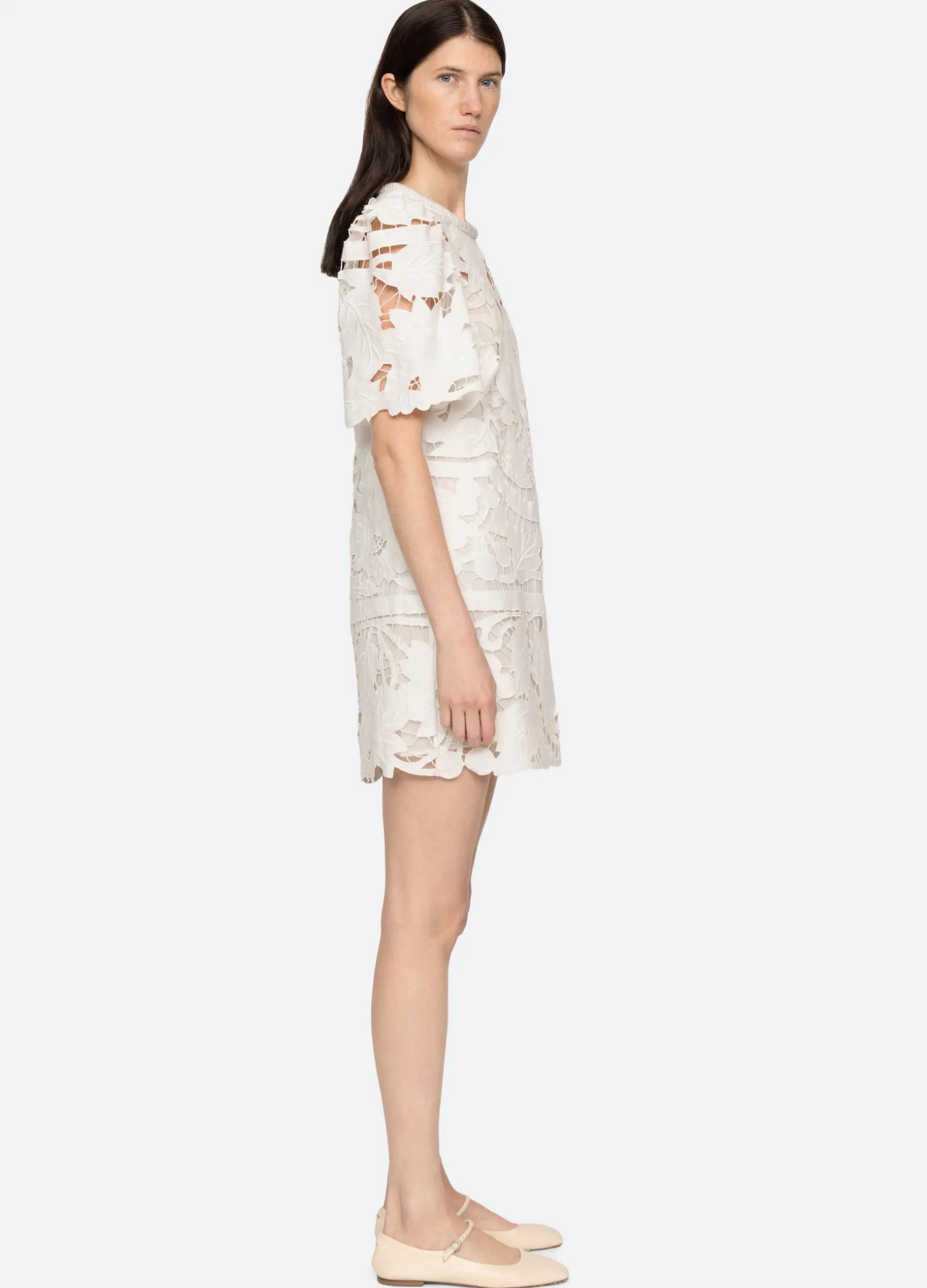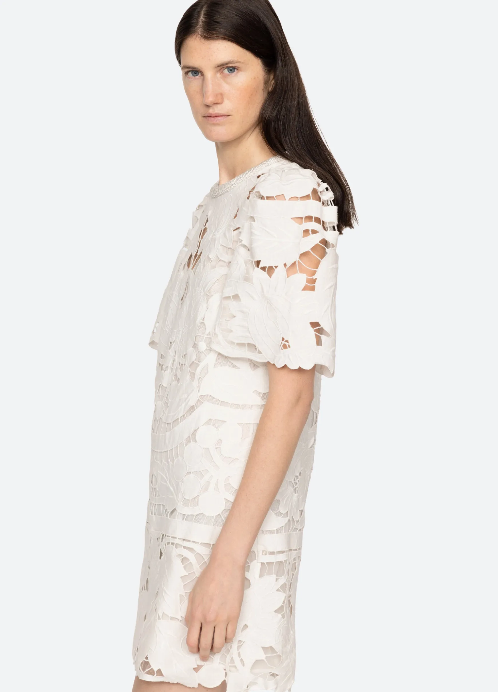The Edith short sleeve dress features oversized embroidered detailing withcutout accents.