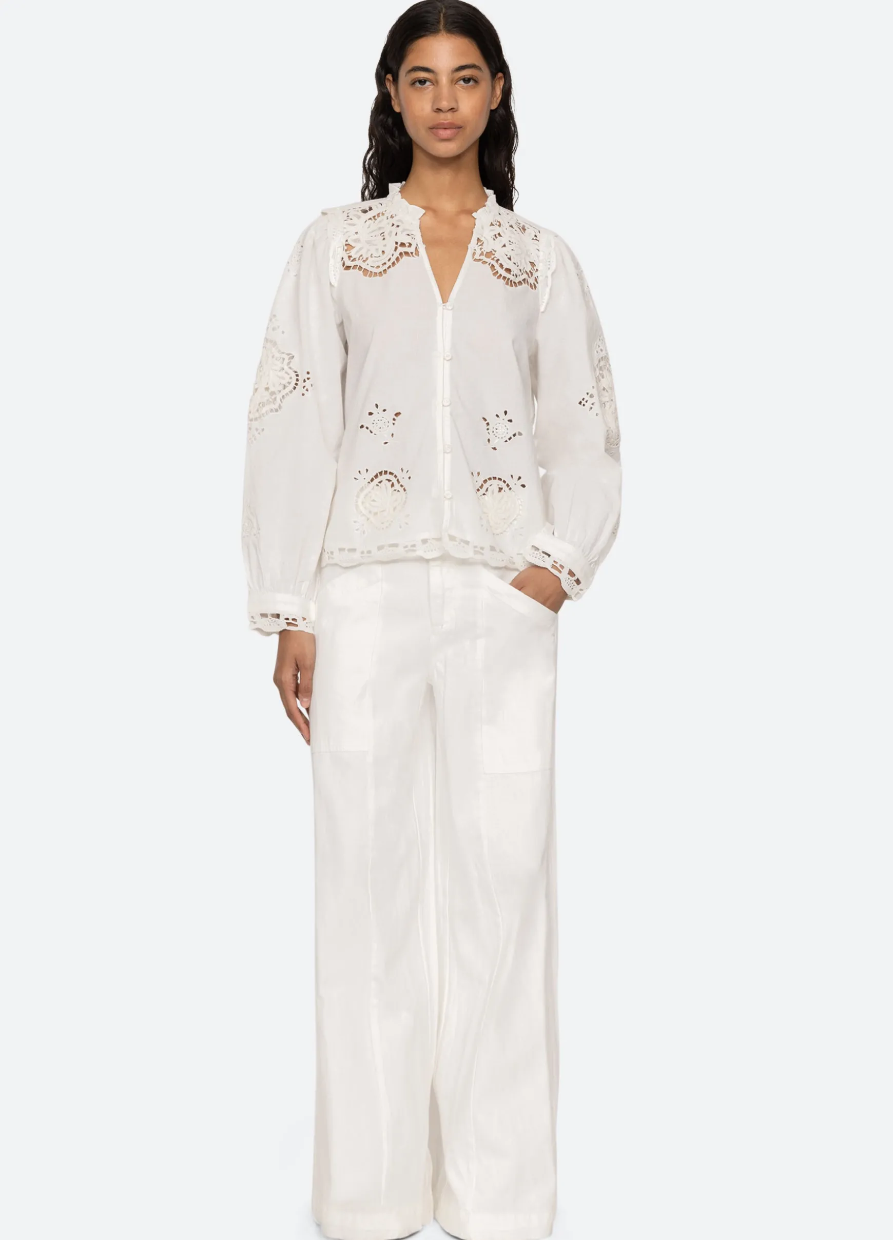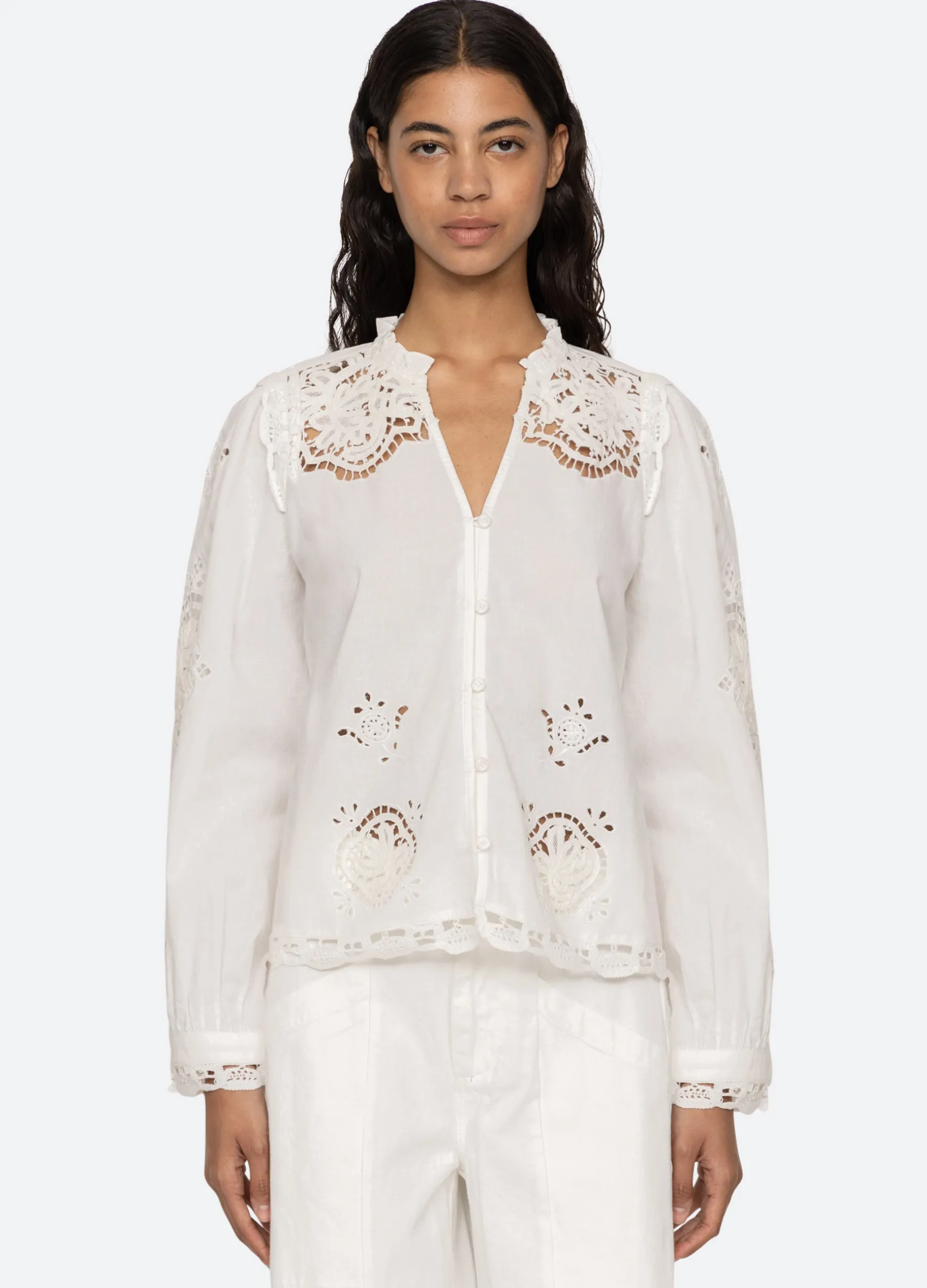 The Edith long sleeve top features a V-neckline, ruffle trim, and embroidered detailing throughout.Designed for an easy, relaxed fit.