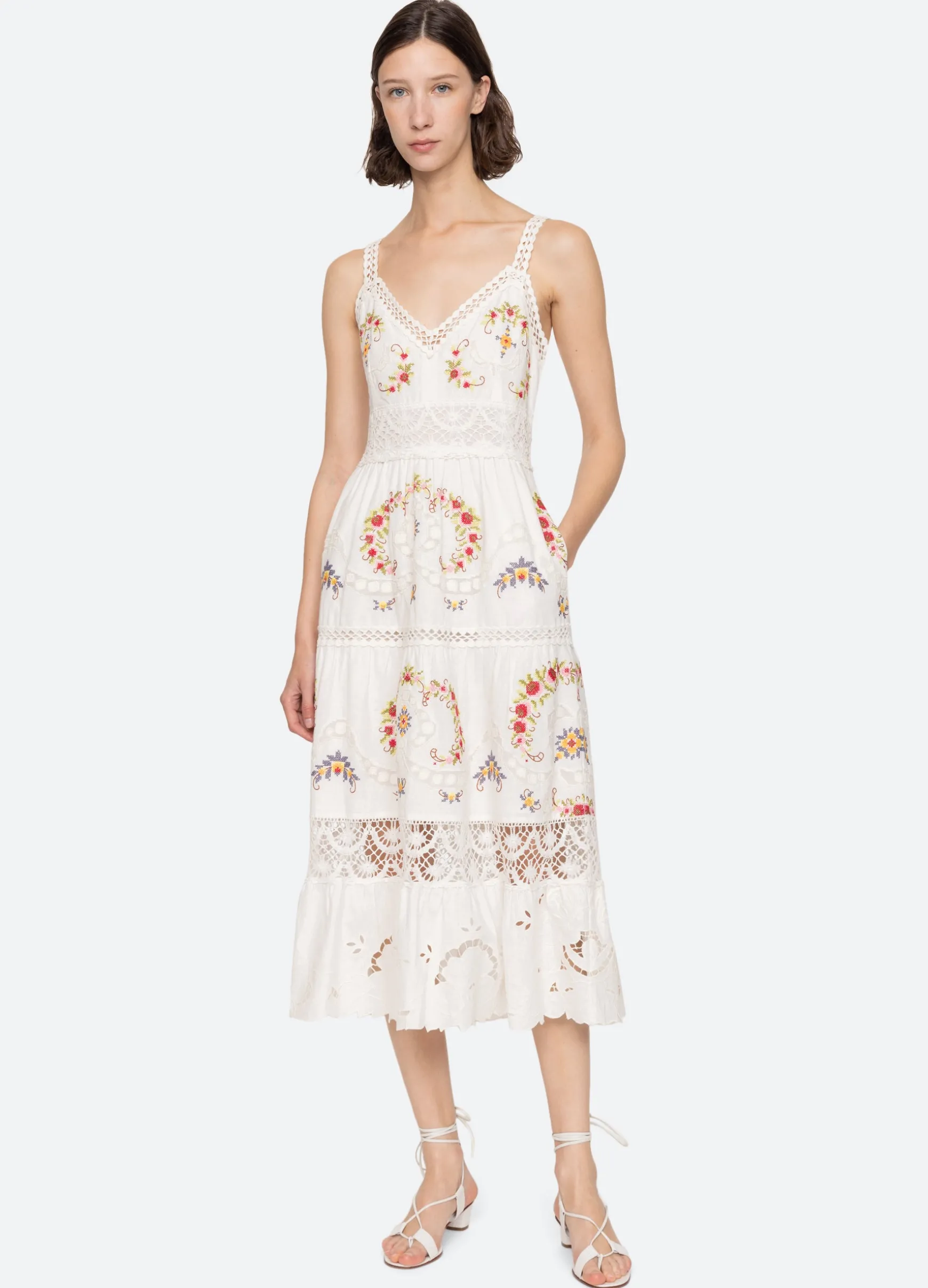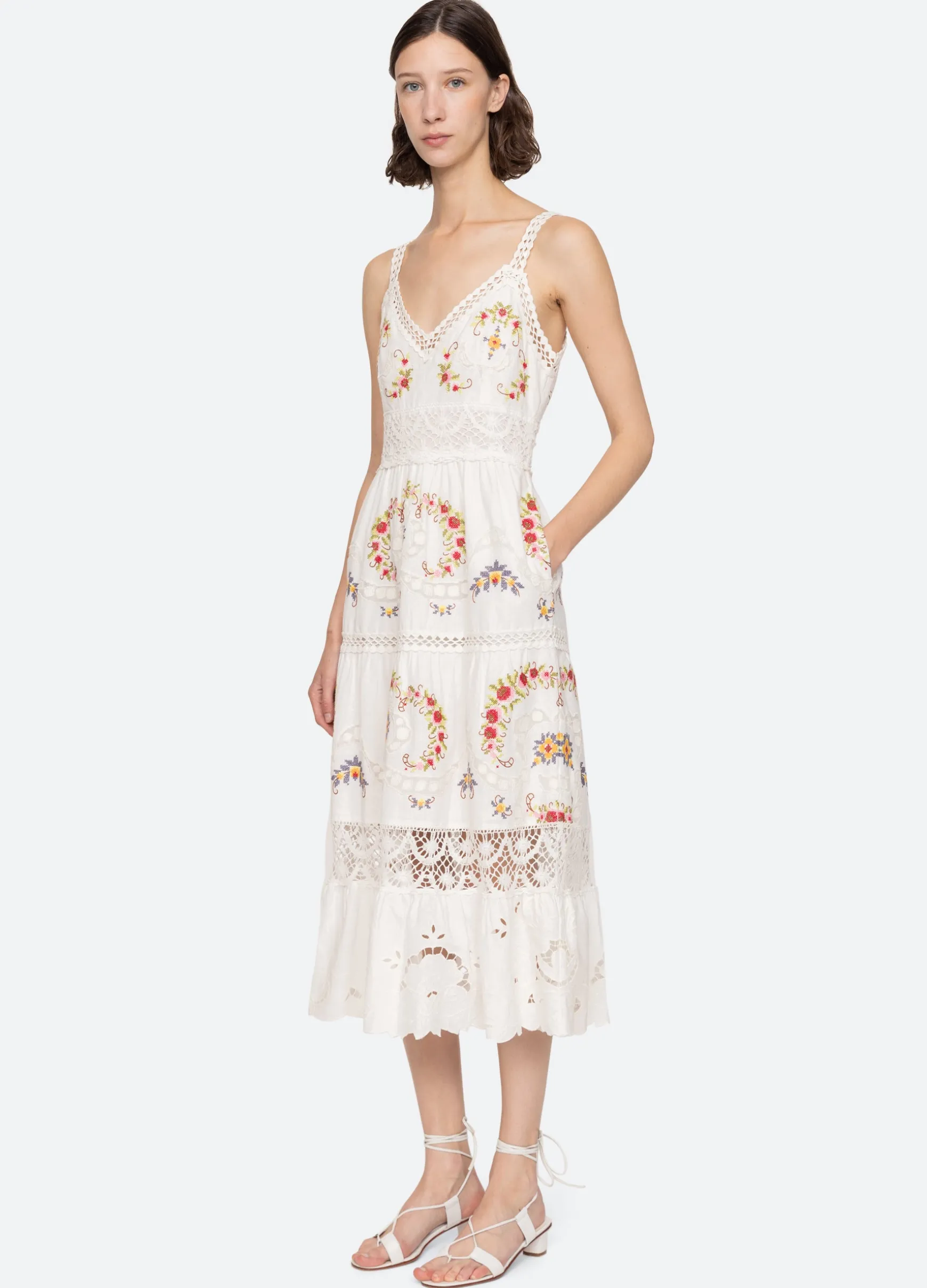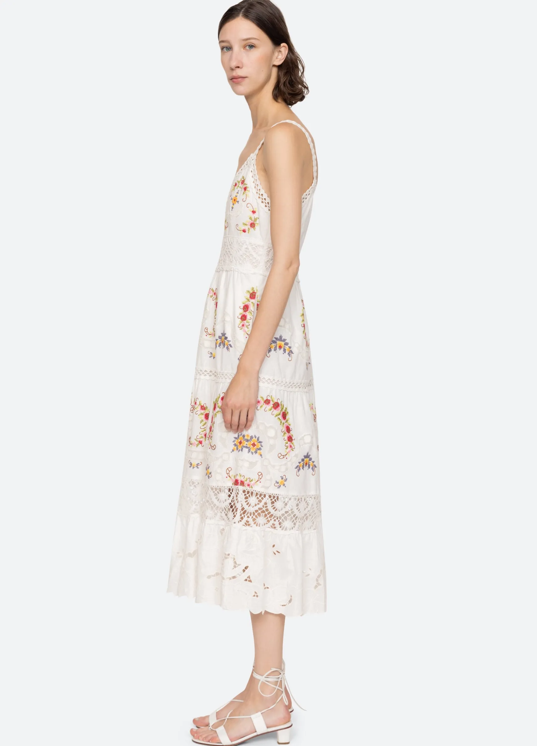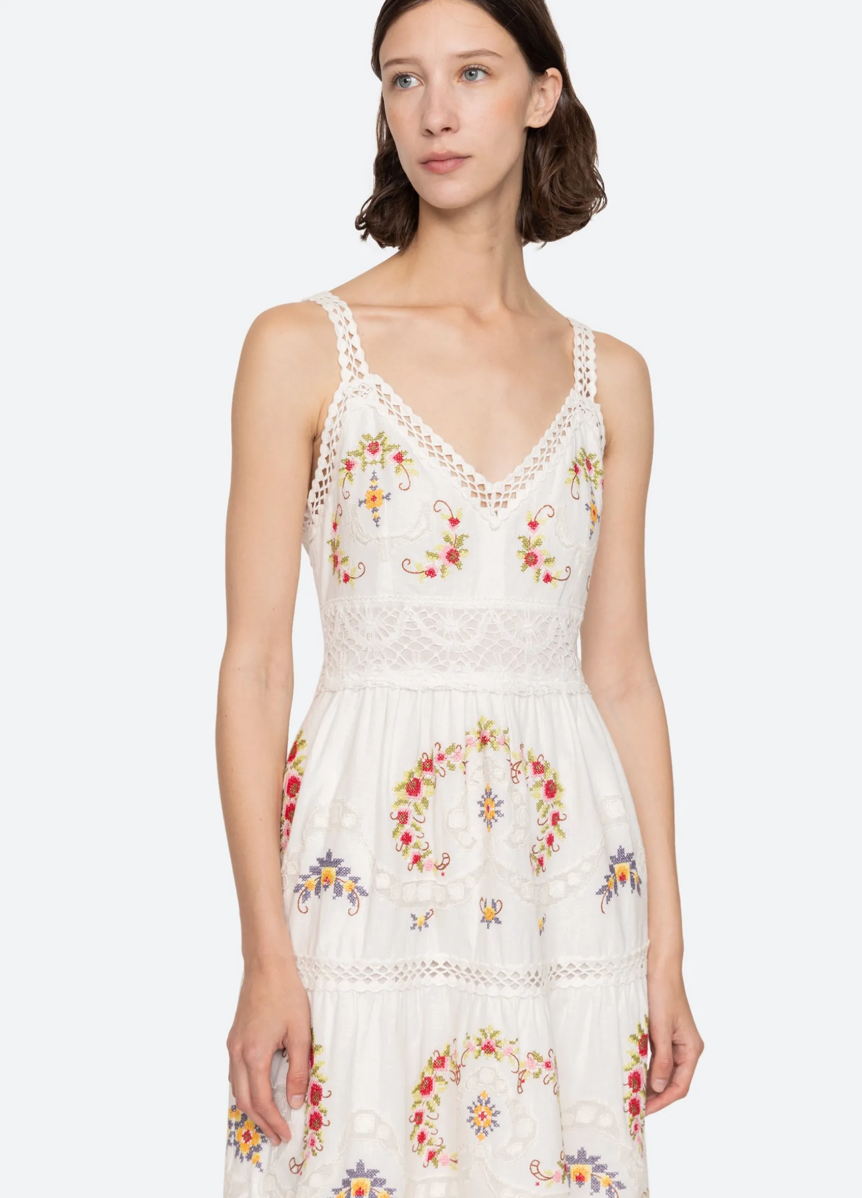 The Edwinadressfeaturescross stitch embroidery throughout and lace trim detailing.