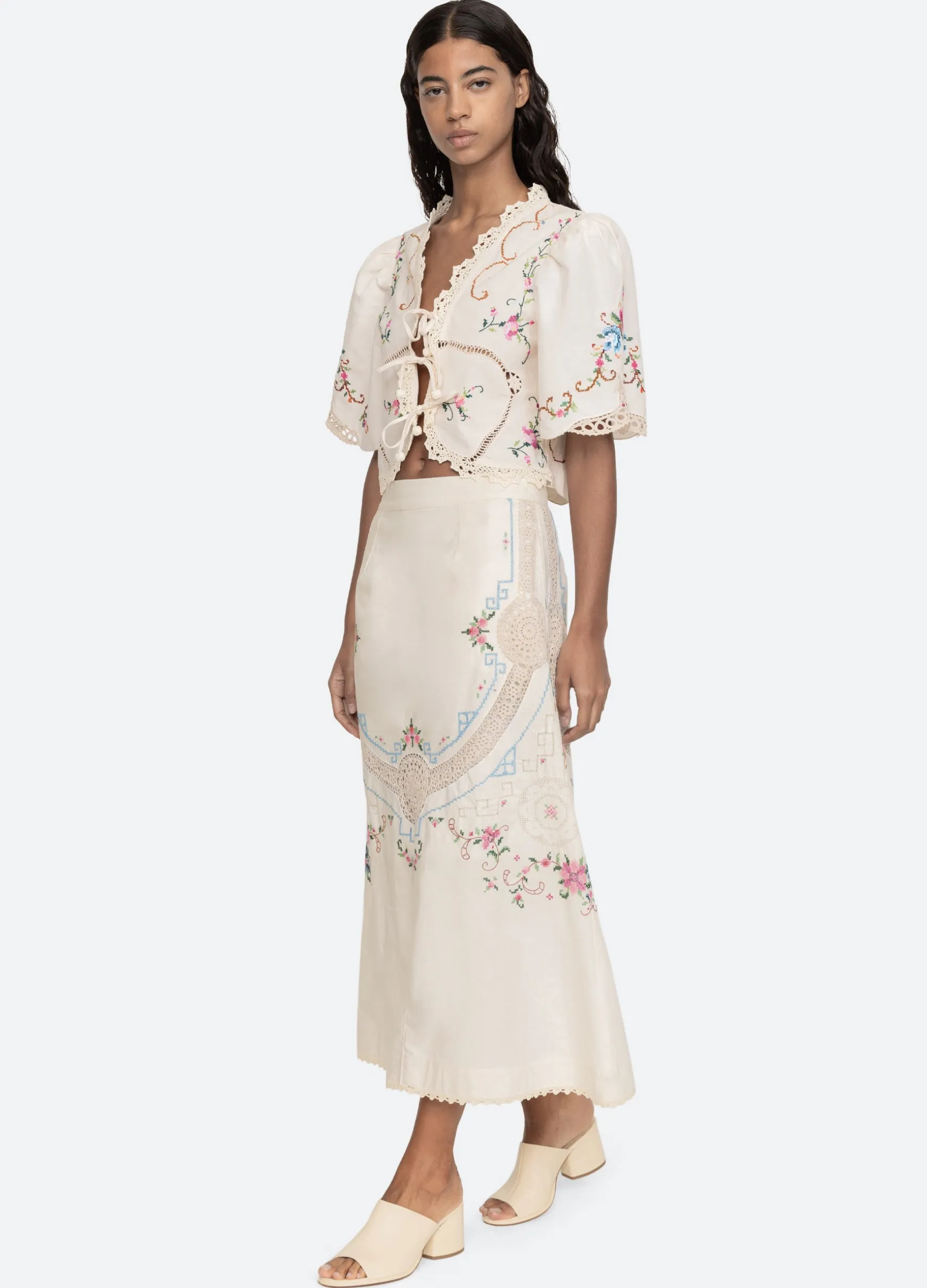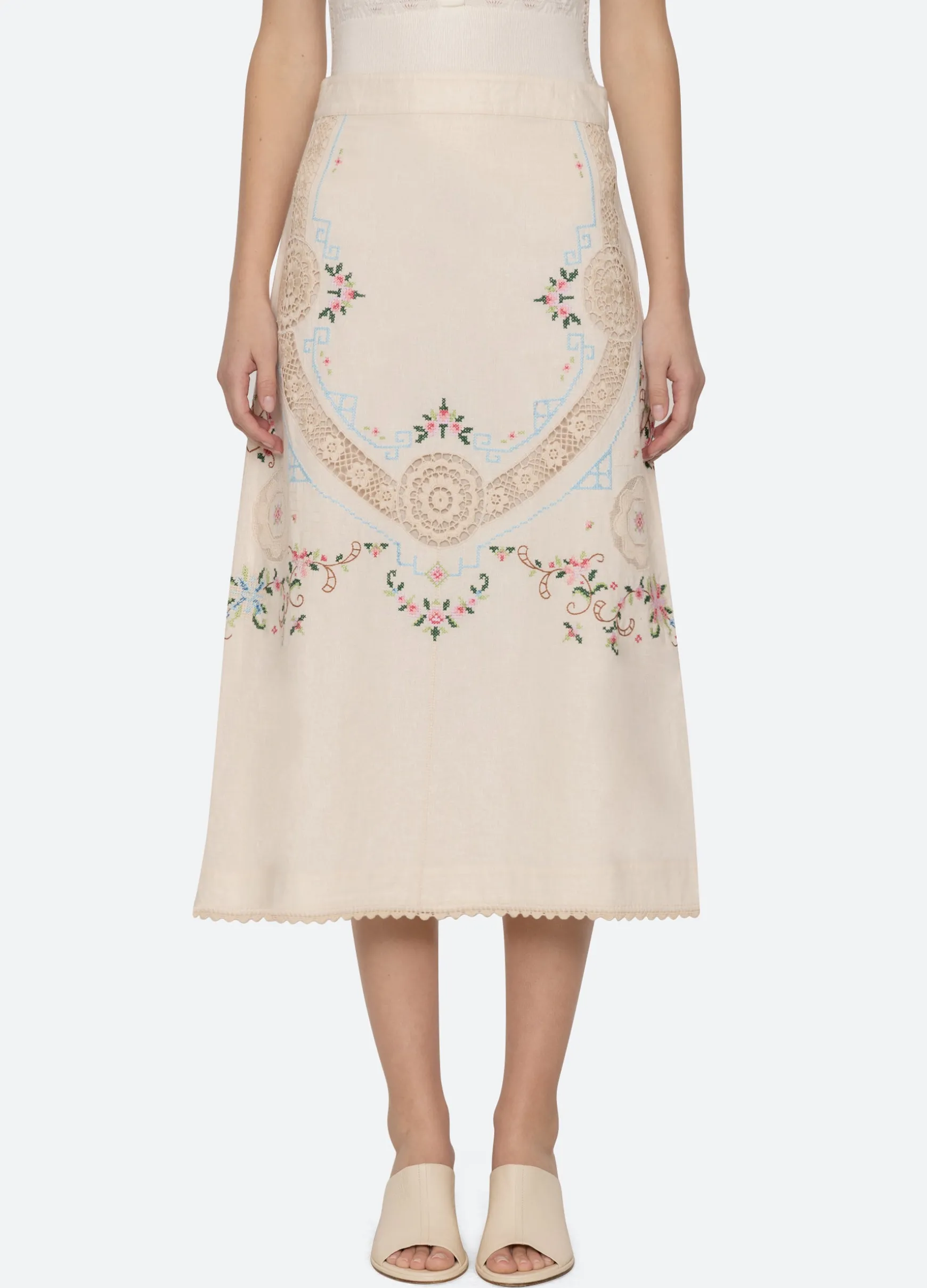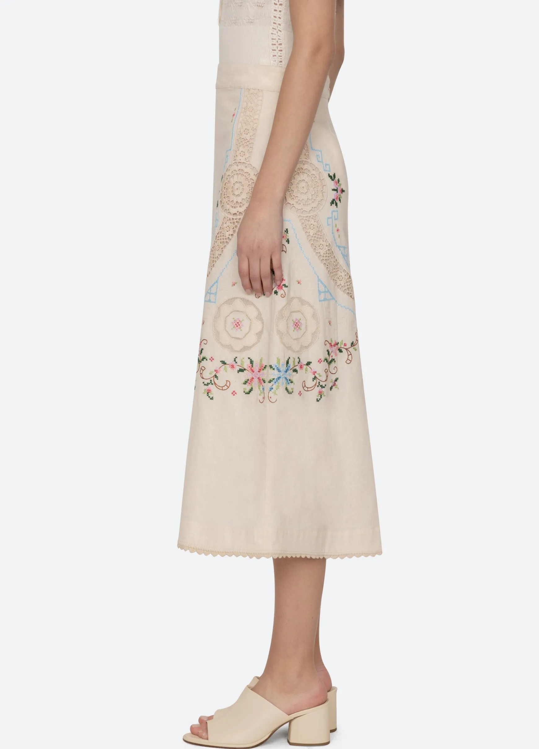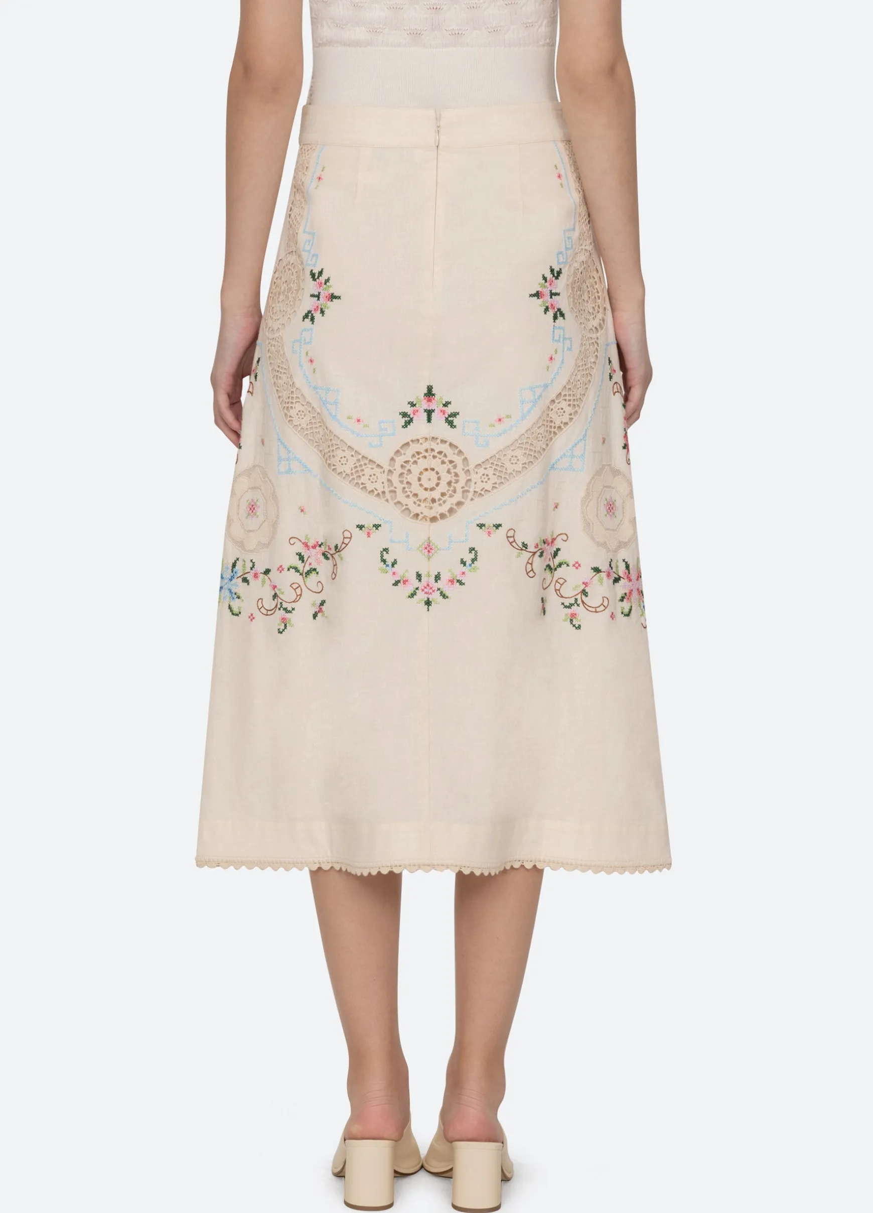 The Edwinaskirtfeaturescross stitch embroidery throughout andcrochet trim detailing.