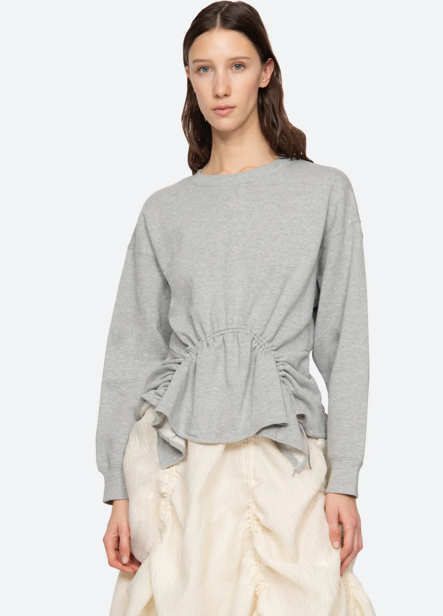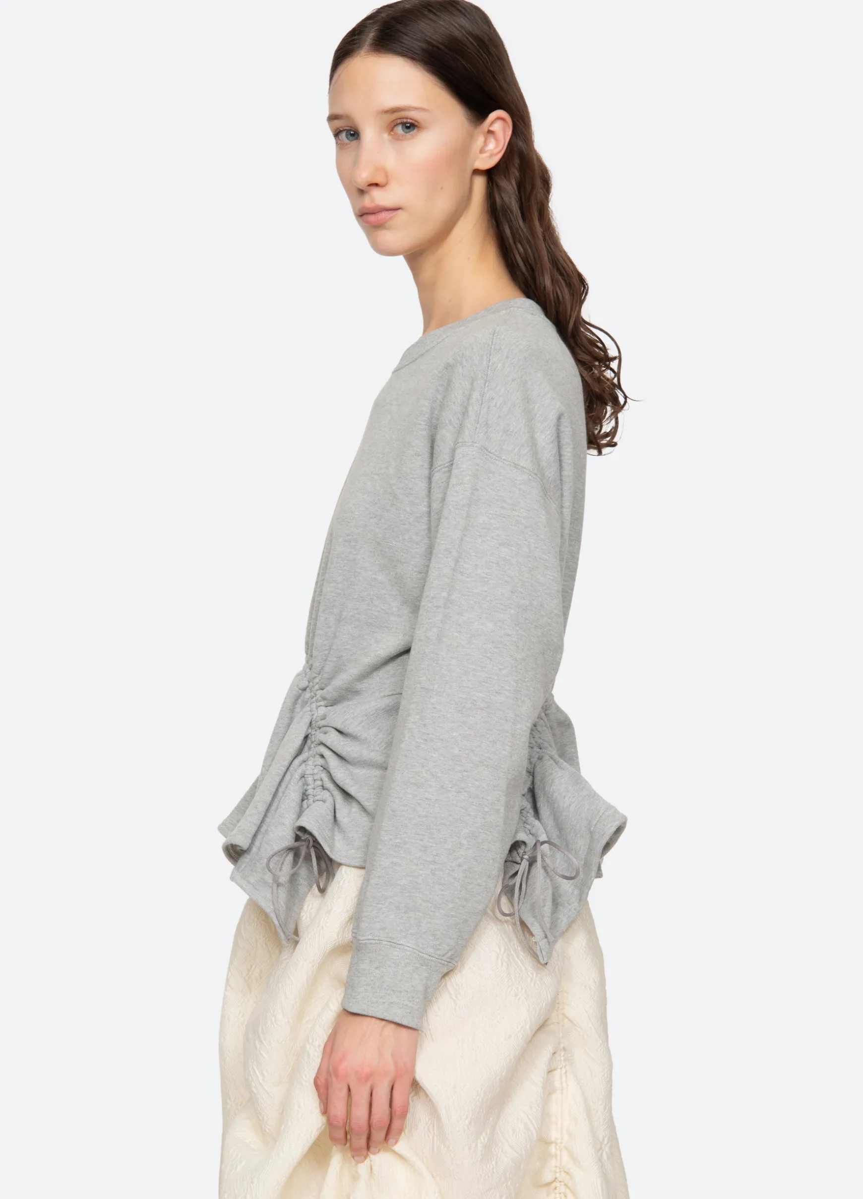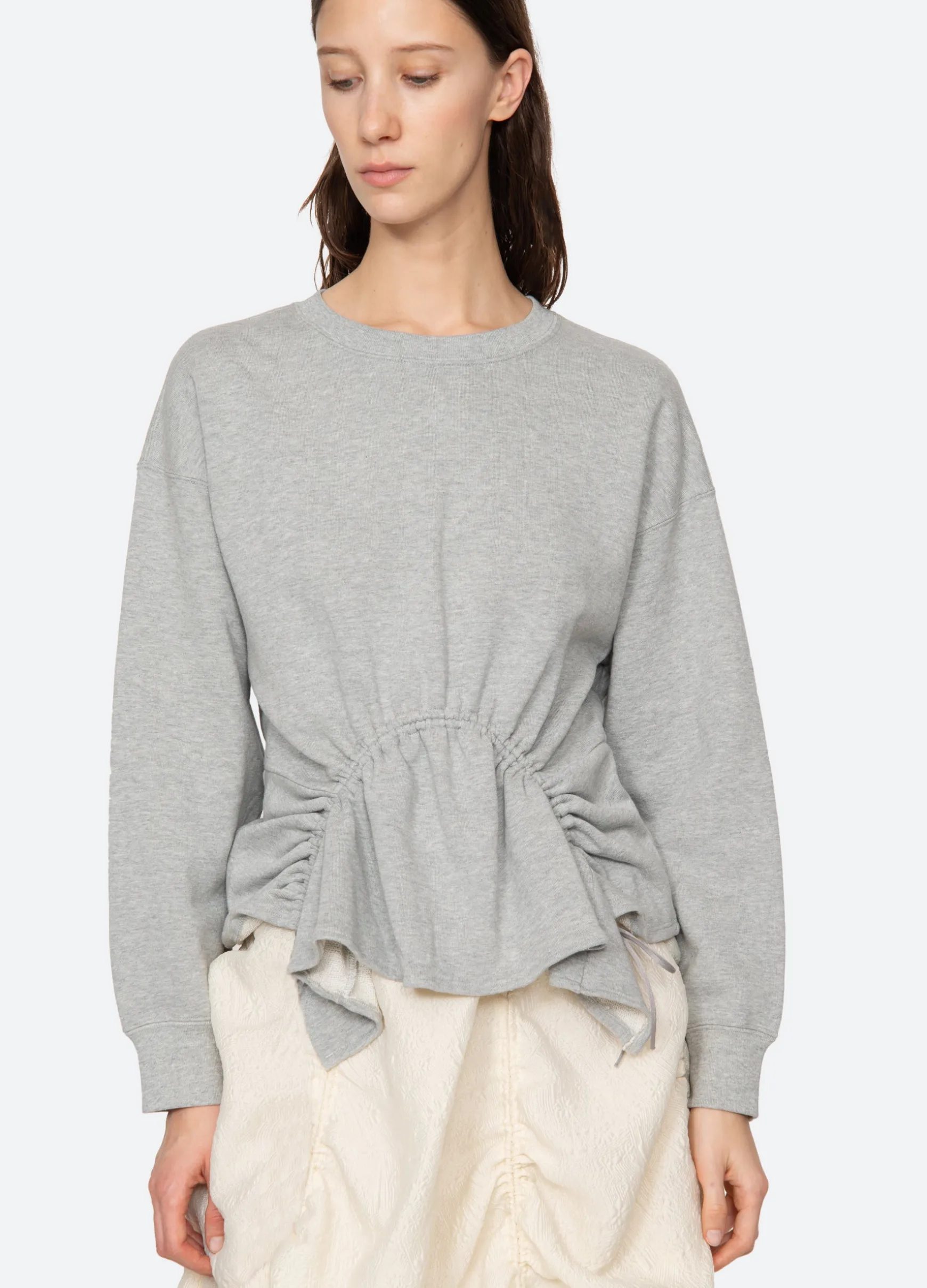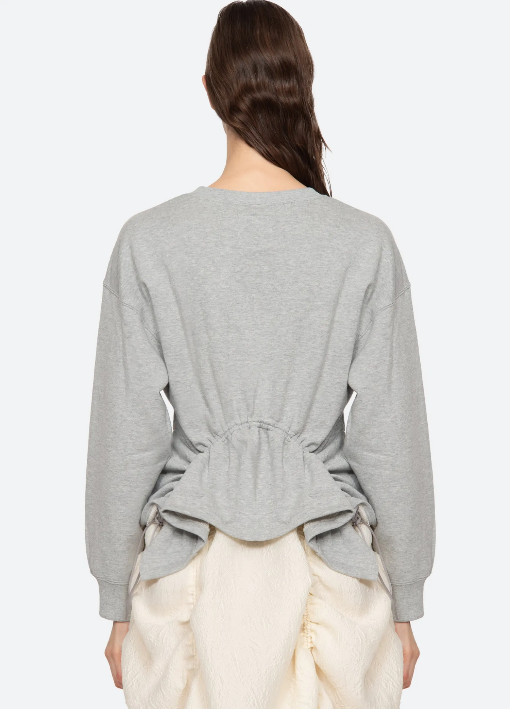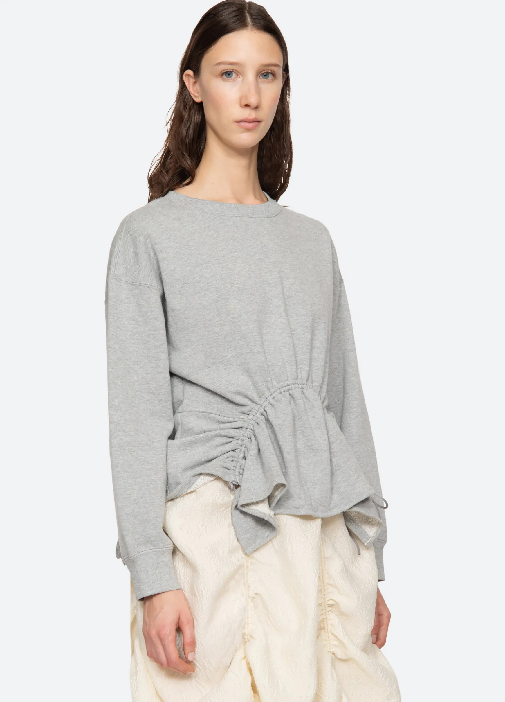 The Elegi sweatshirt features features an asymmetrical hem with adjustable drawstring cords.