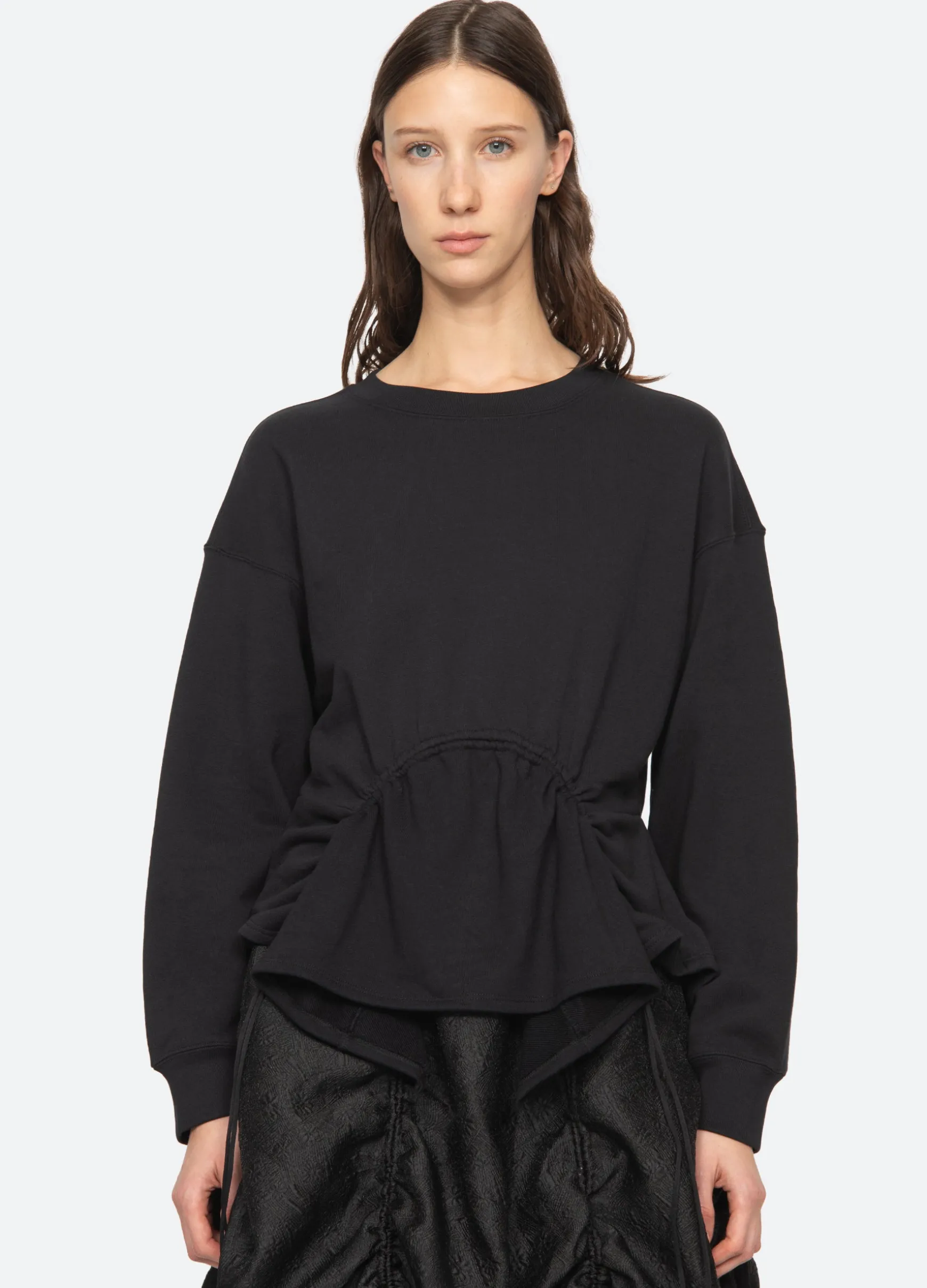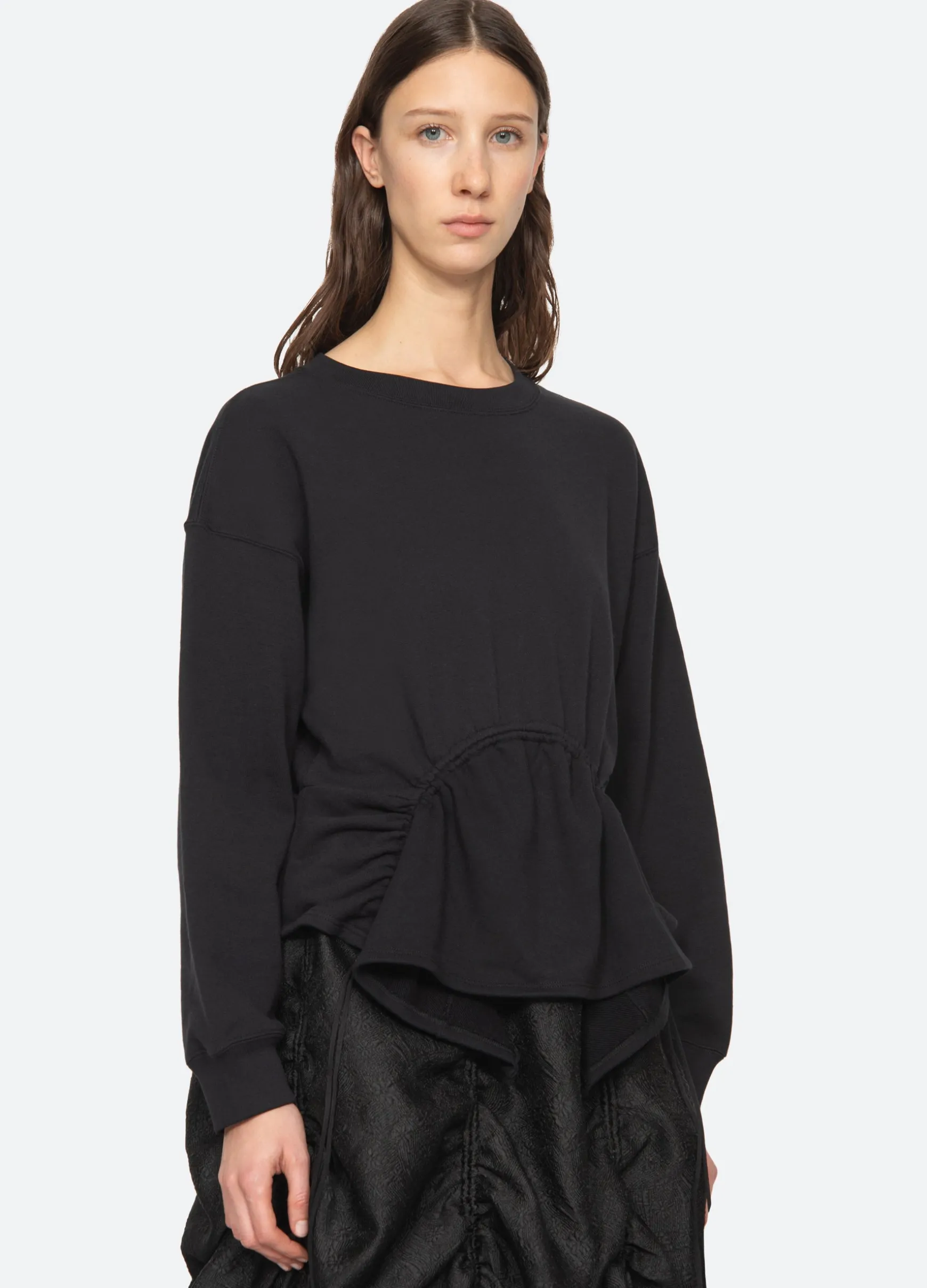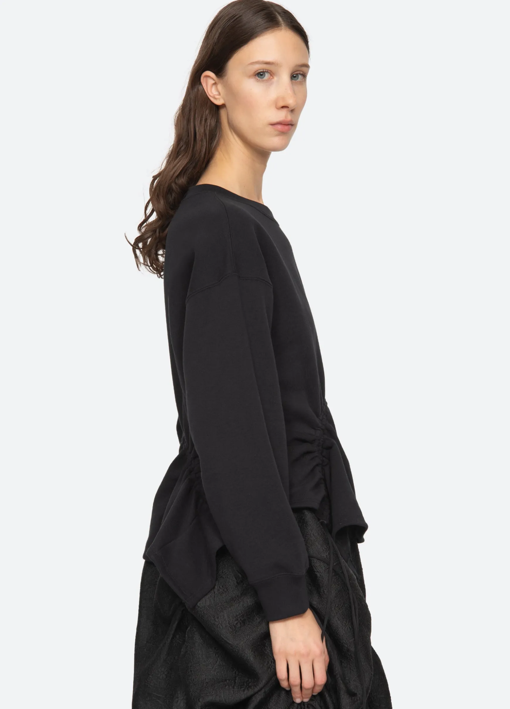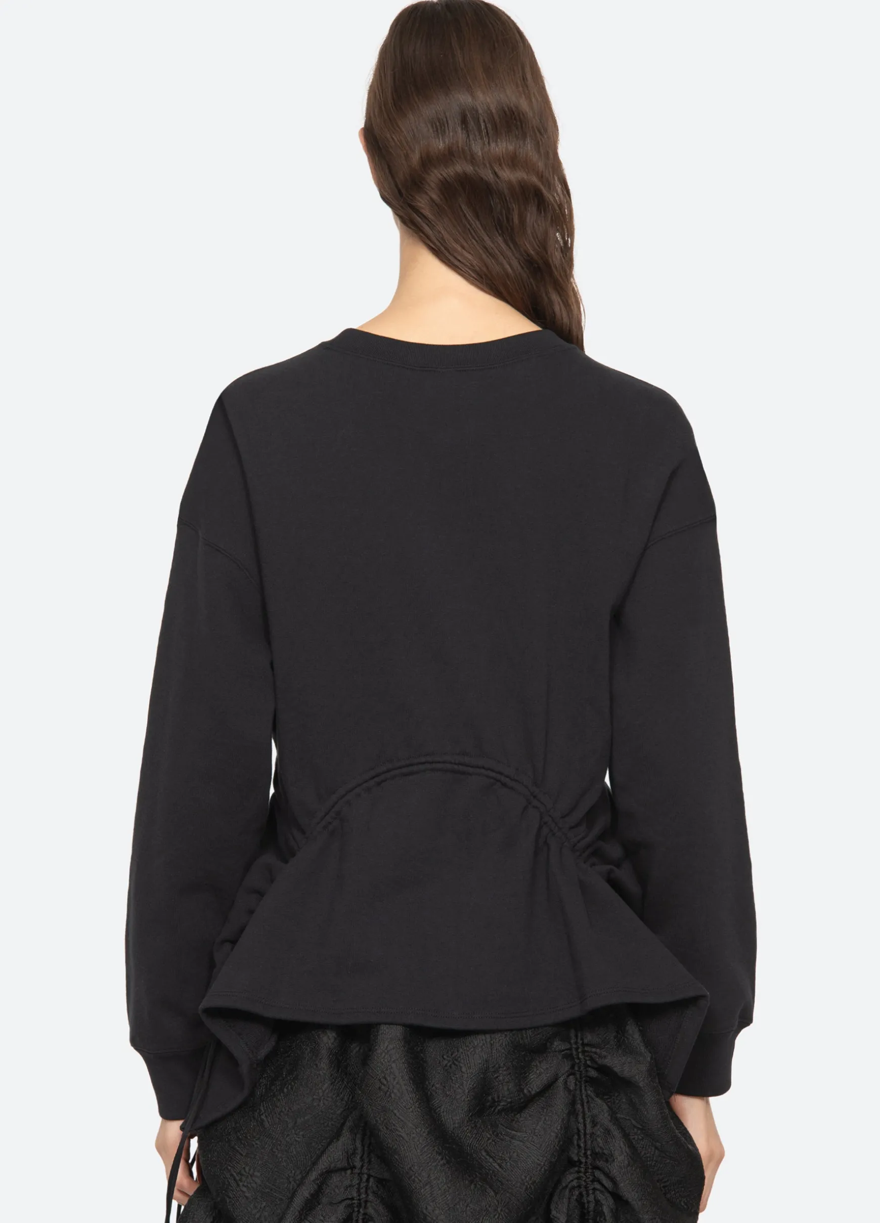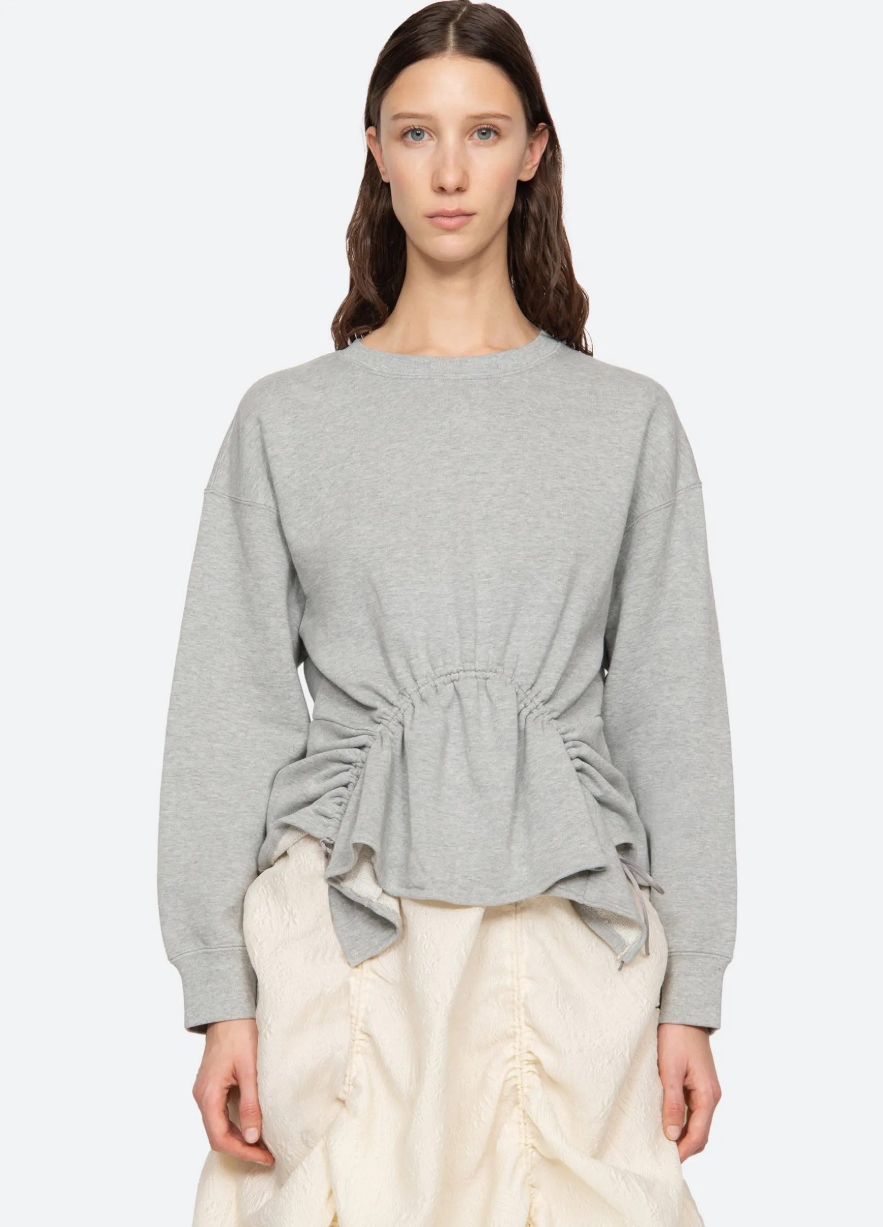The Elegi sweatshirt features features an asymmetrical hem with adjustable drawstring cords.