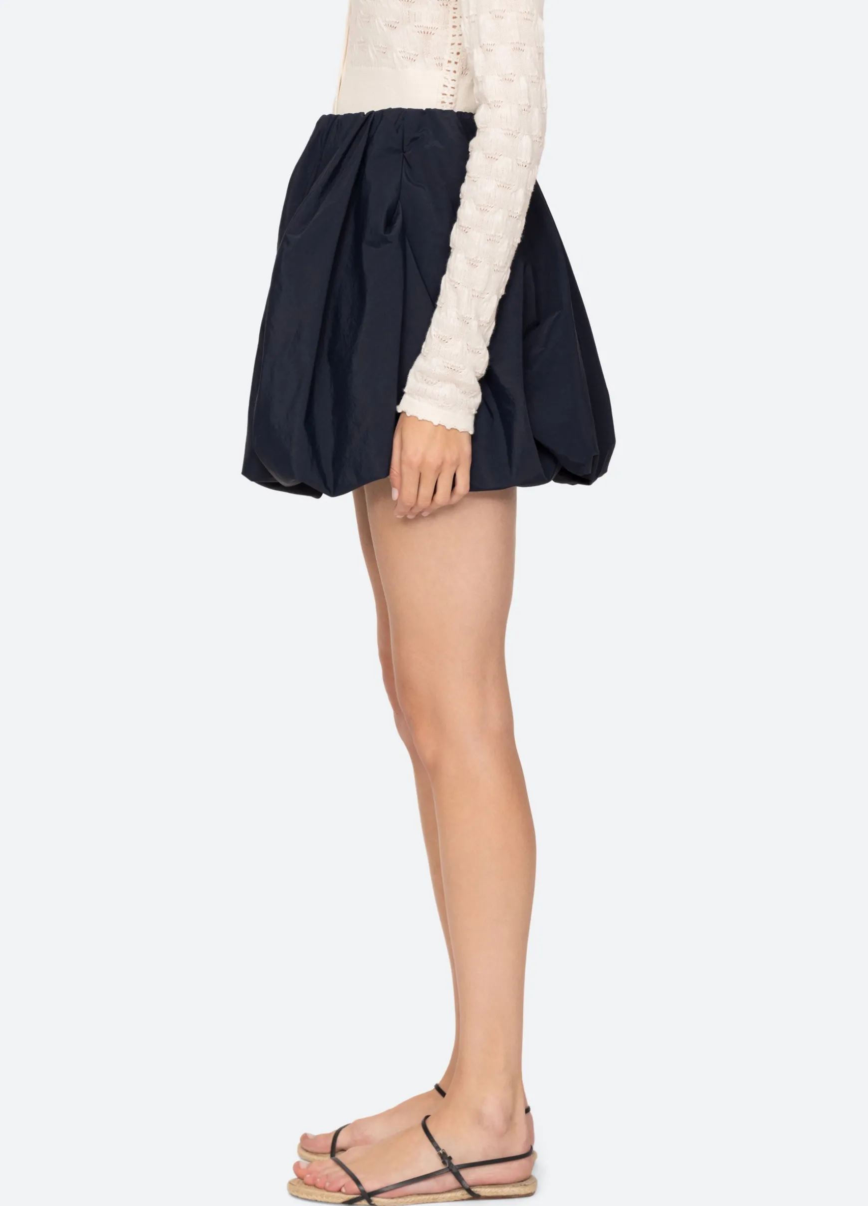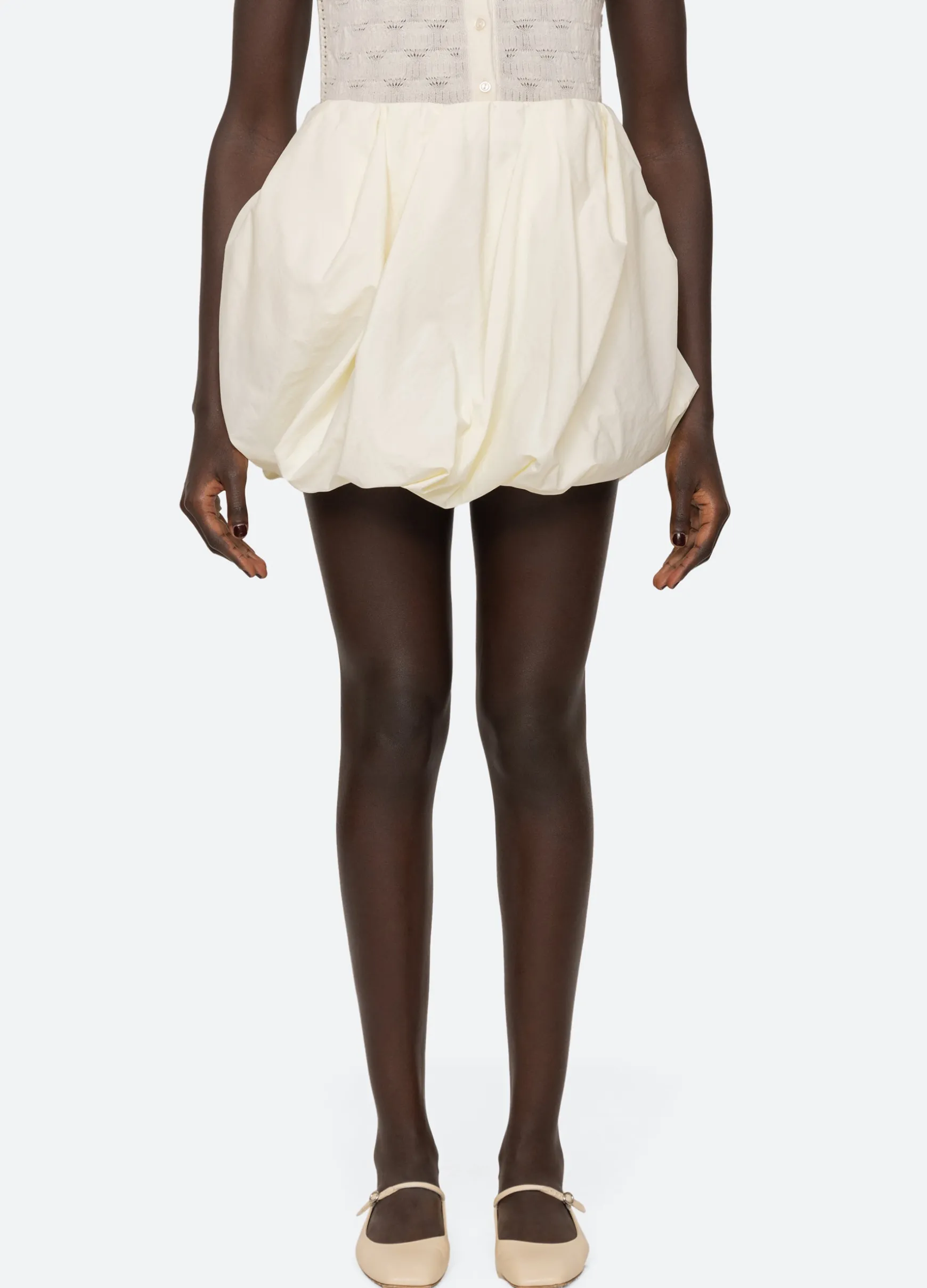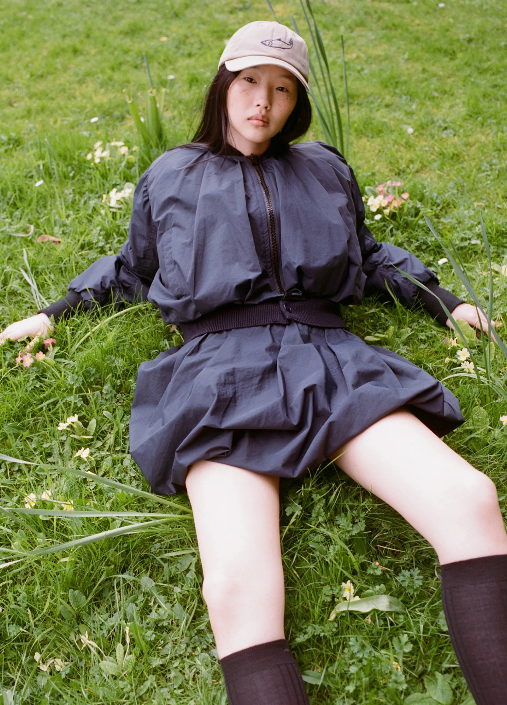 The Evelyn windbreaker mini skirt features avoluminous bubble hem.