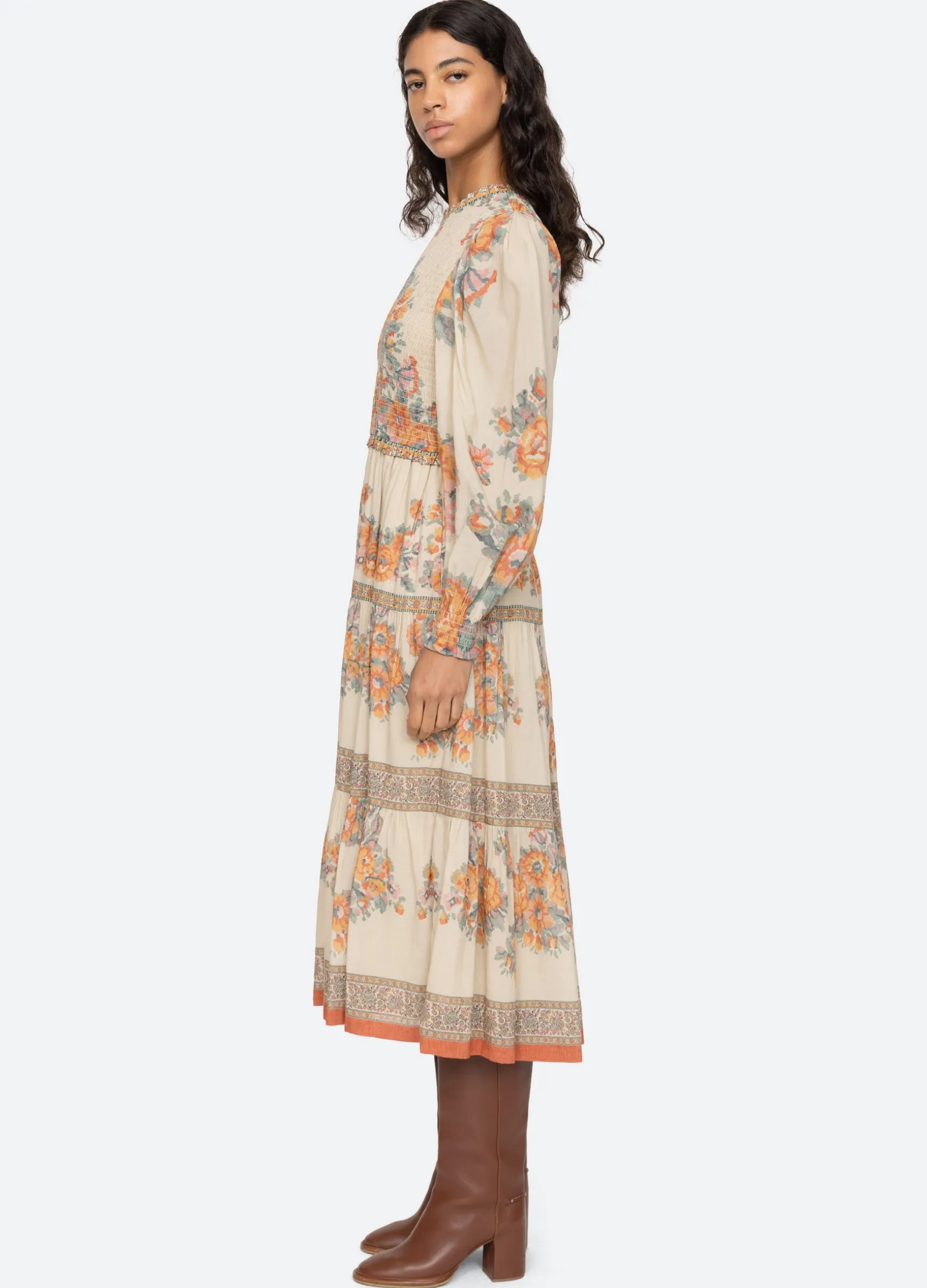 The Fiorella floral border print dress features a smocked bodice and voluminous long puff sleeves.
