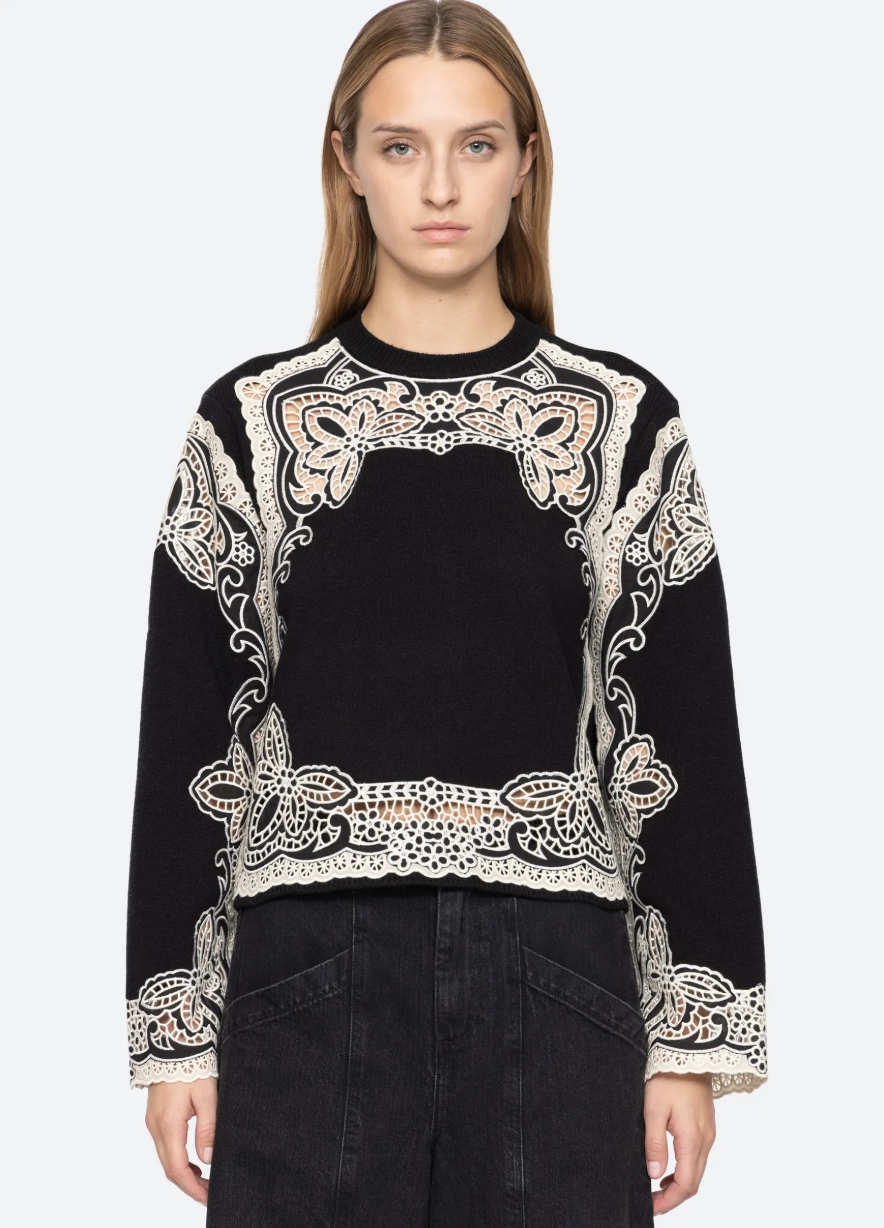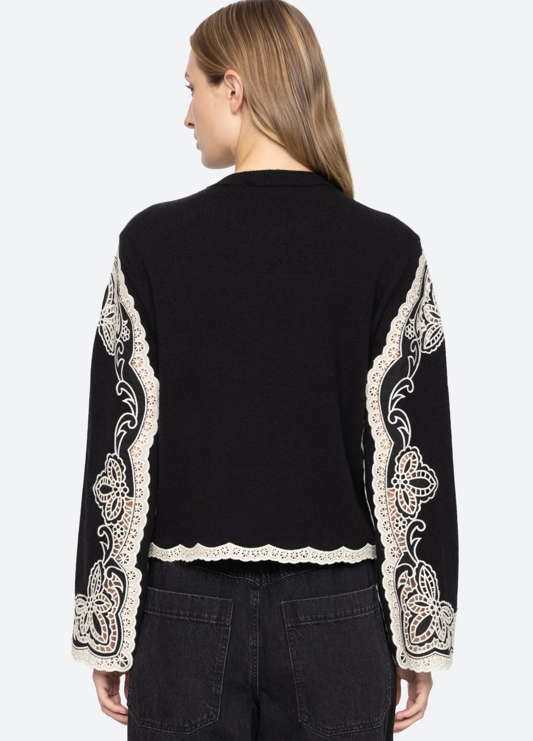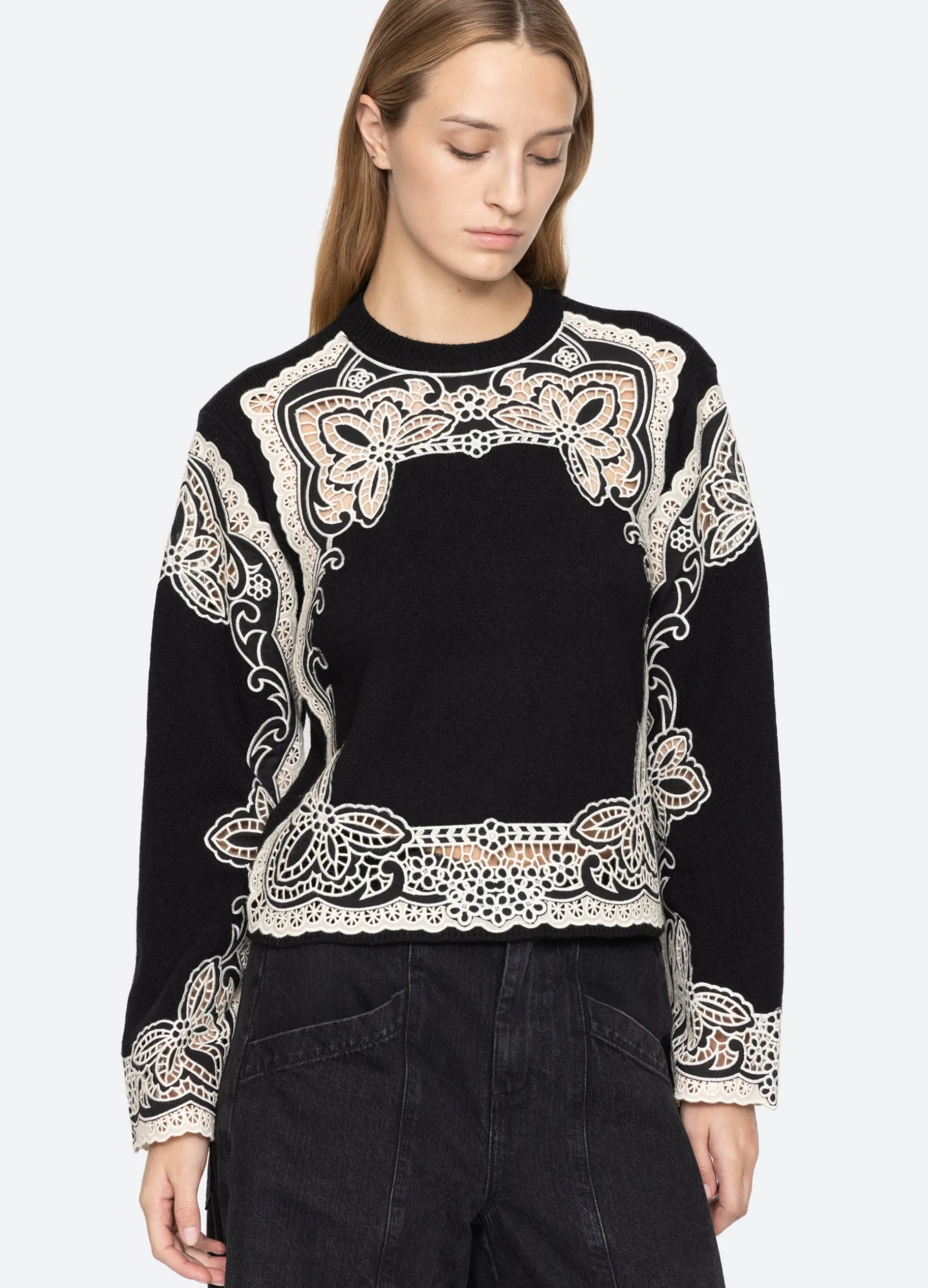 The Gianna knit combo sweaterfeatures embroidery and applique detailing throughout.