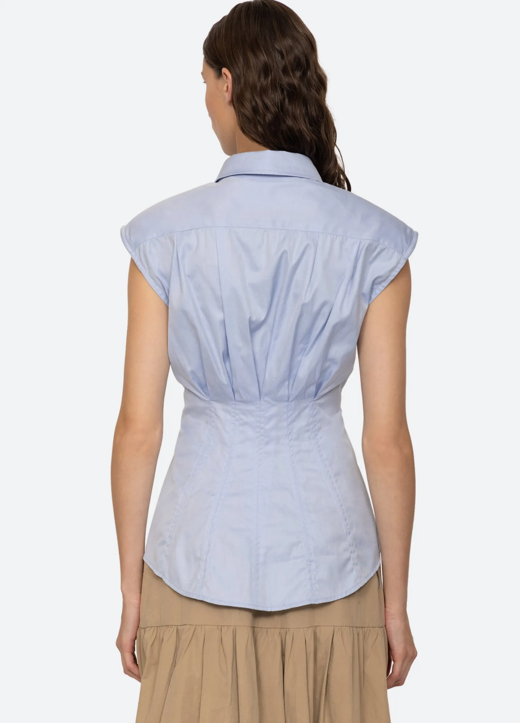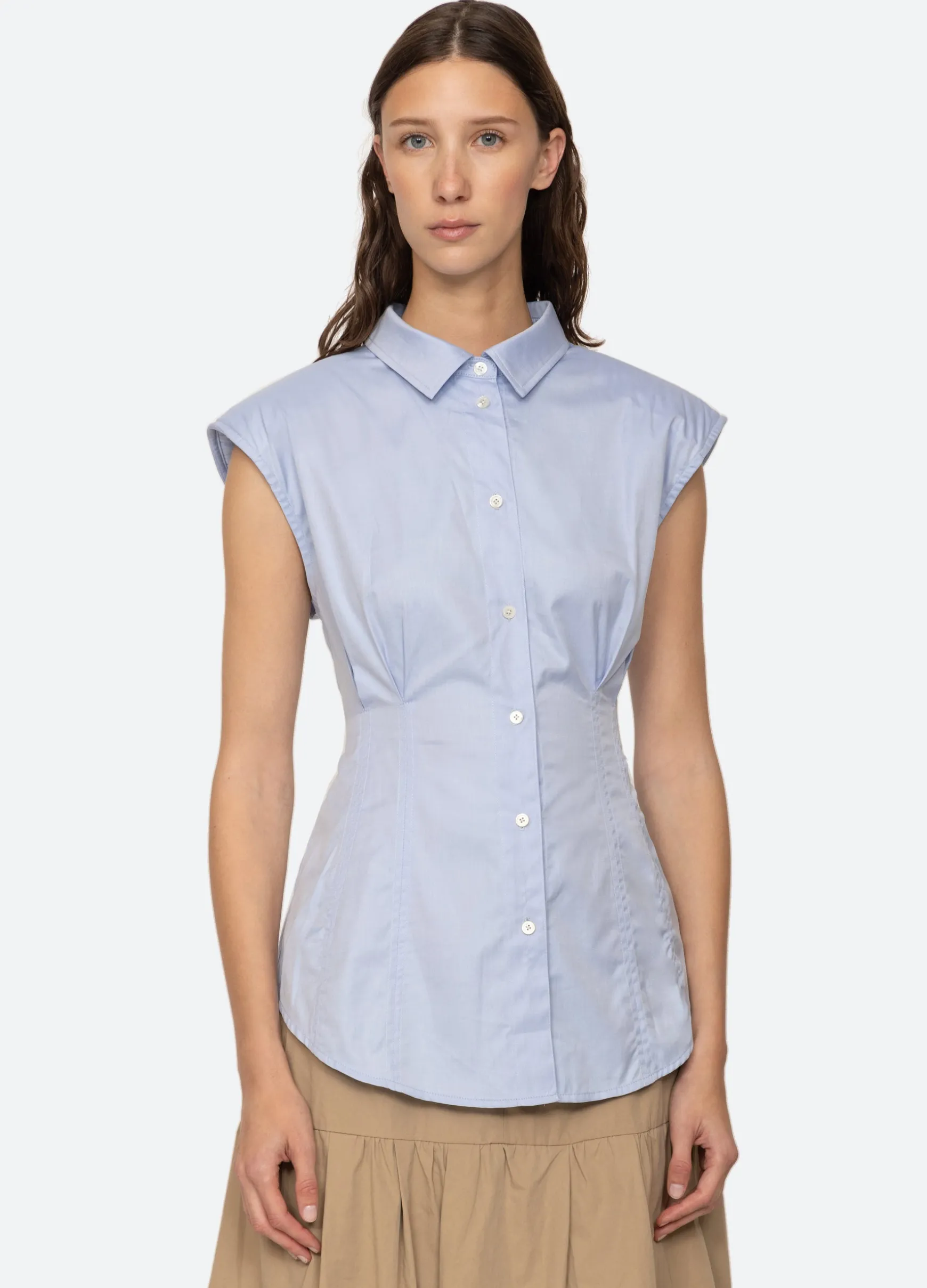 The Kendra sleeveless button down top featuresshoulder pads and is designed for a slim fit.