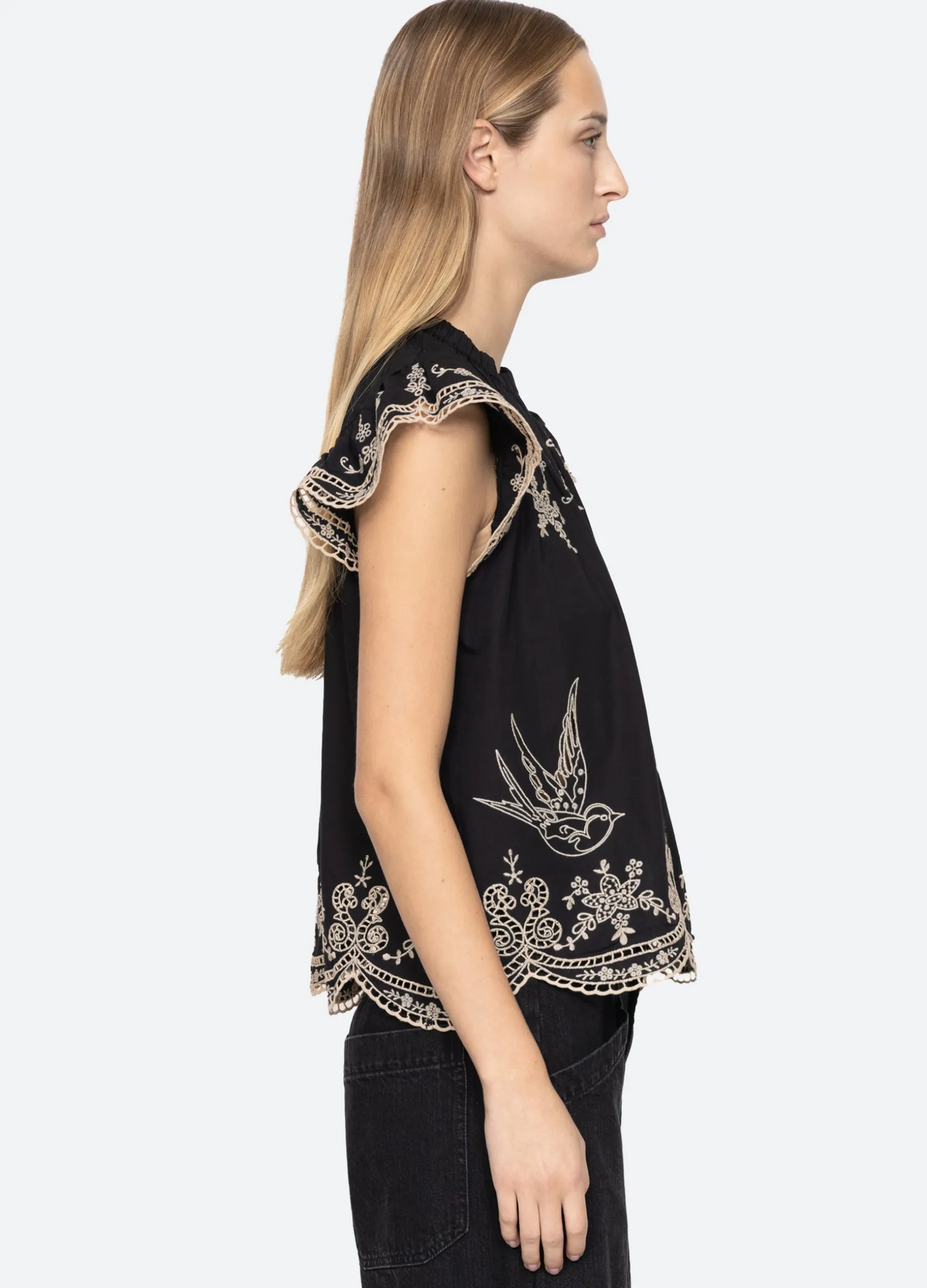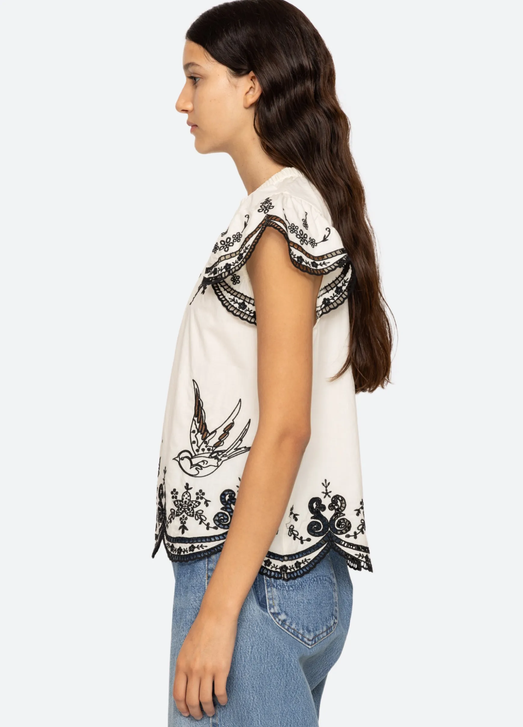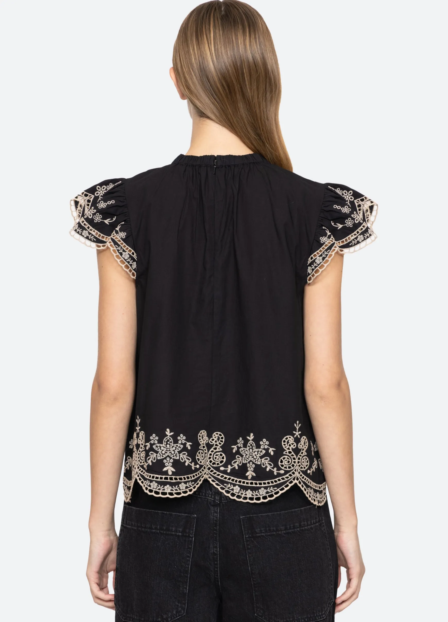 The Kingsley embroidered tank features flutter sleeves, scalloped hem and embroidered detailing throughout.