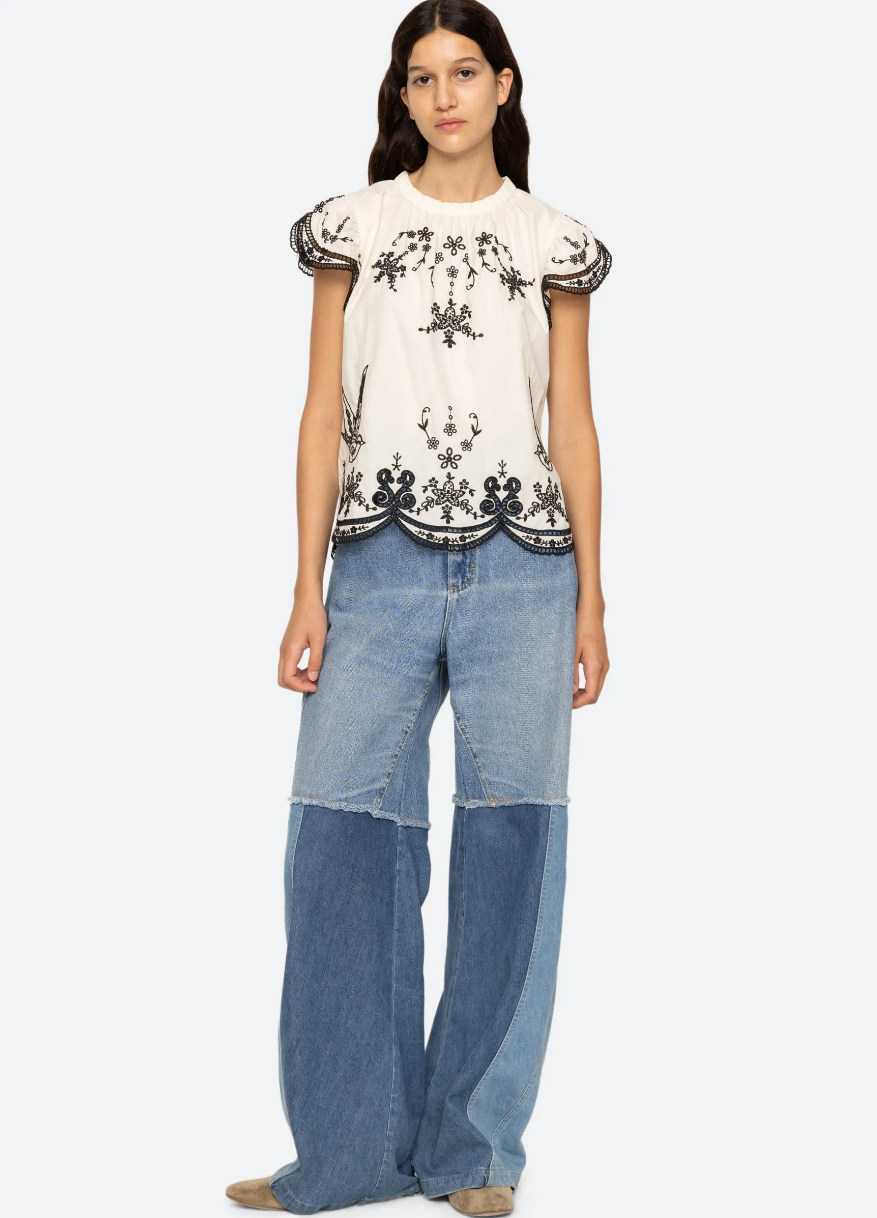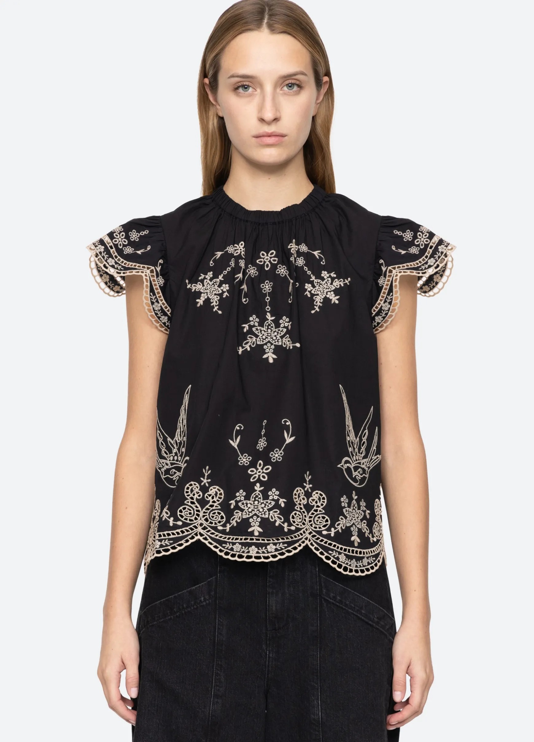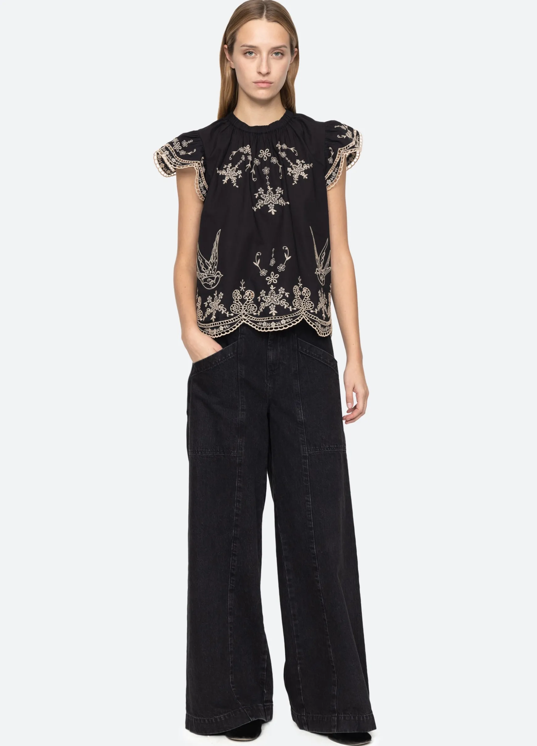 The Kingsley embroidered tank features flutter sleeves, scalloped hem and embroidered detailing throughout.