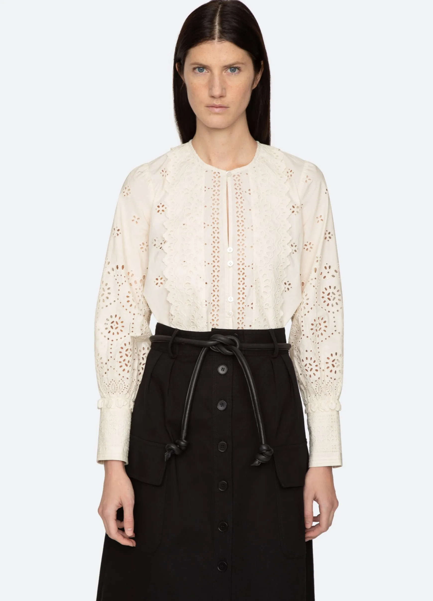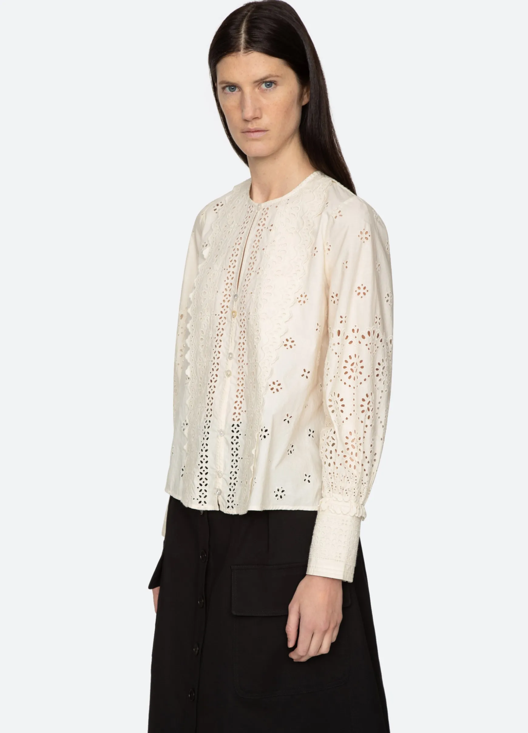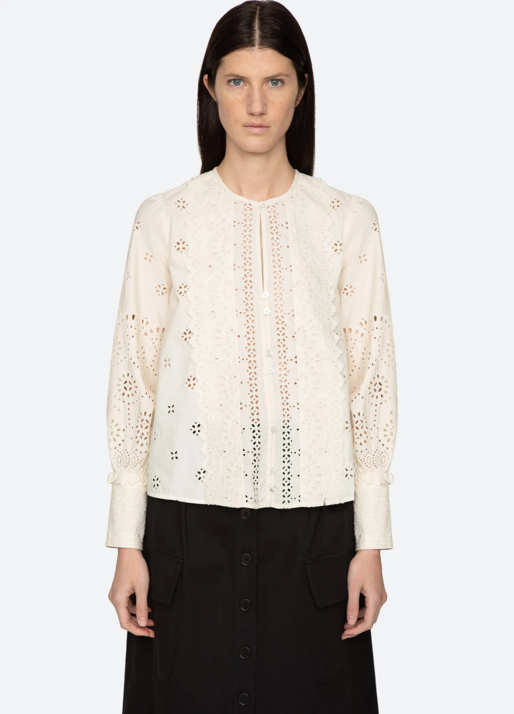The Lainey embroidered button down top features long sleeves and delicate eyelet embroidery throughout.