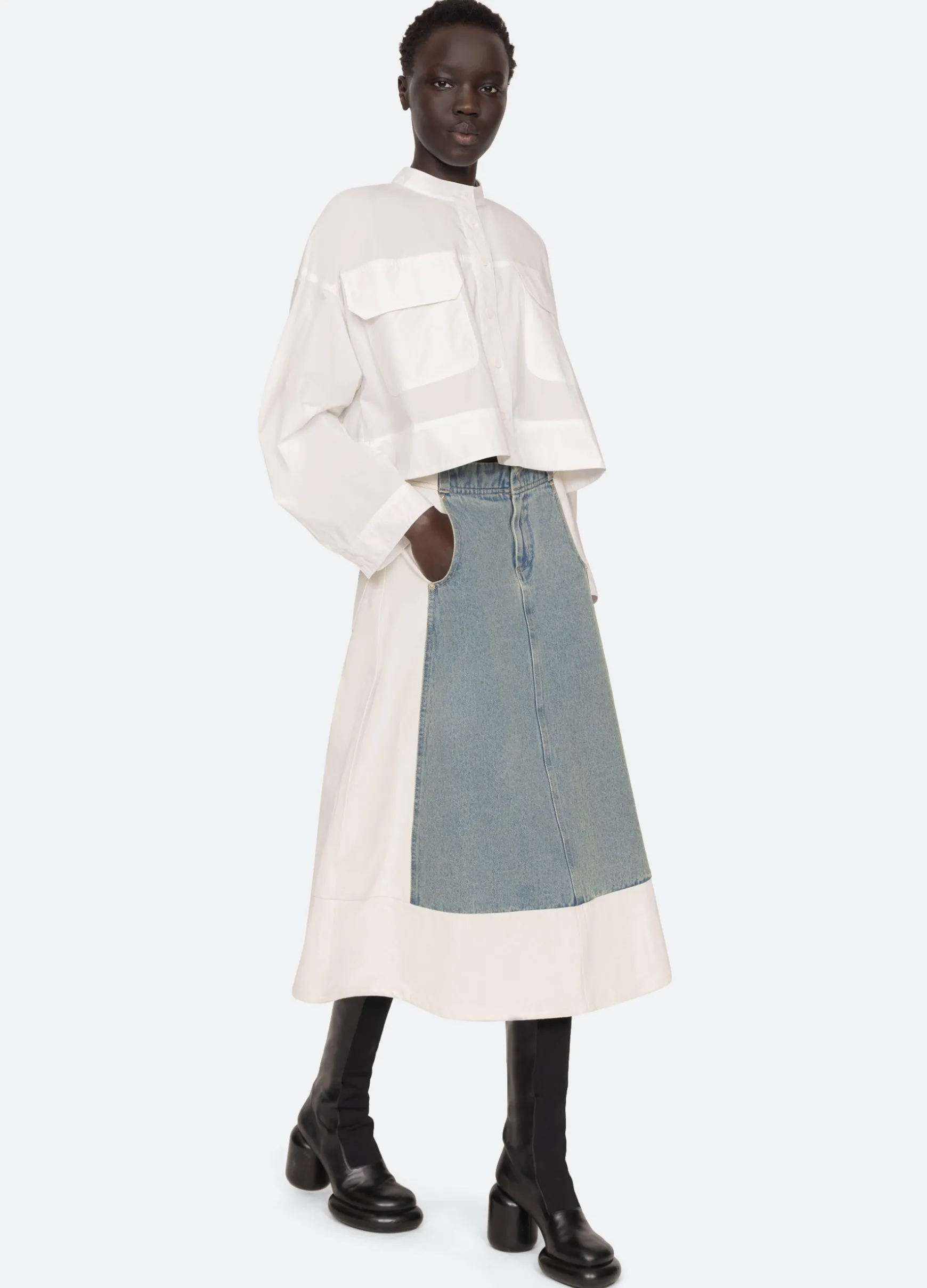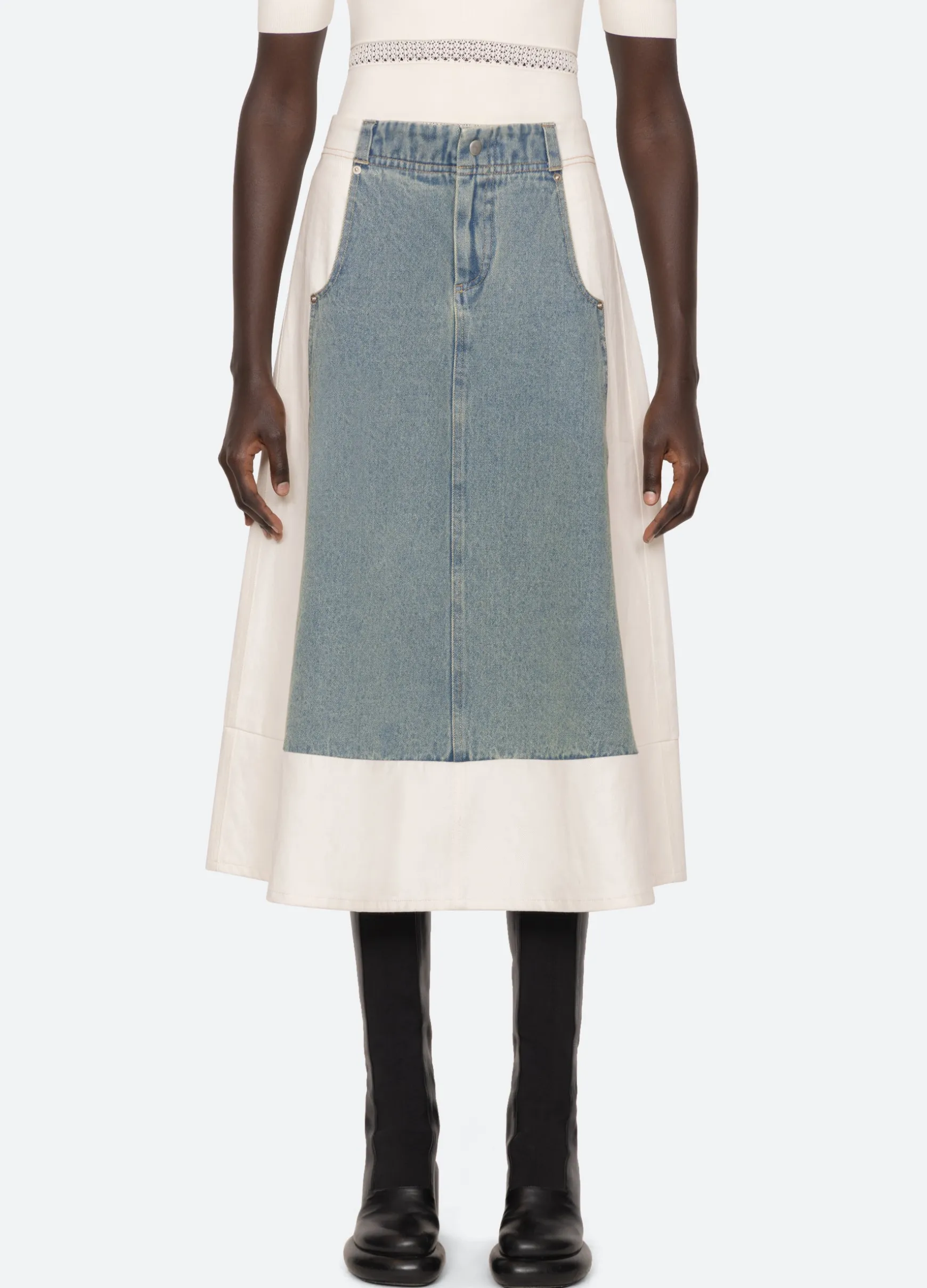 The Liam pieced denim skirt features contrasting two tone denim and embroidered ‘Sea’ logo.