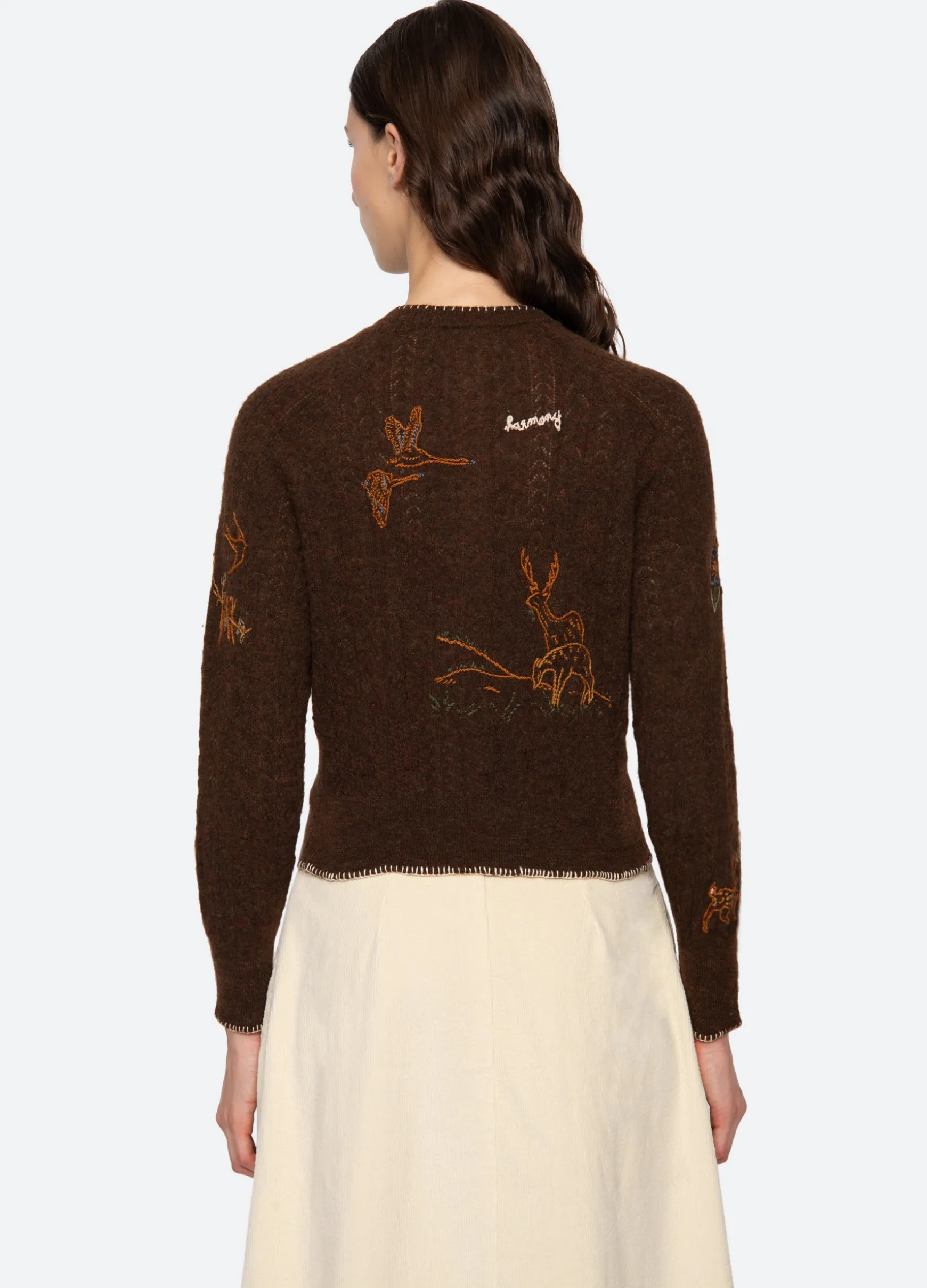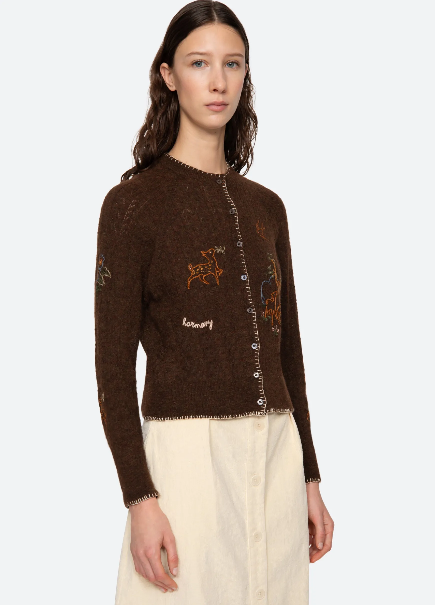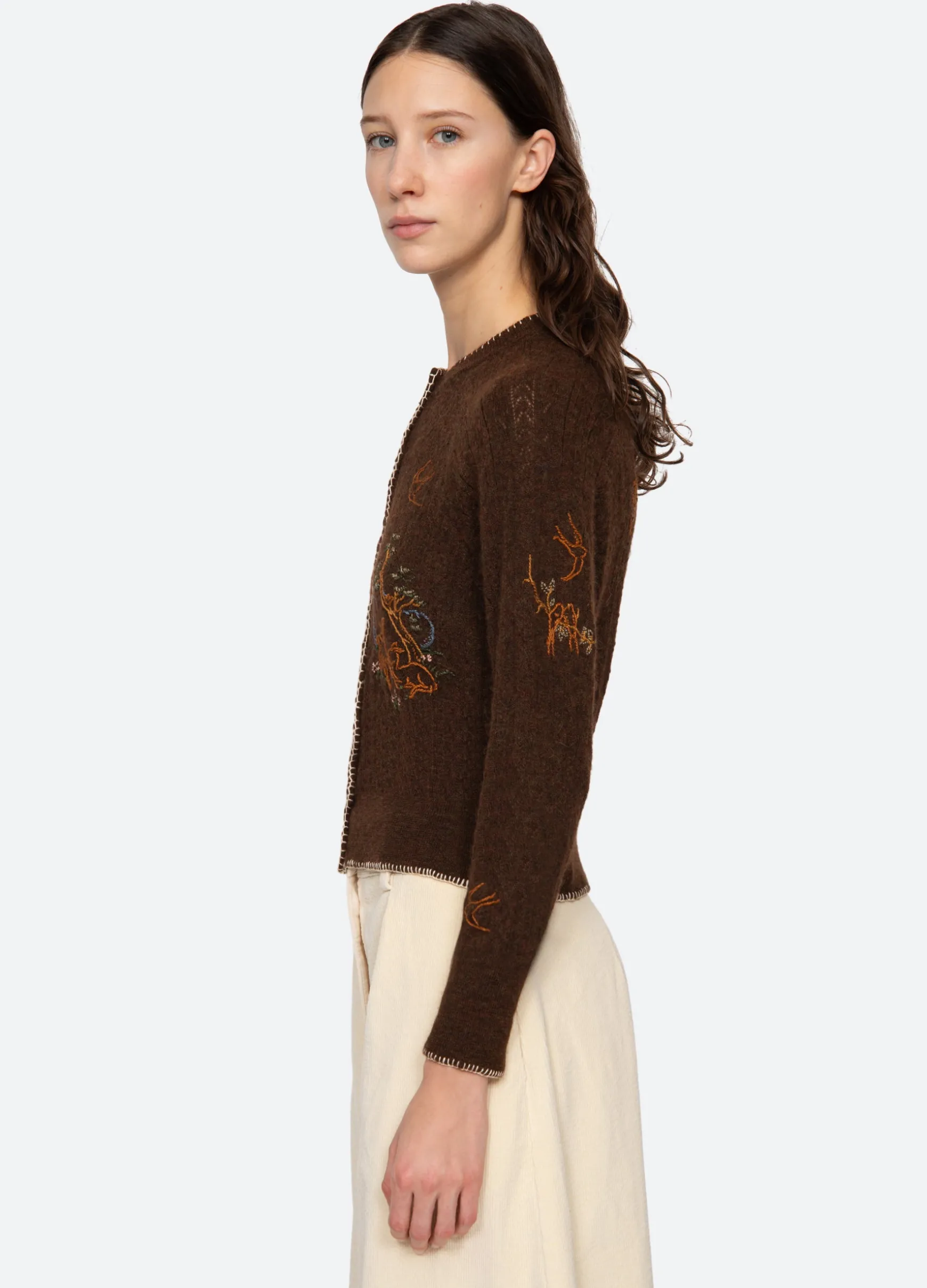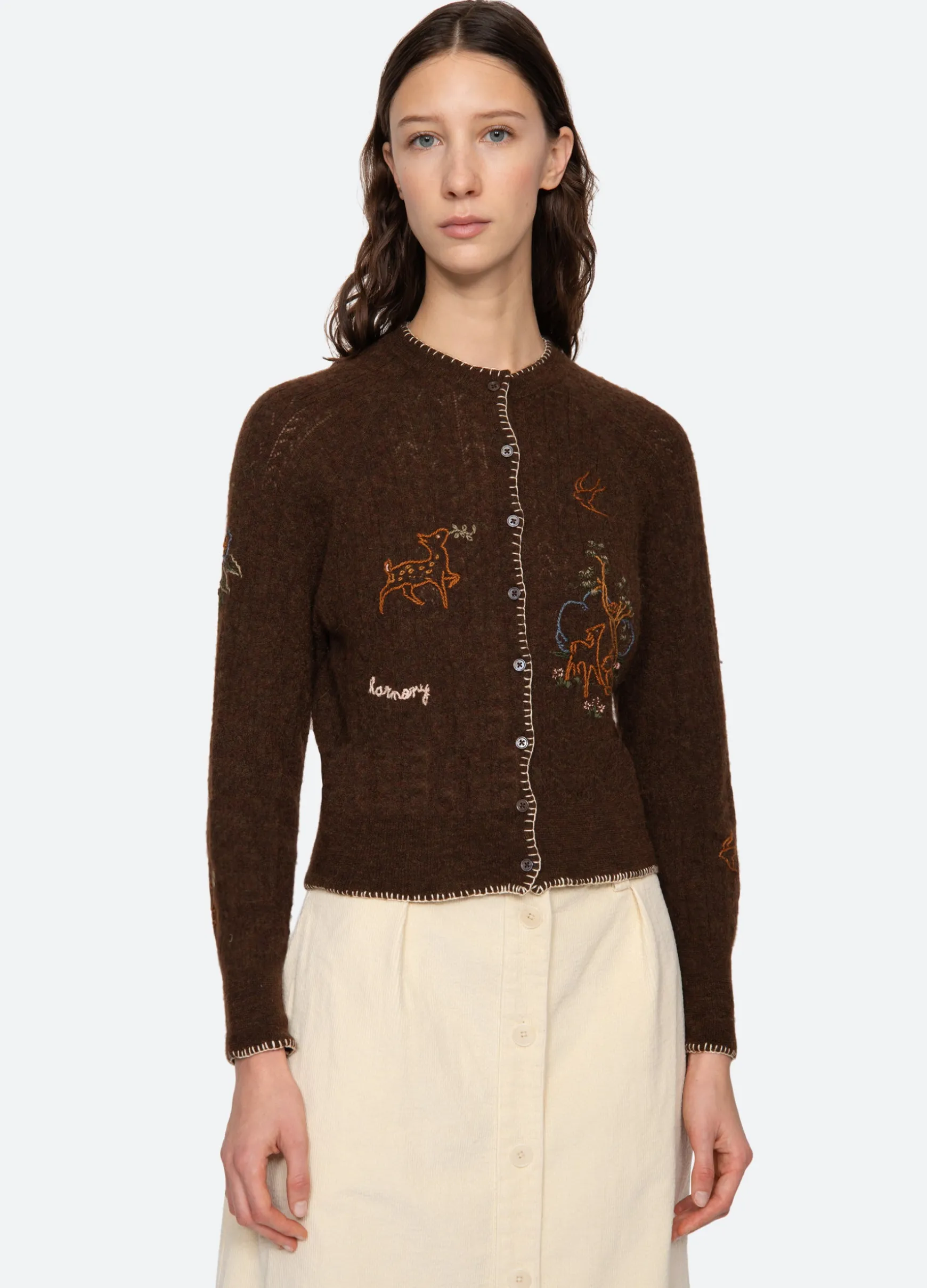The Martha embroidered cardigan features colorful embroidery that includes florals and animals throughout.