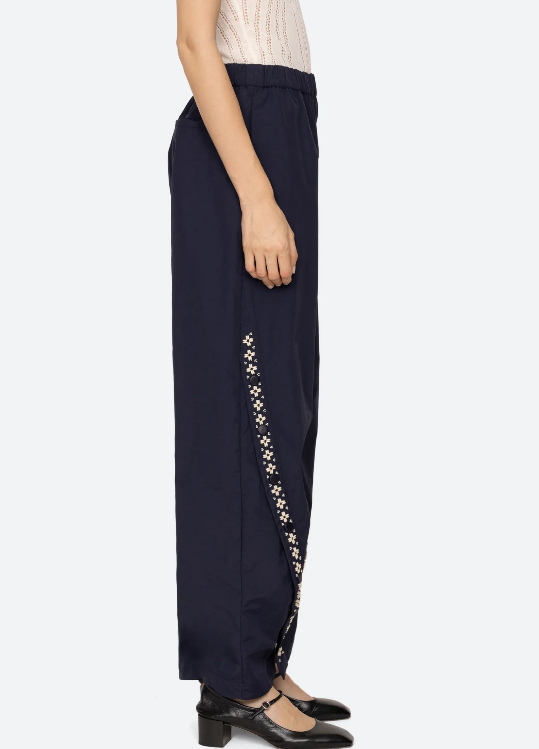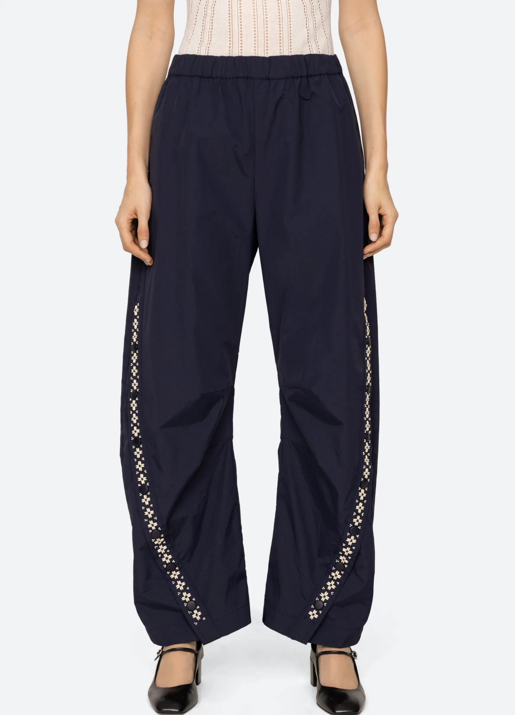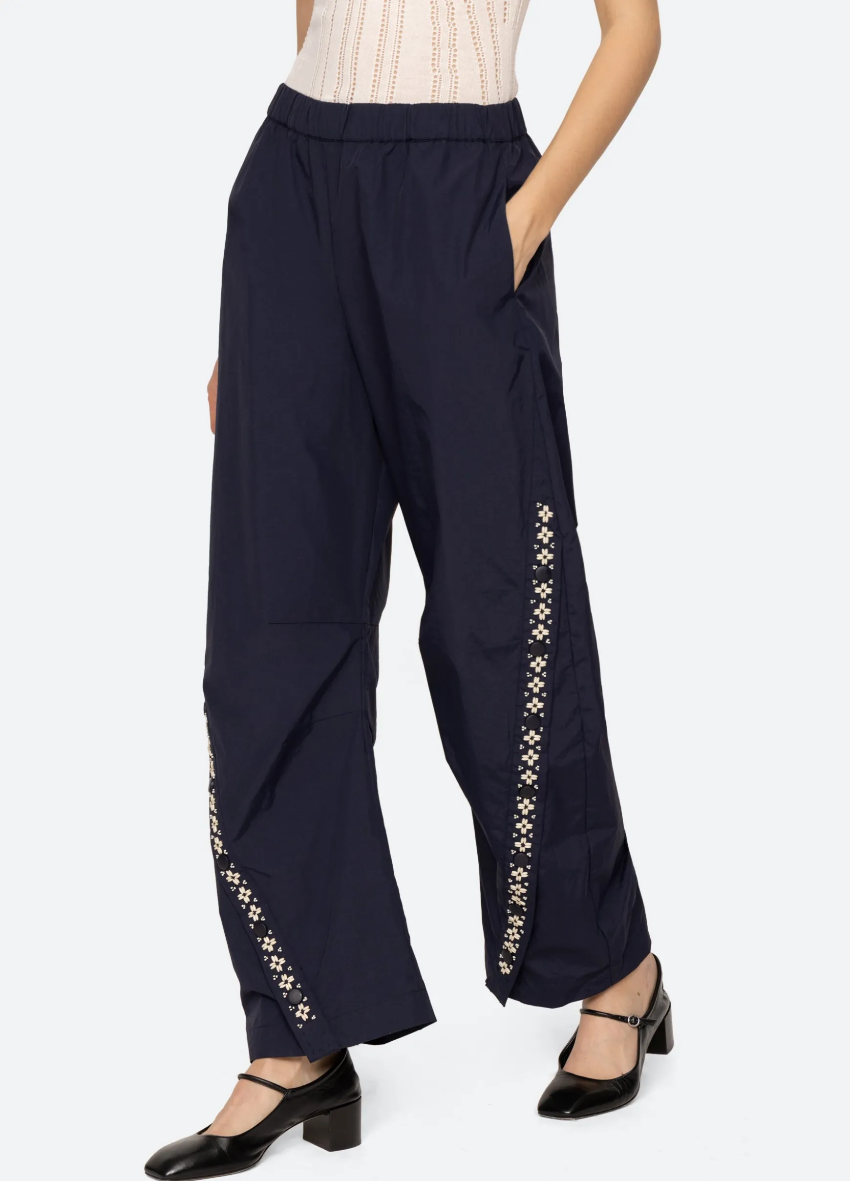 The Mille windbreaker pant features beading, french knot embroidery and an elasticized waist.