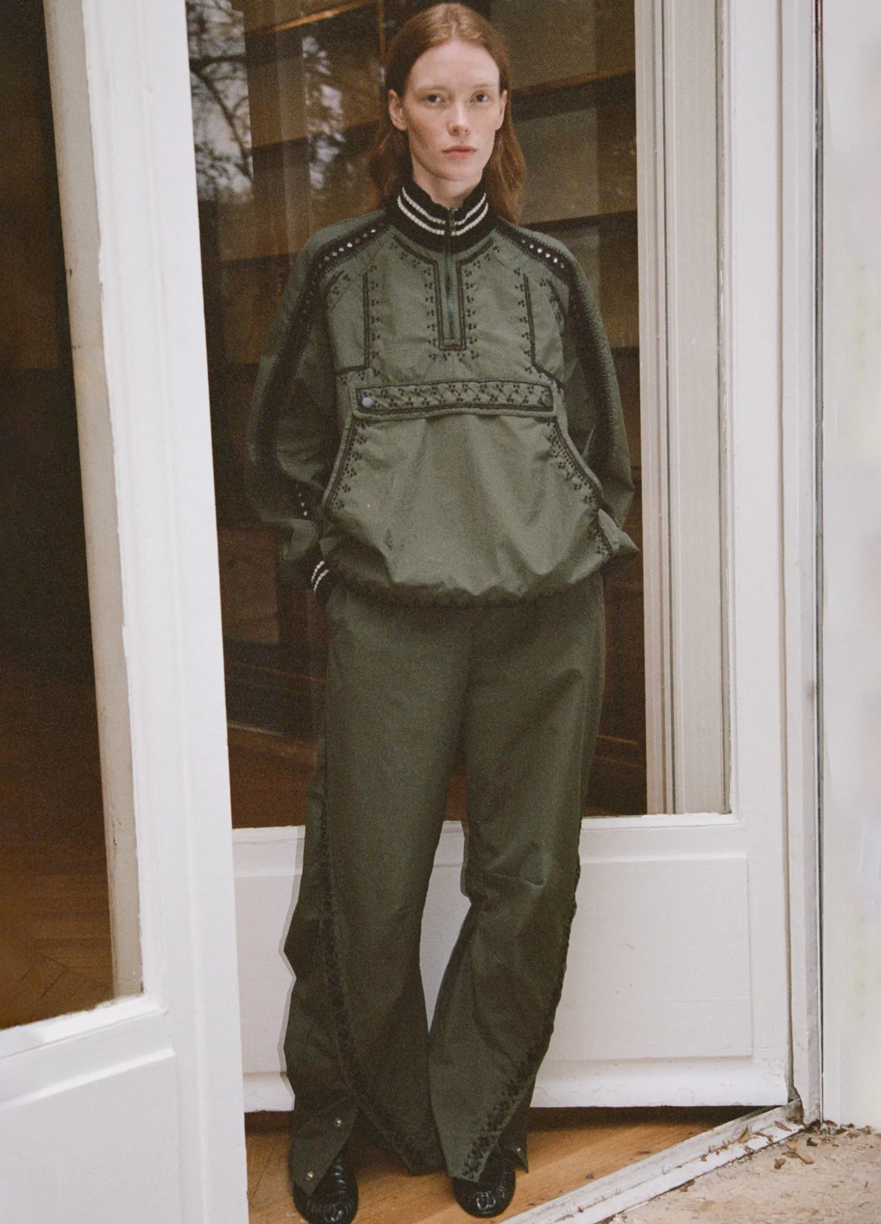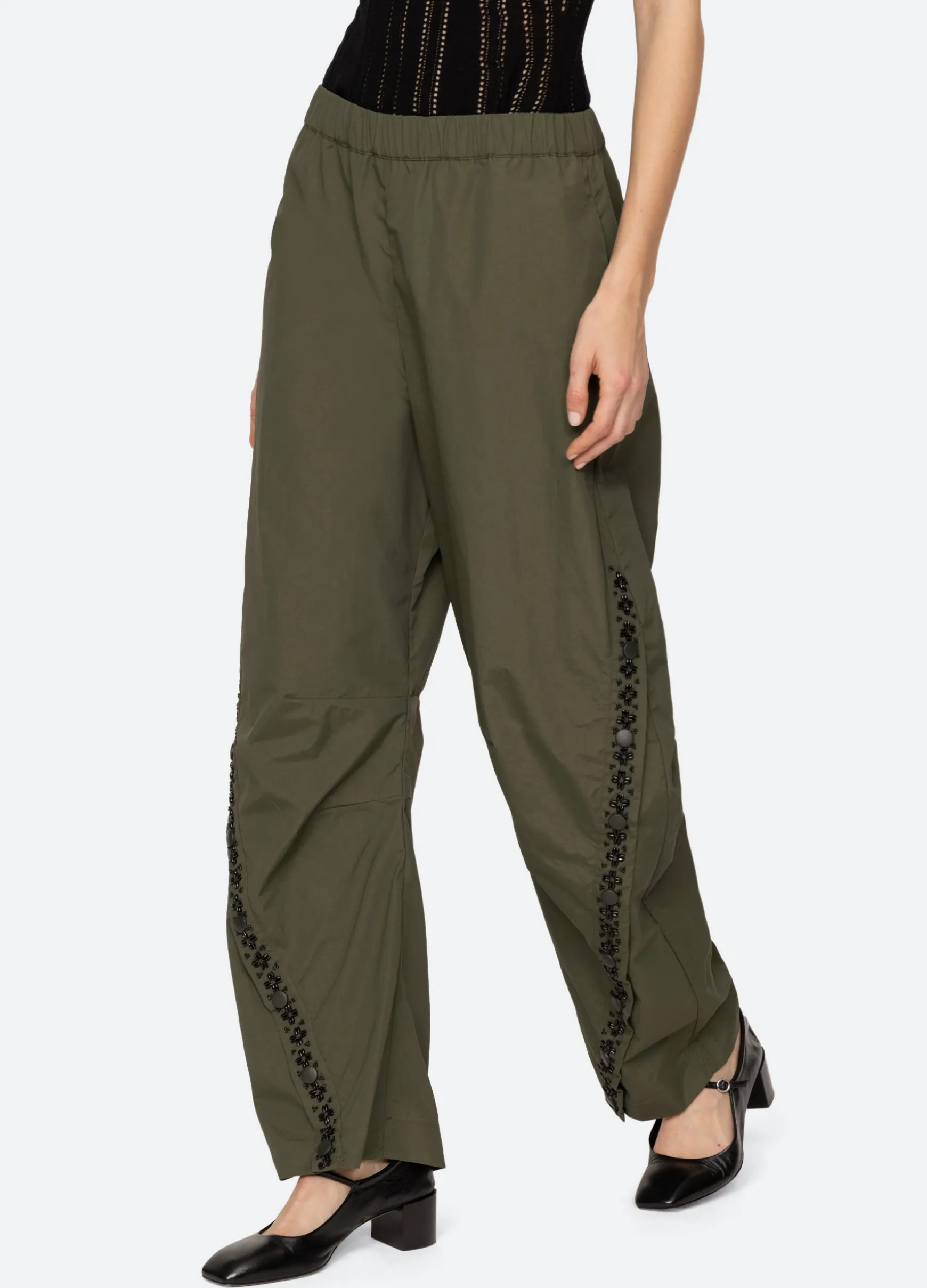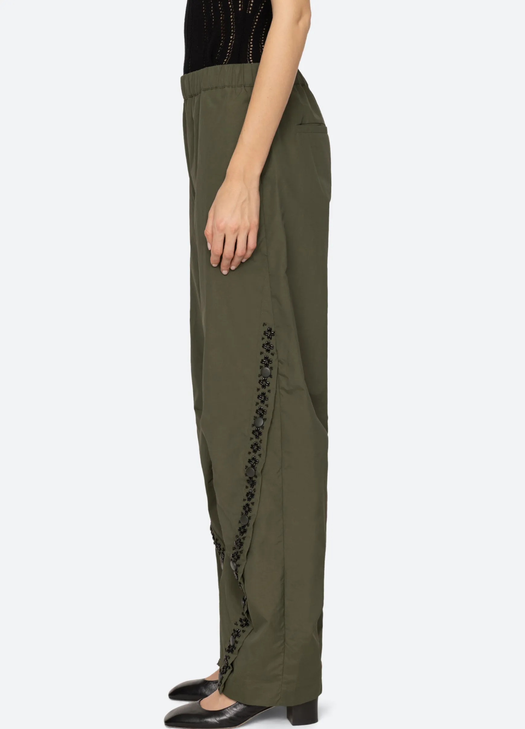 The Mille windbreaker pant features beading, french knot embroidery and an elasticized waist.