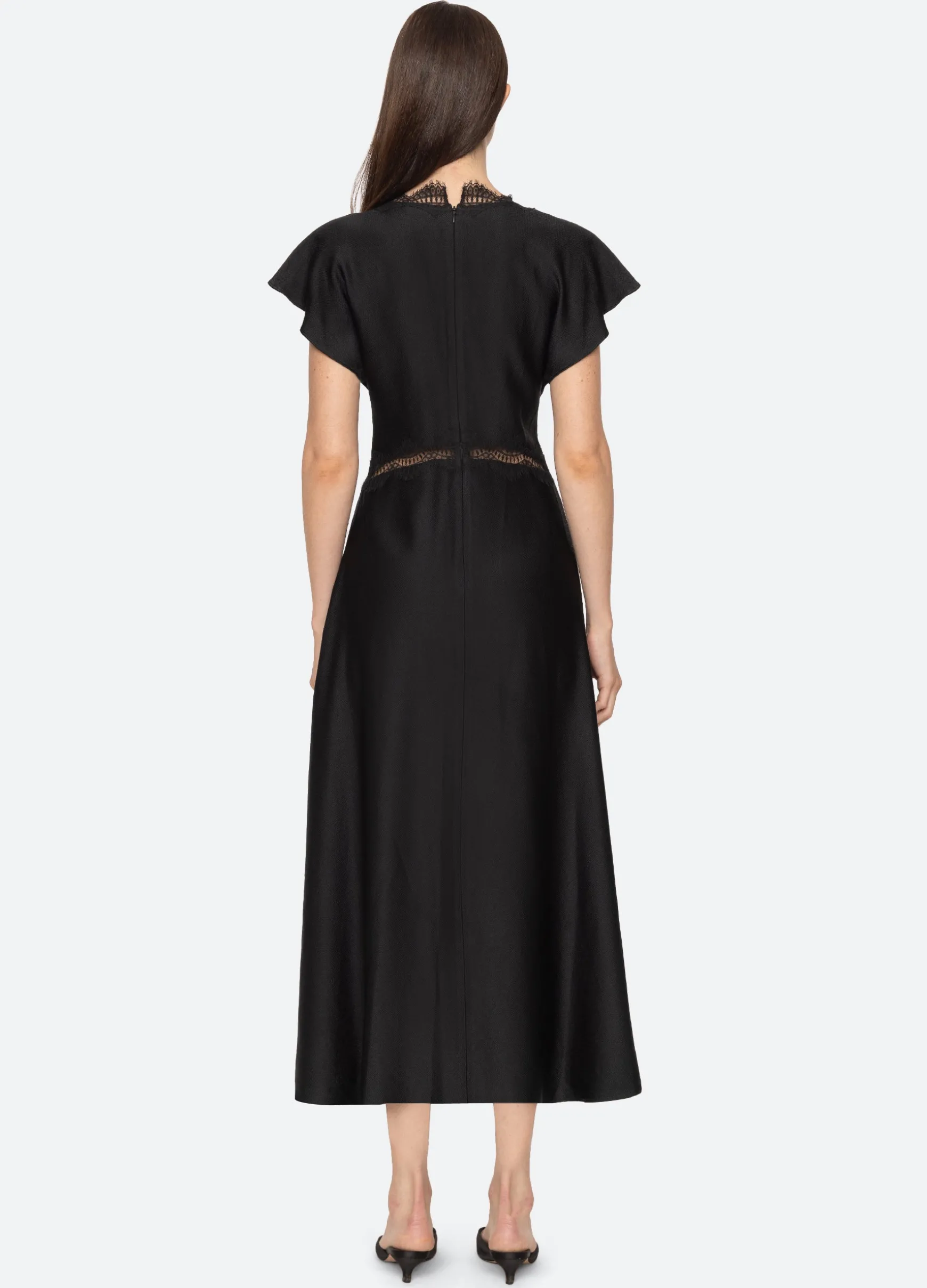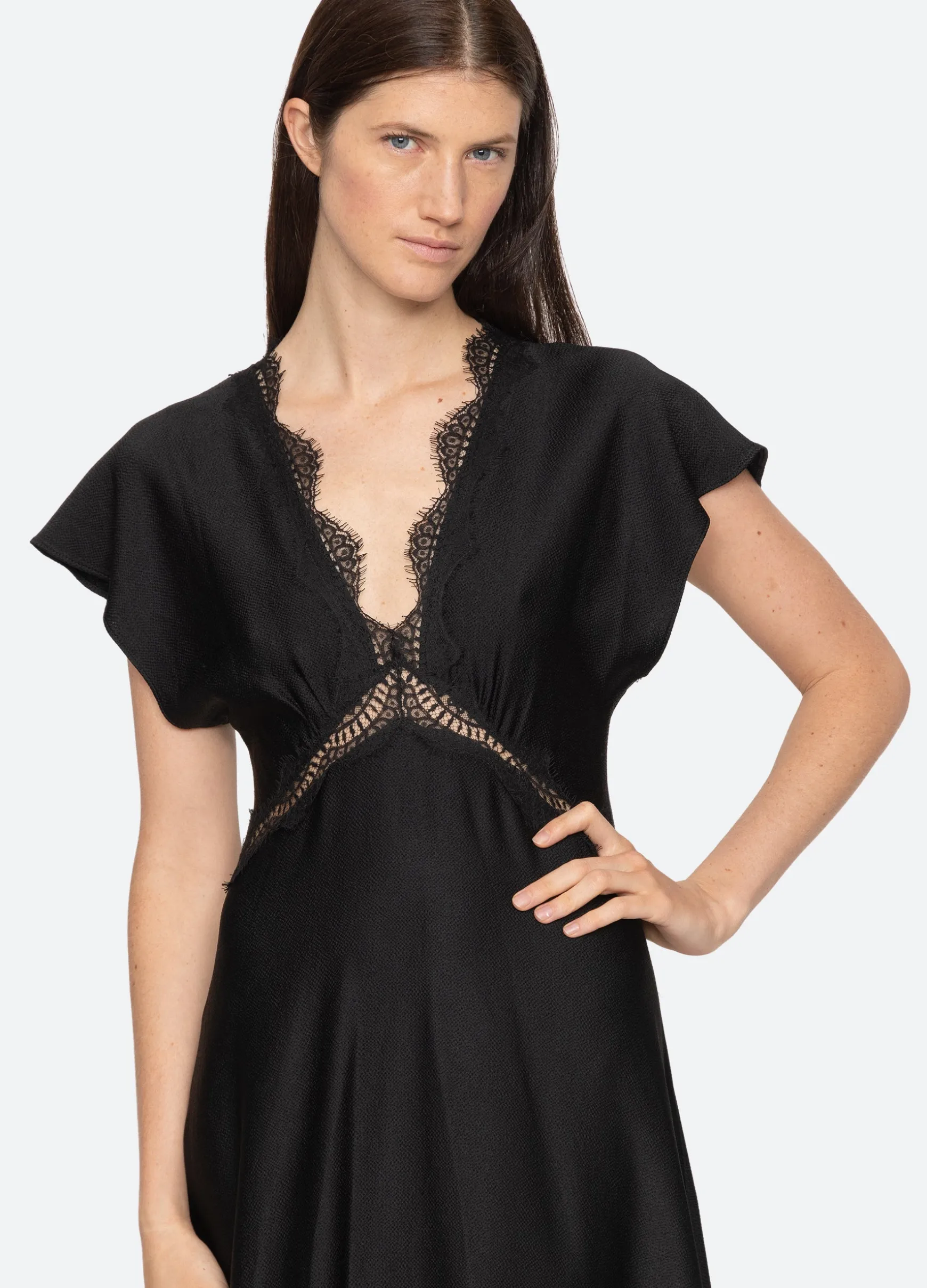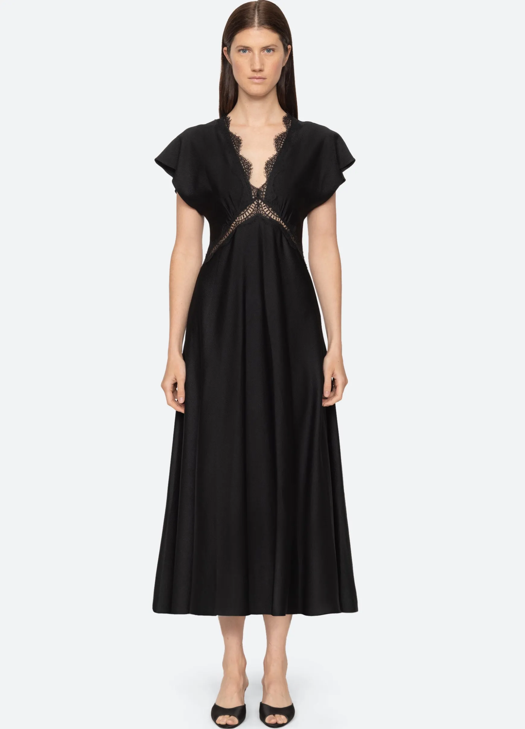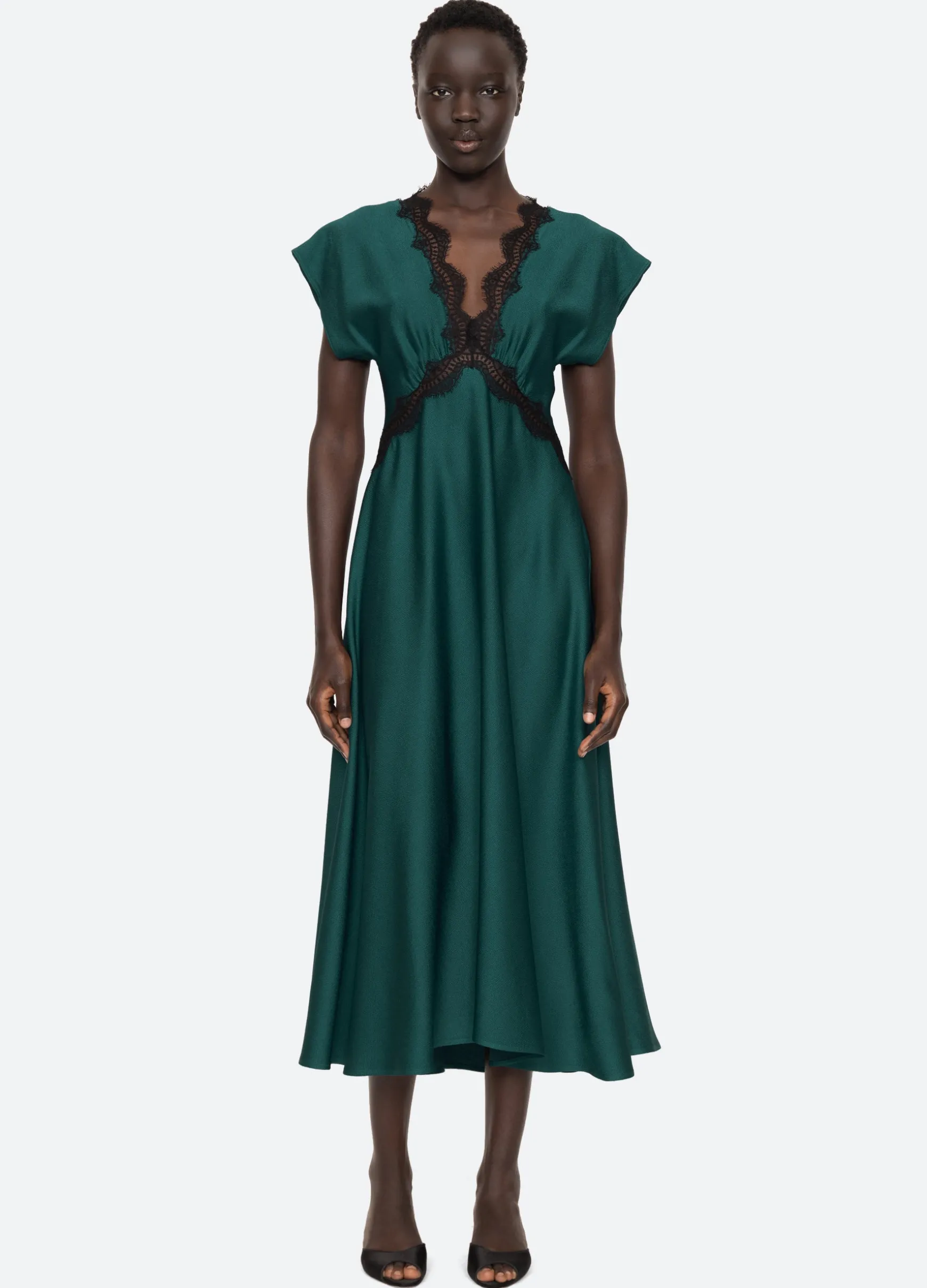 The Noa satin v-neck dress features short dolman sleeves, delicate lace trim detailing, and a midi silhouette.