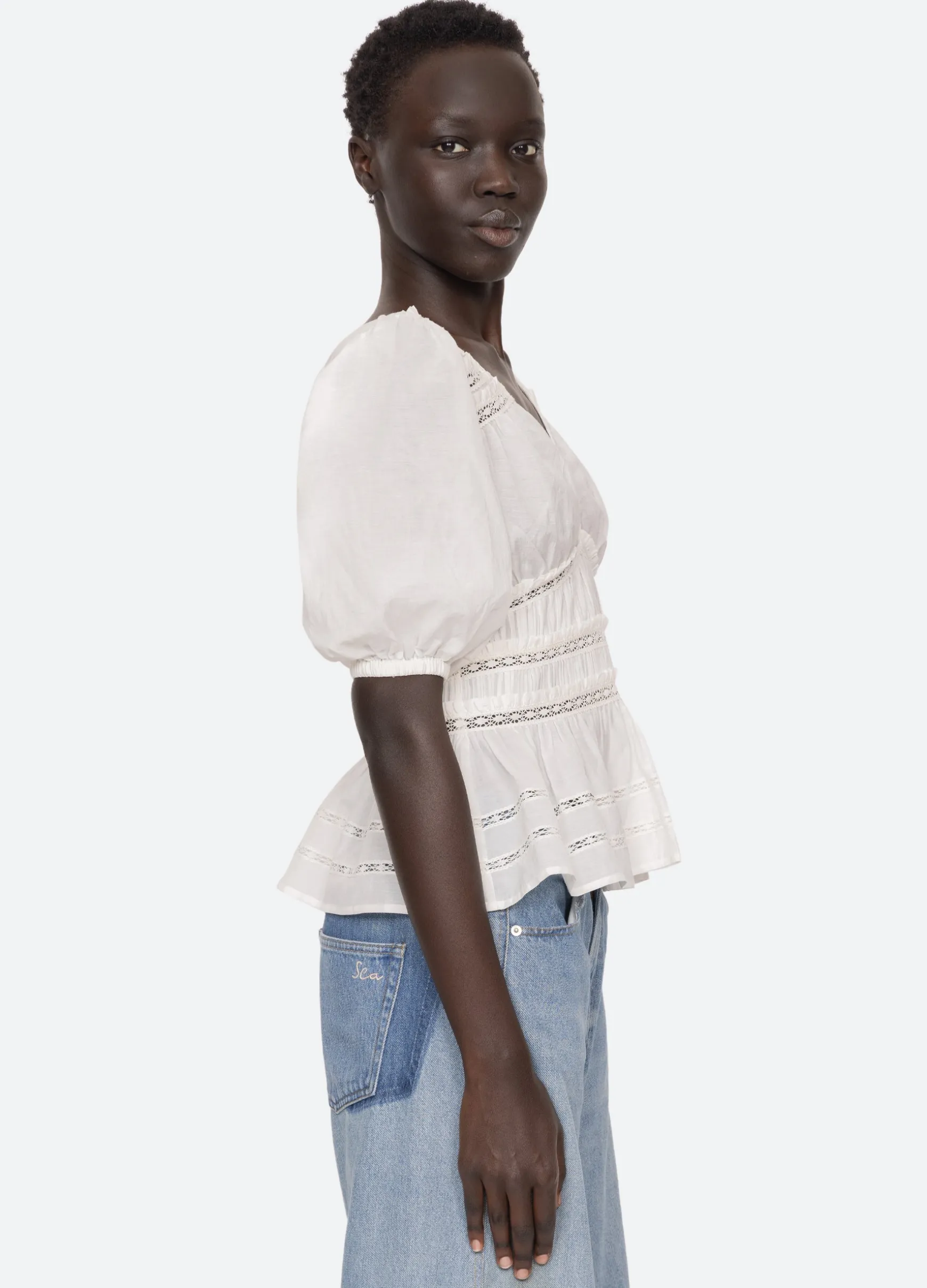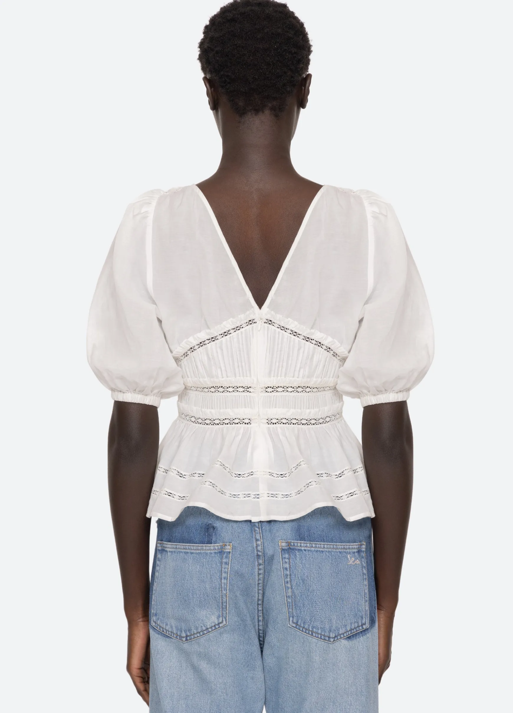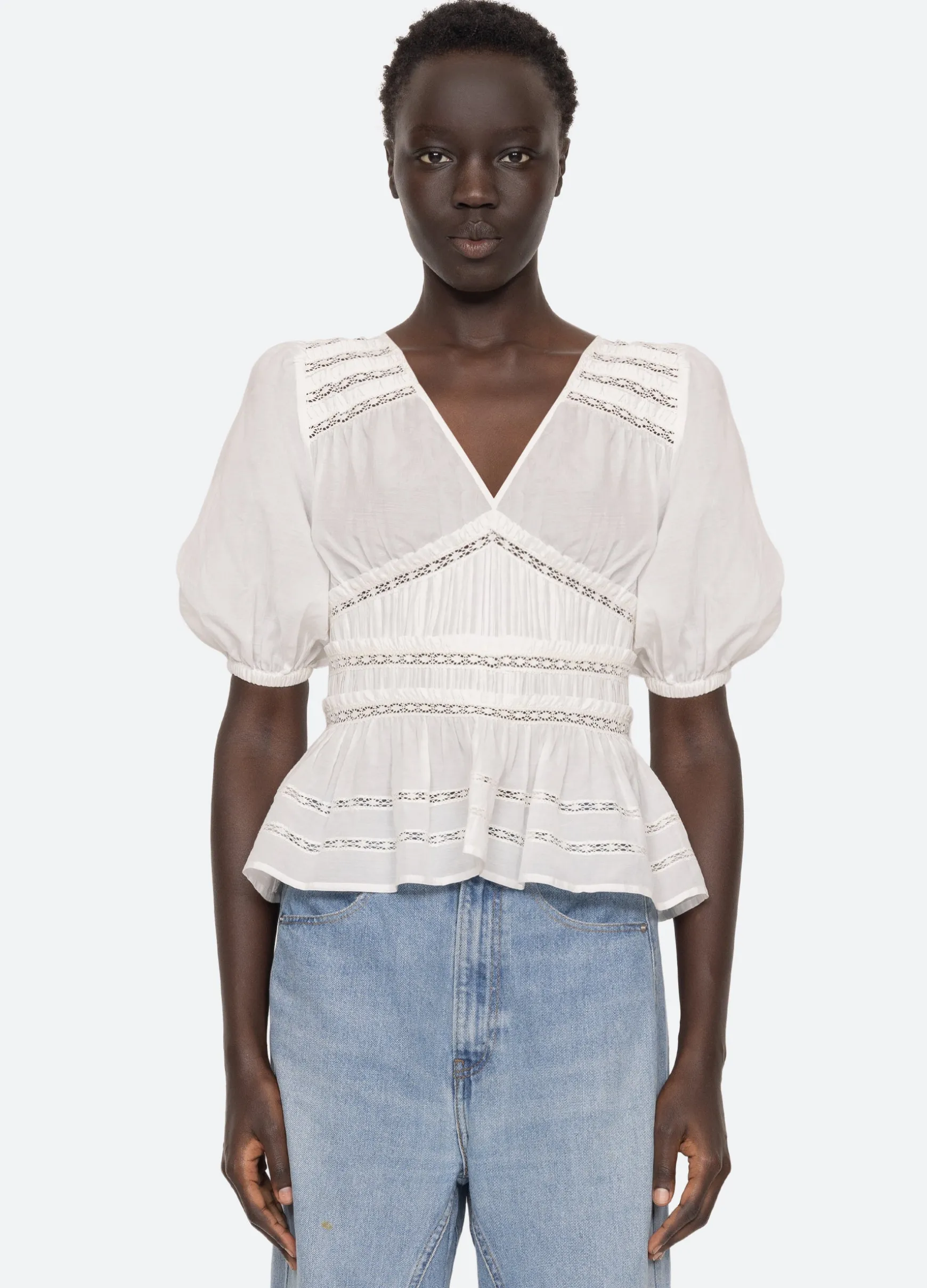 The Nomi top features puff sleeves, v-neckline and delicate lace inserts throughout.