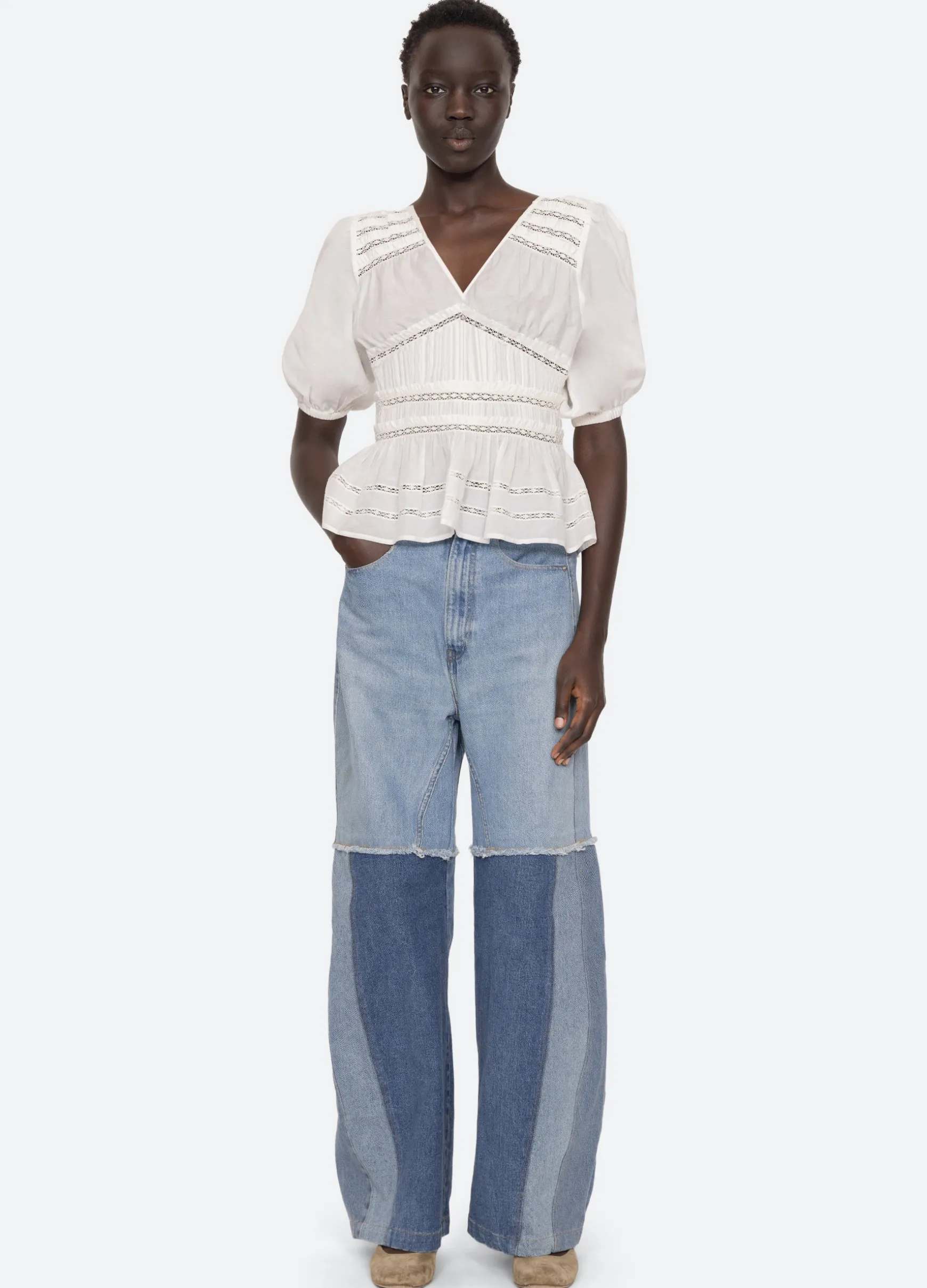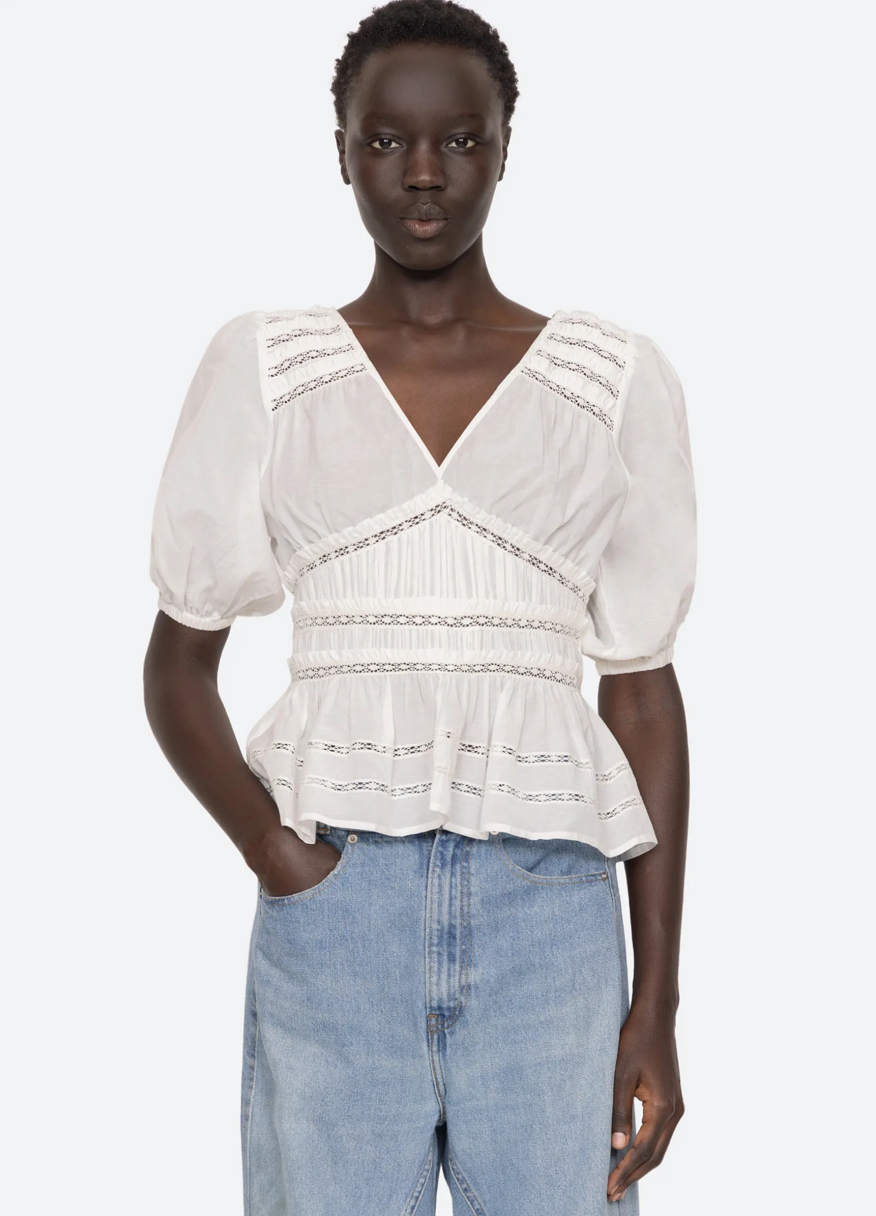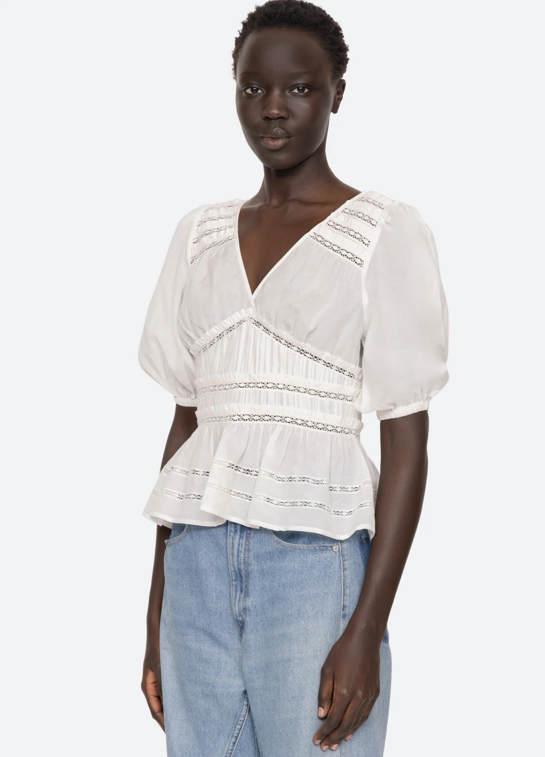 The Nomi top features puff sleeves, v-neckline and delicate lace inserts throughout.