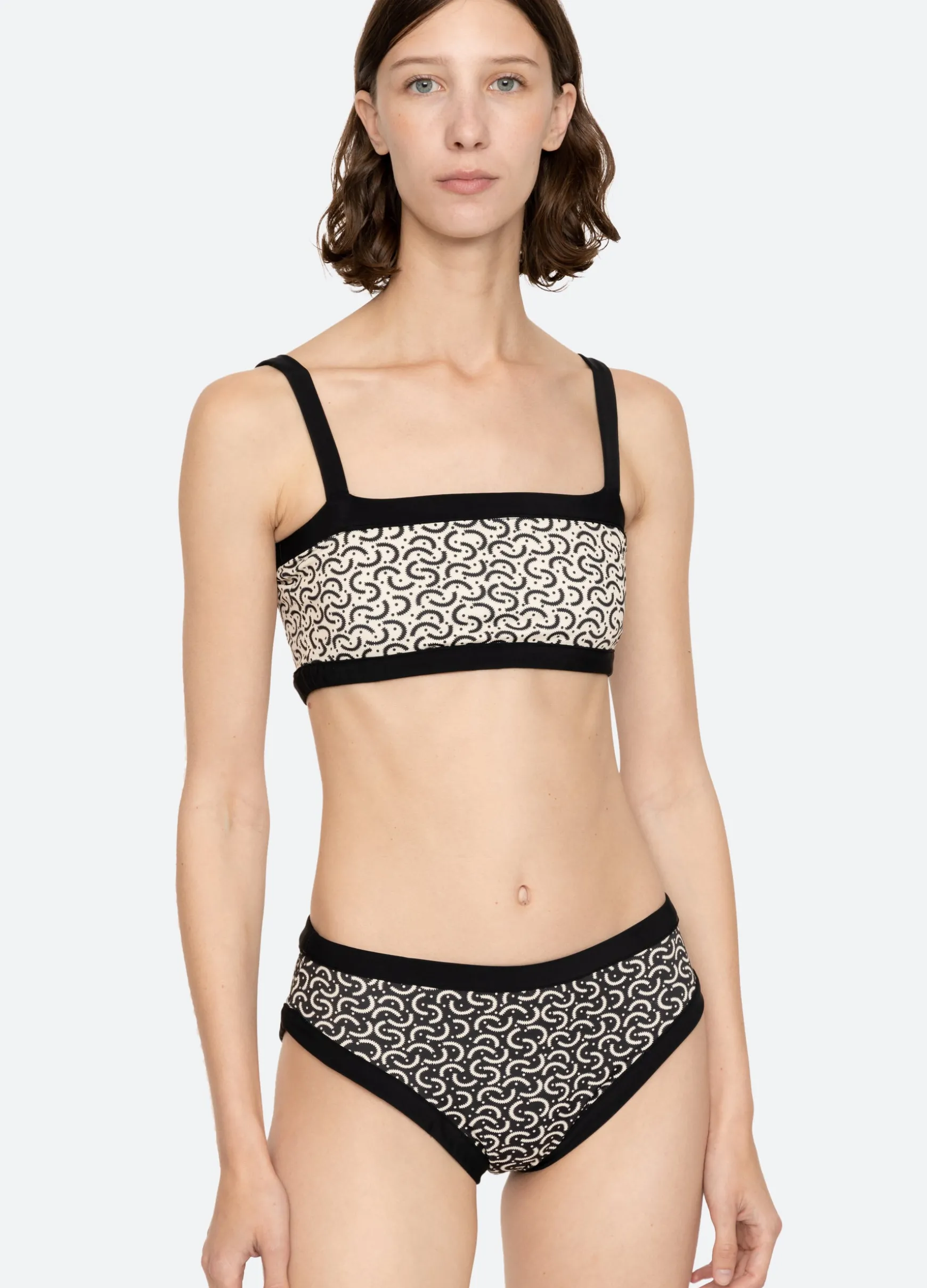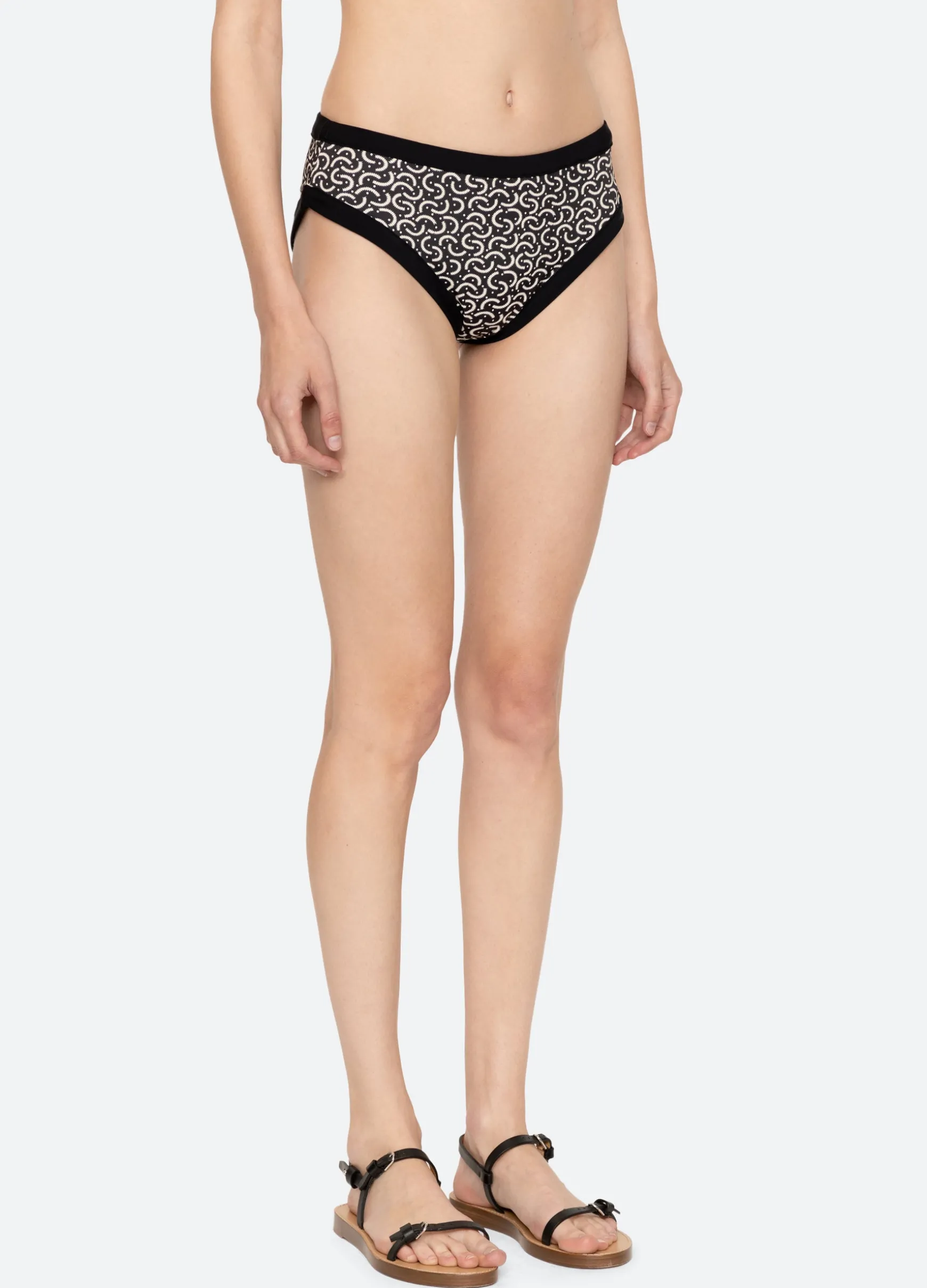 The Panna reversible bikini bottom features a contrasting border and a geometric print that reverses into a solid.
