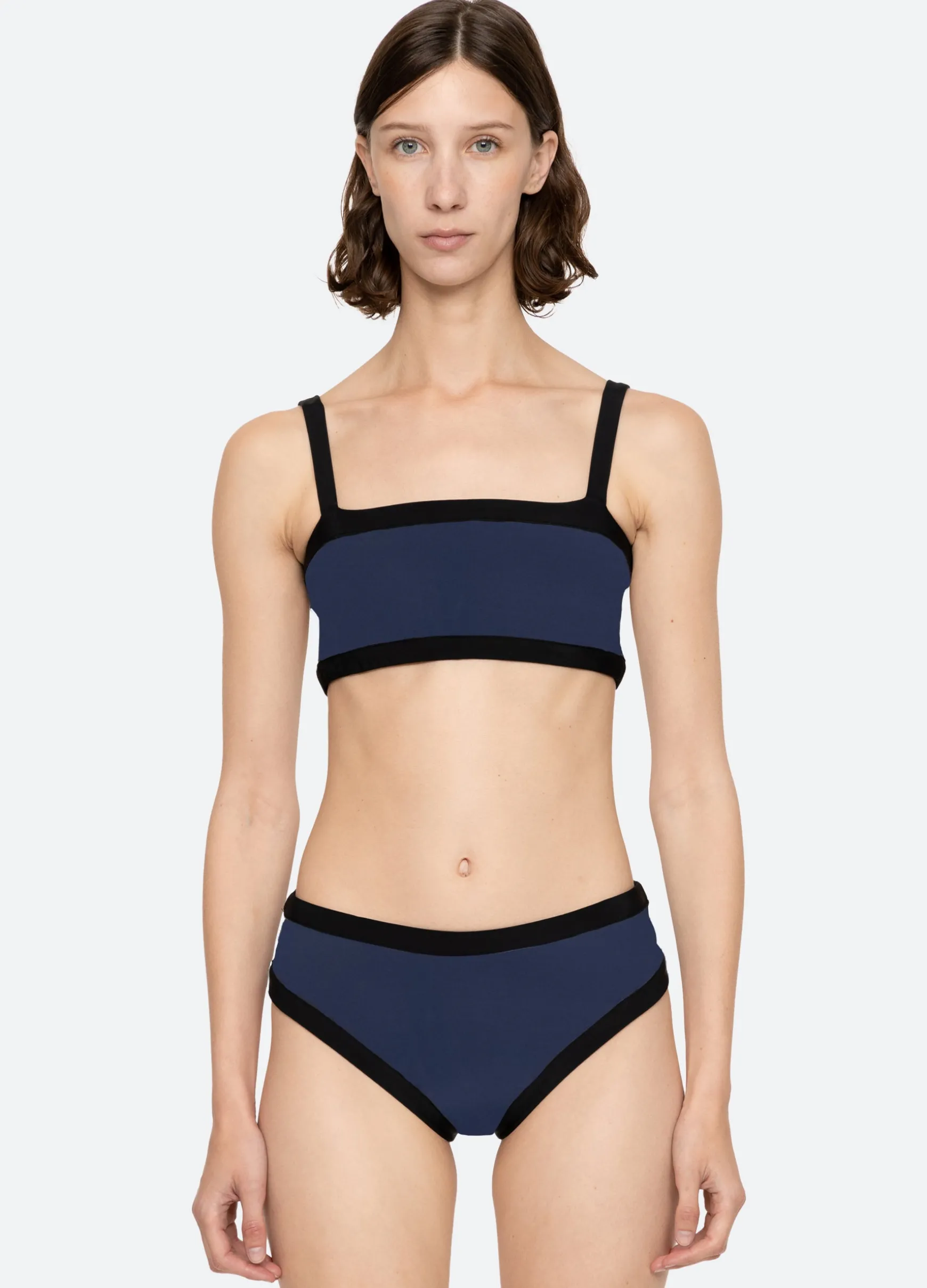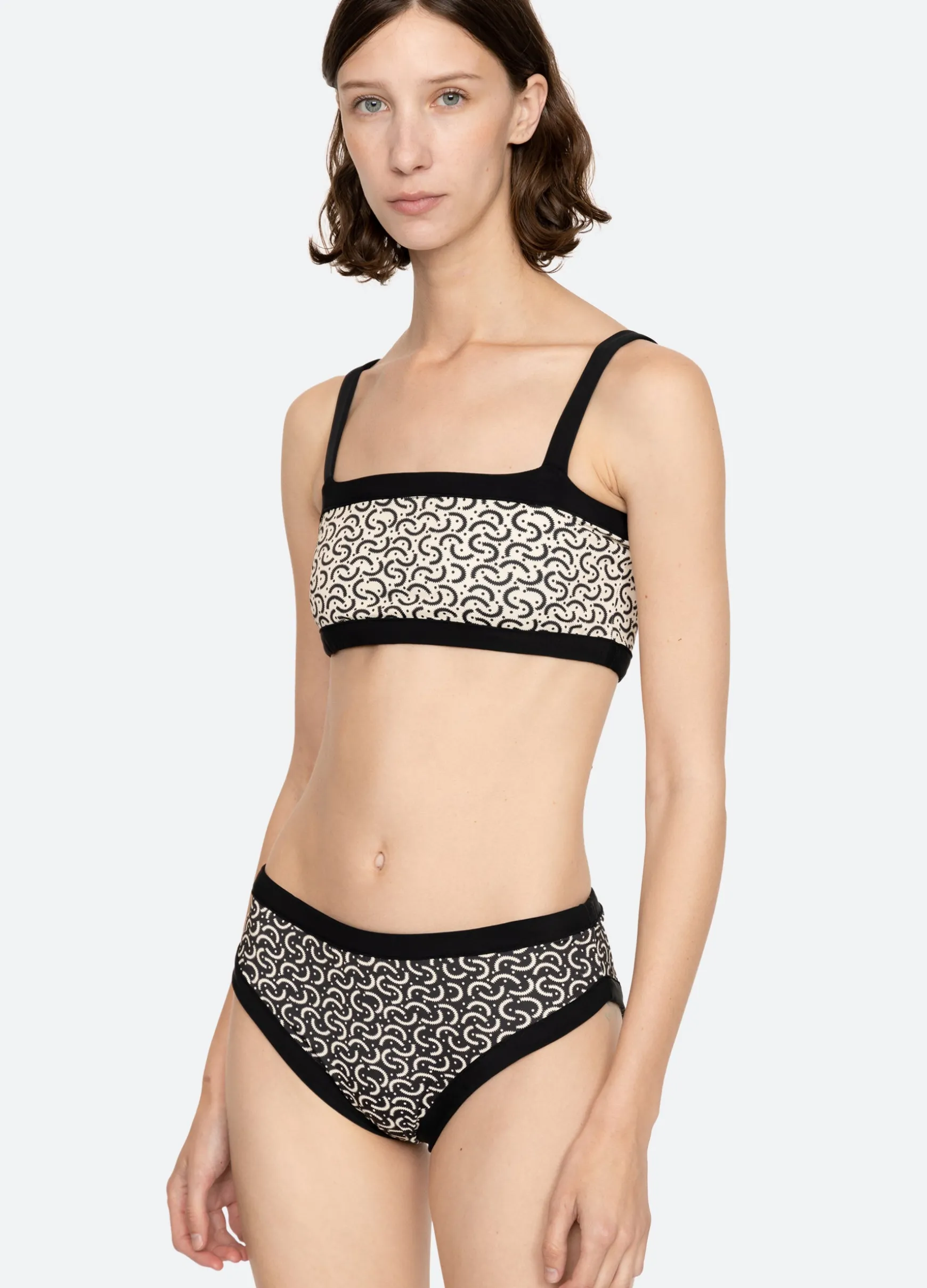 The Panna reversible bikini top features a contrasting border and a geometric print that reverses into a solid.