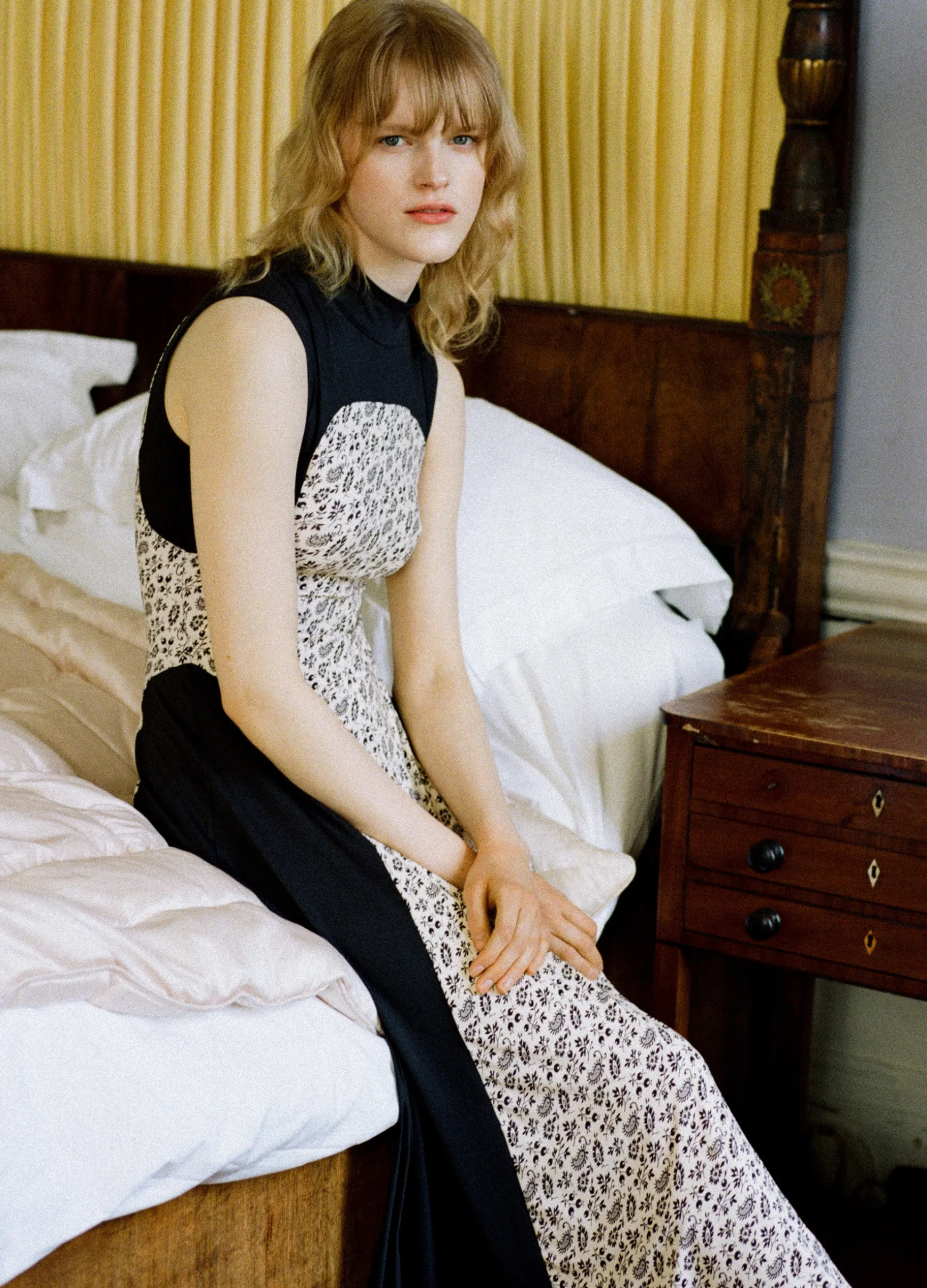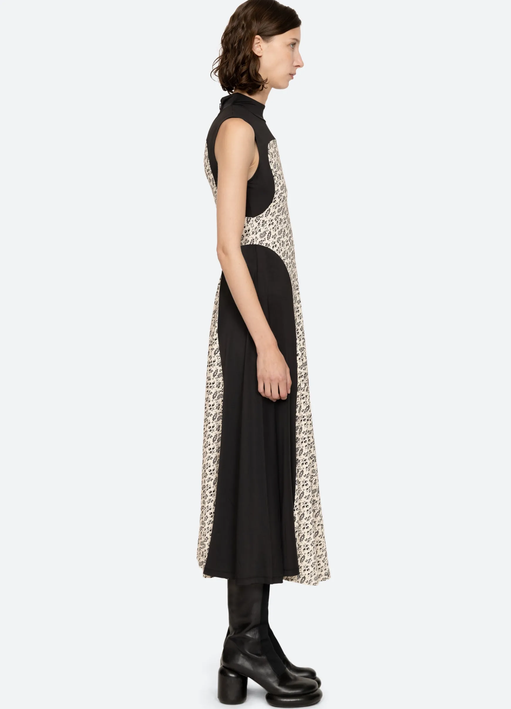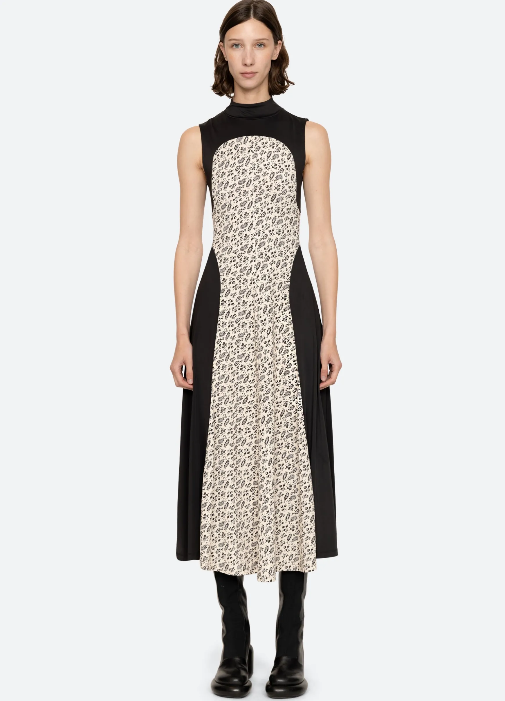 The Panna graphic print sleeveless dress features a mix of printed and solid spandex, high neck, and midi silhouette.