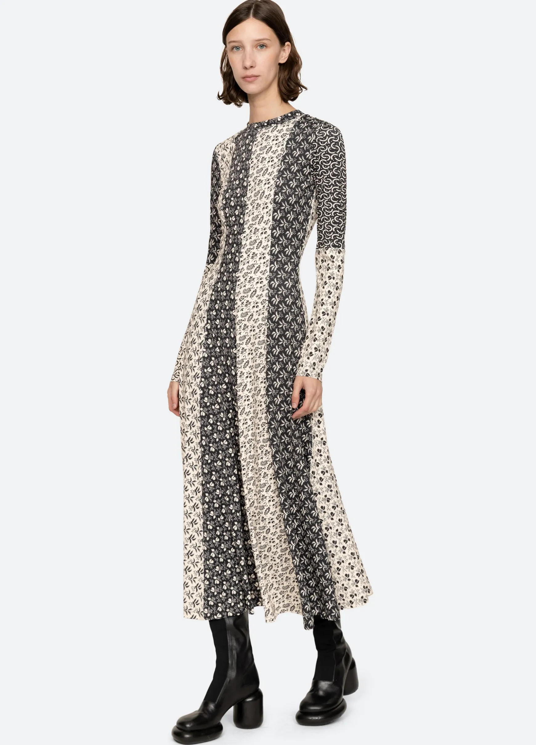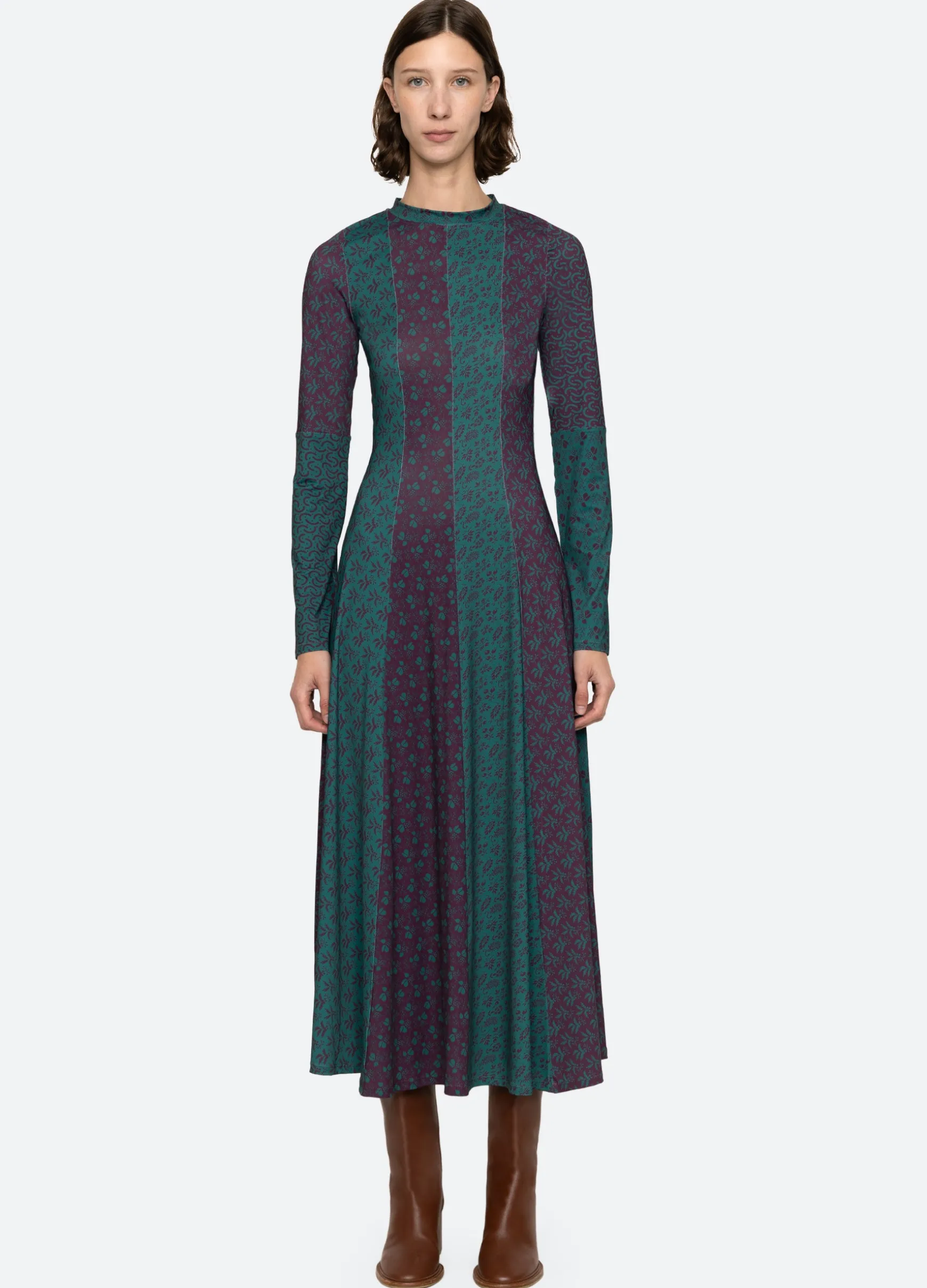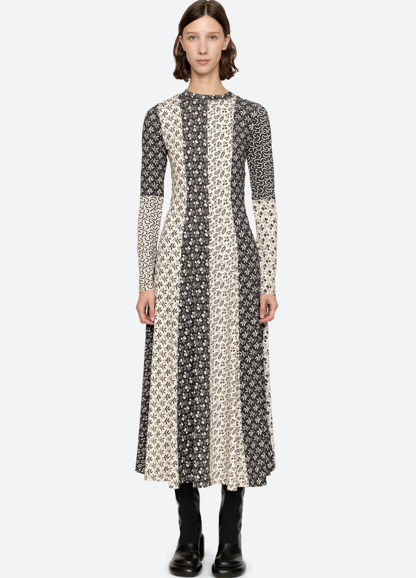The Panna mix-up graphic print long sleeve dress features a full skirt and midi silhouette.