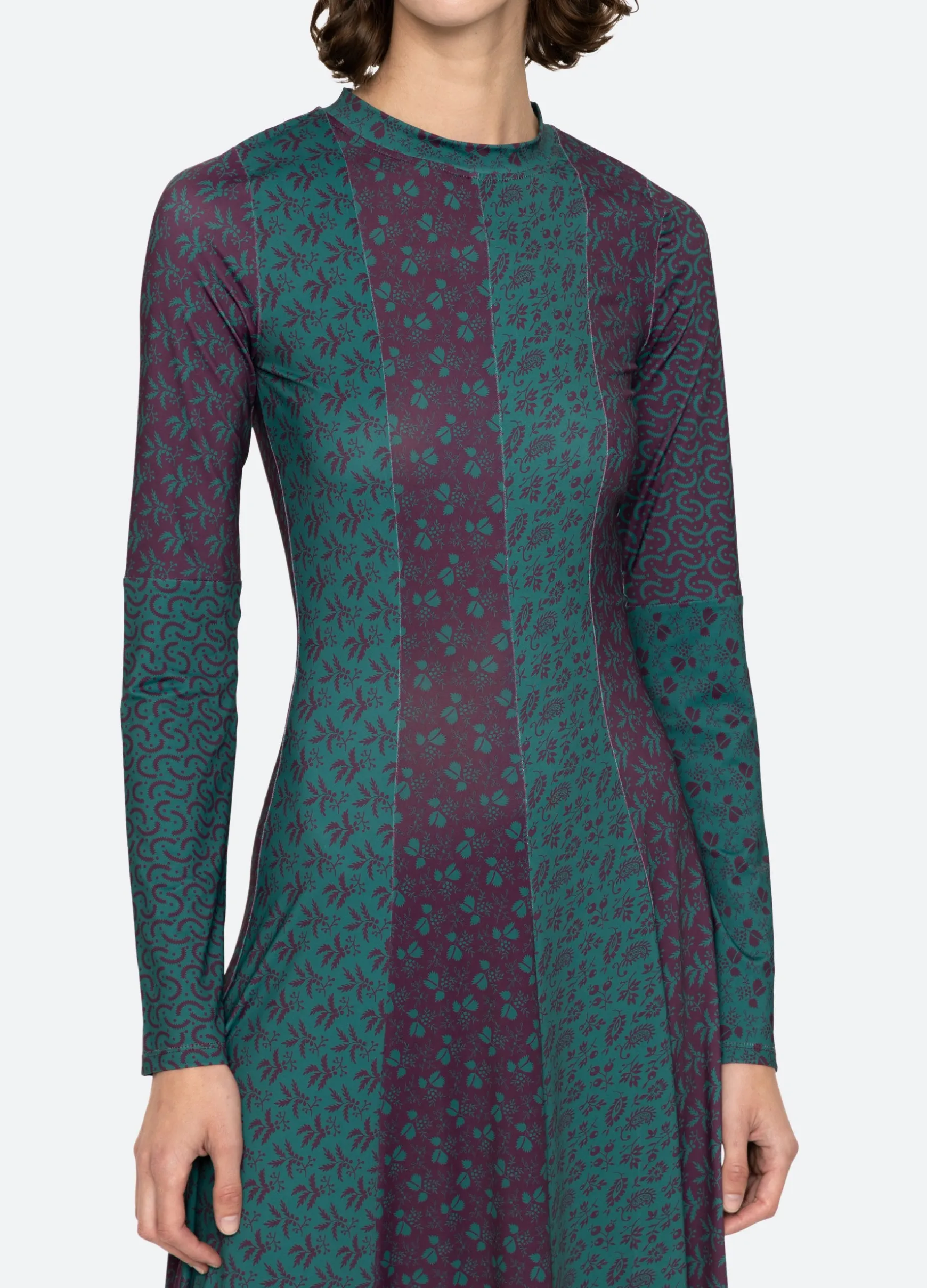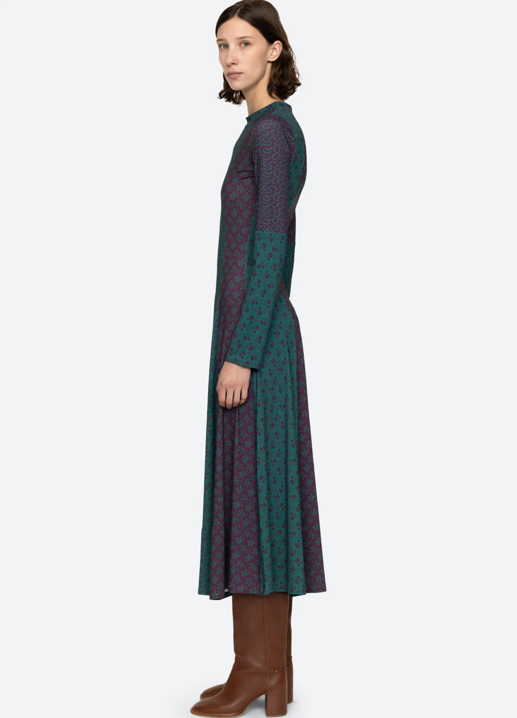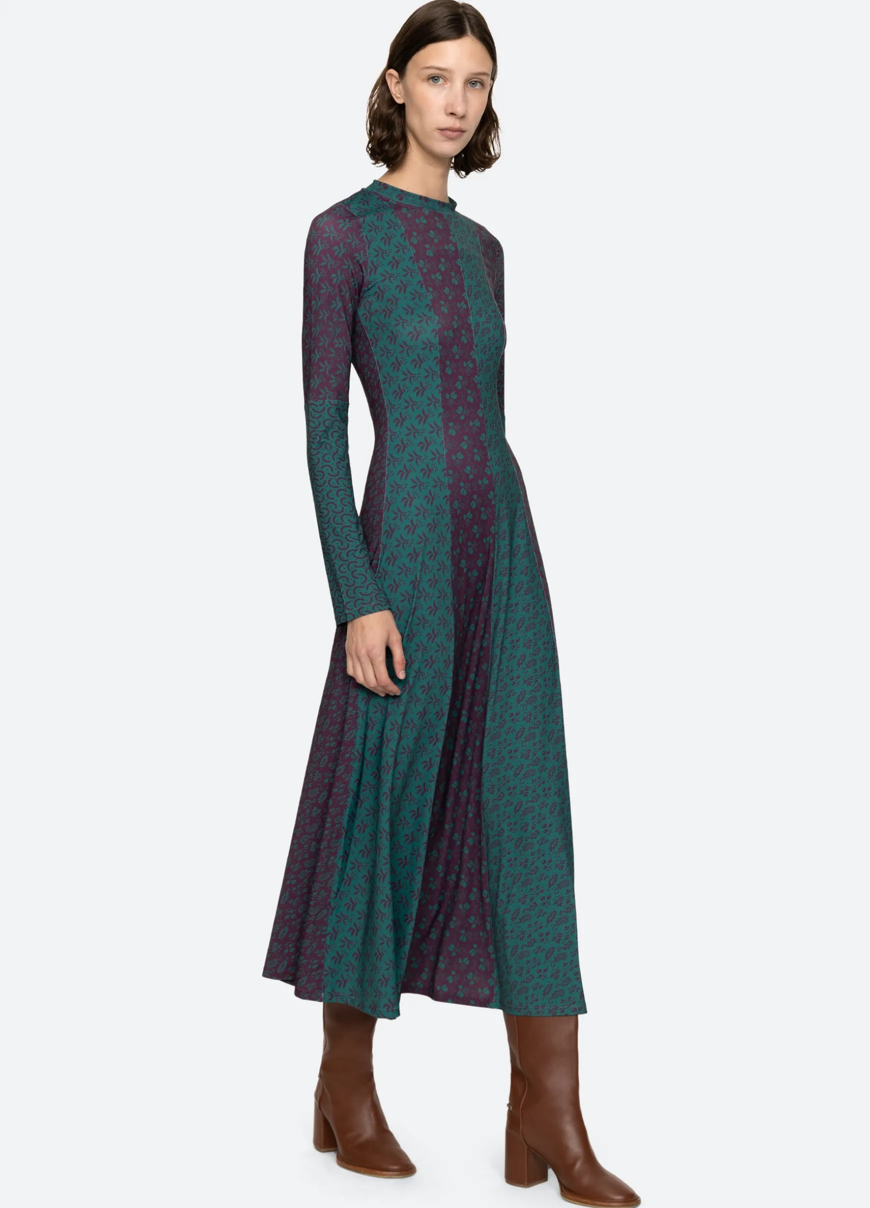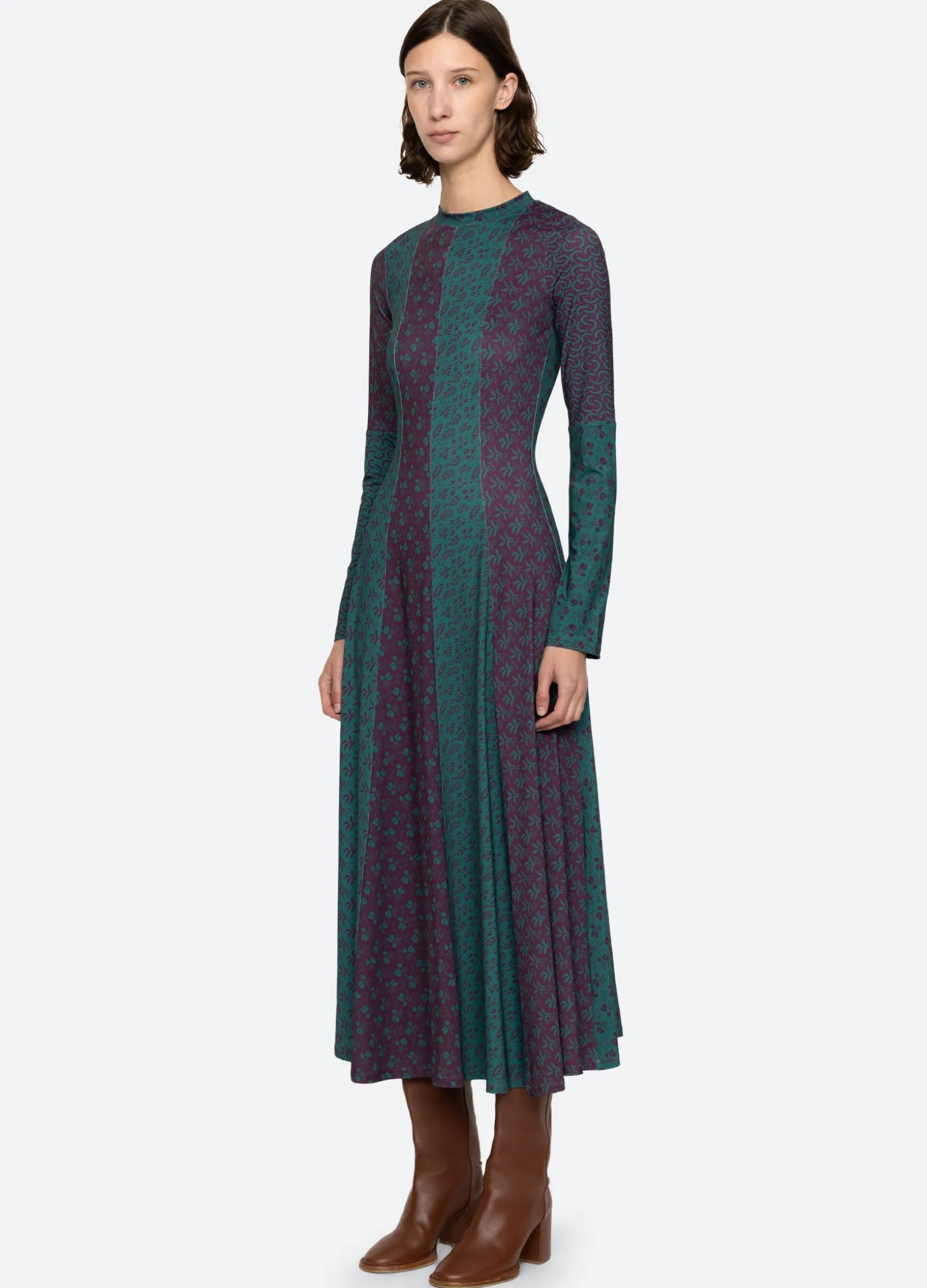 The Panna mix-up graphic print long sleeve dress features a full skirt and midi silhouette.