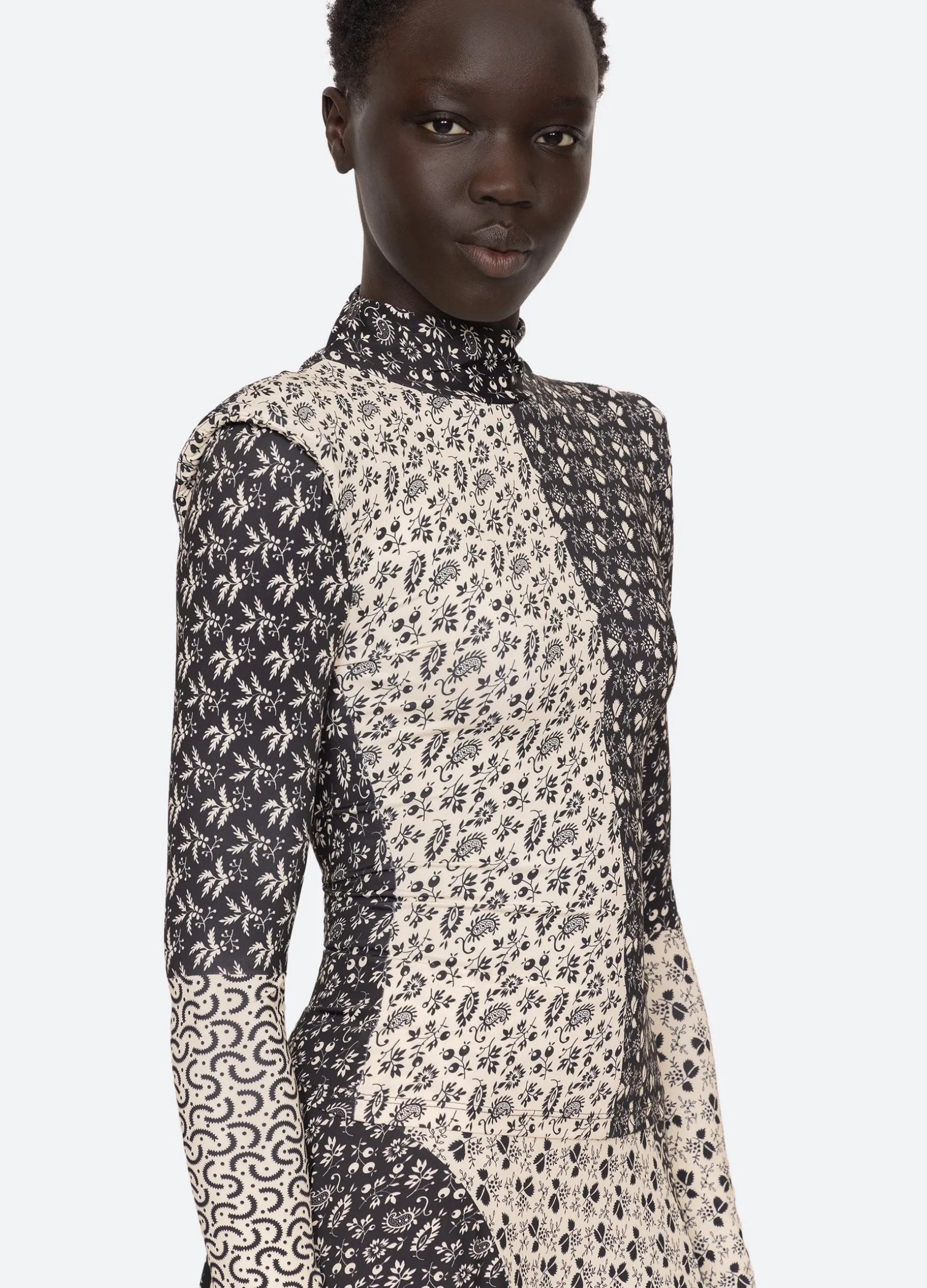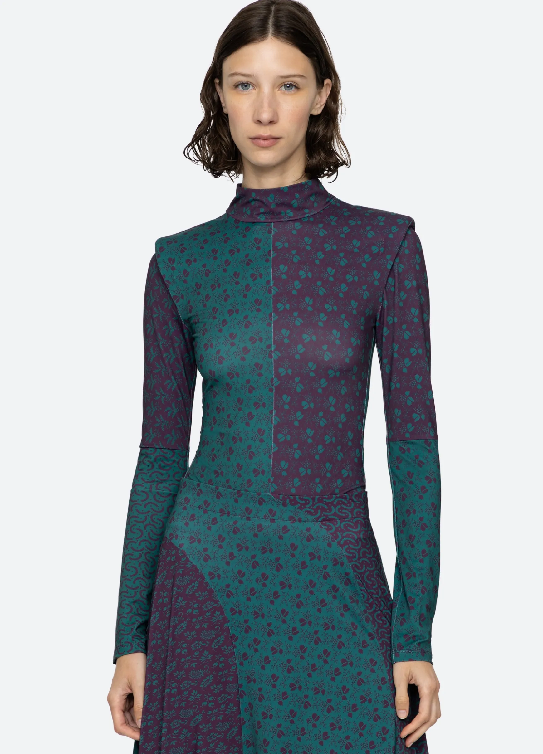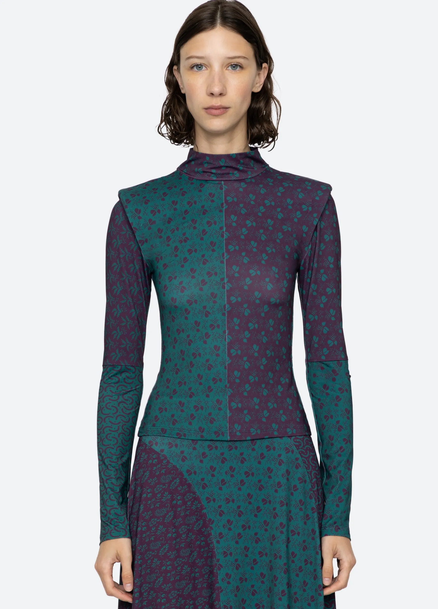 The Panna mix-up graphic print top features long sleeves, high neck and shoulder pads.