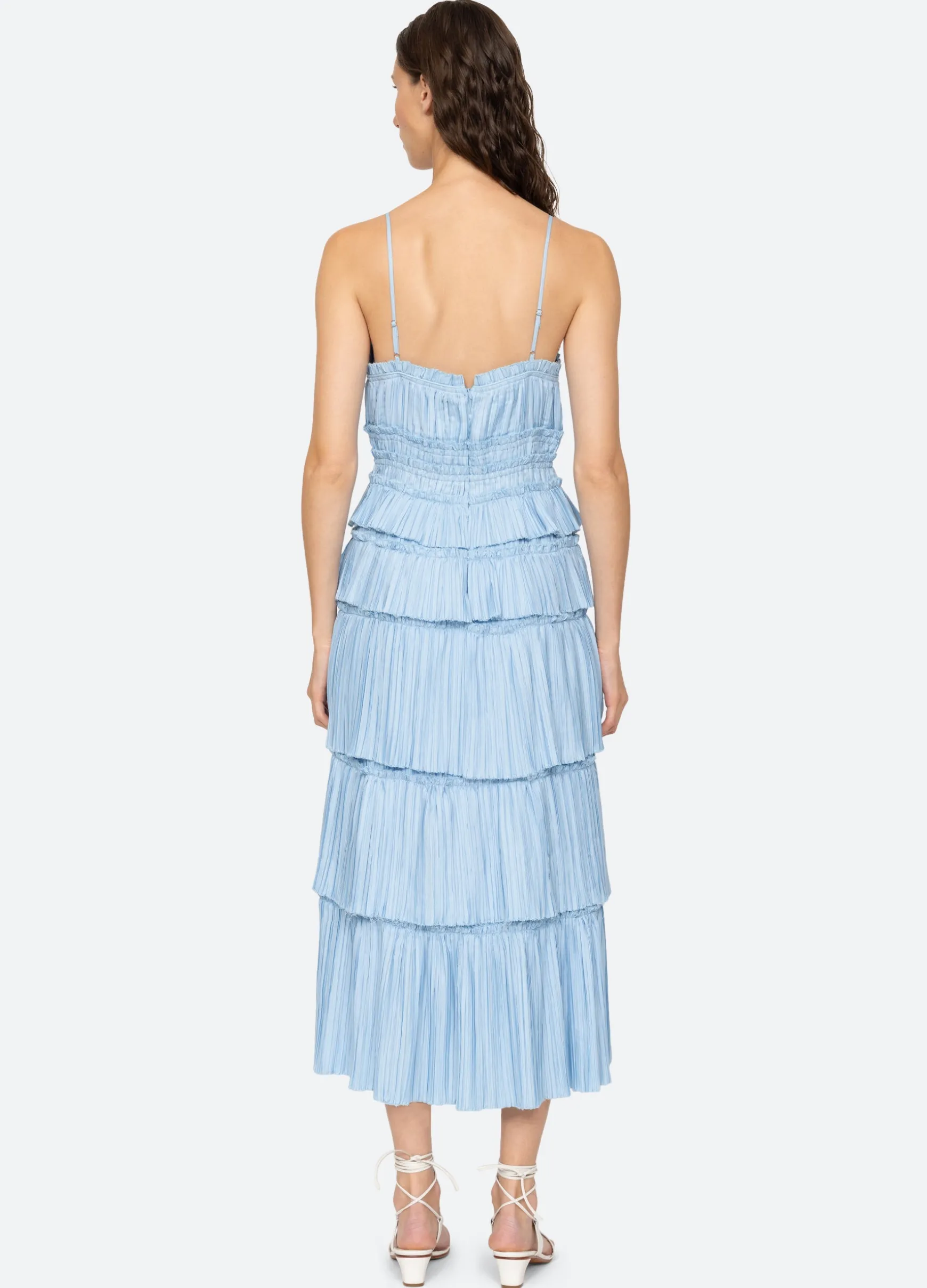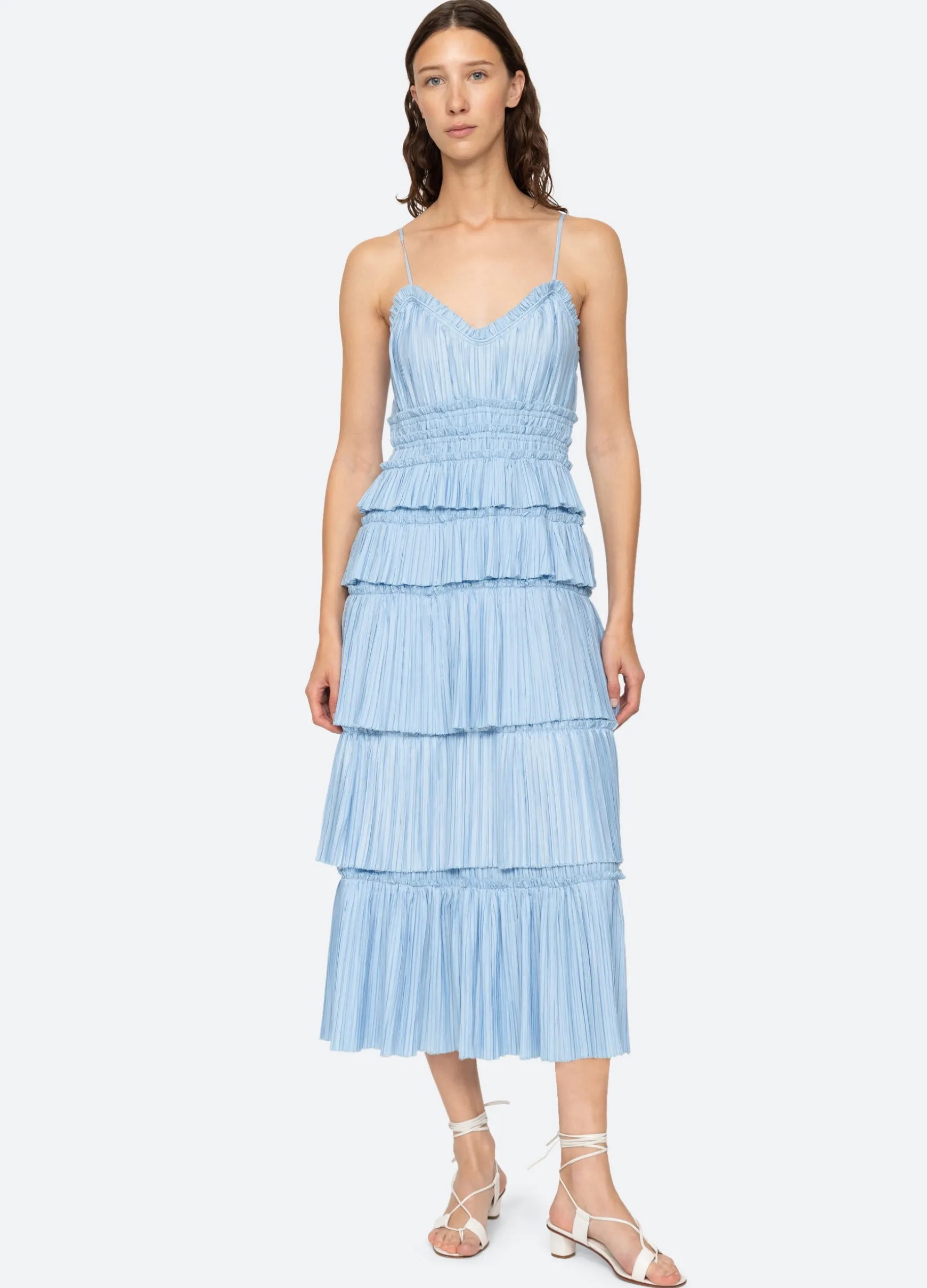 The Parcie crinkle dress features ruffle trim, tiered skirt and raw edge detailing.