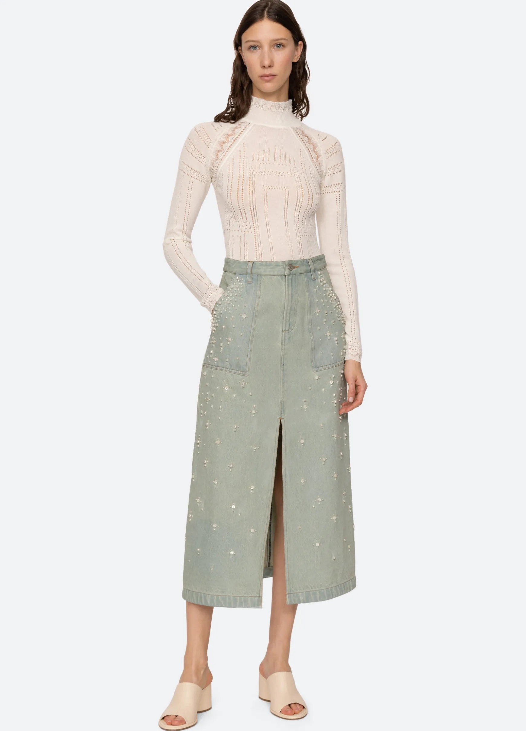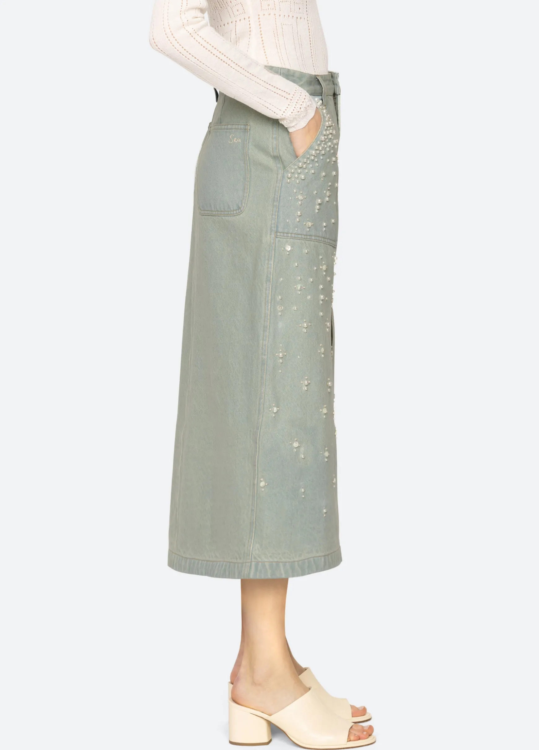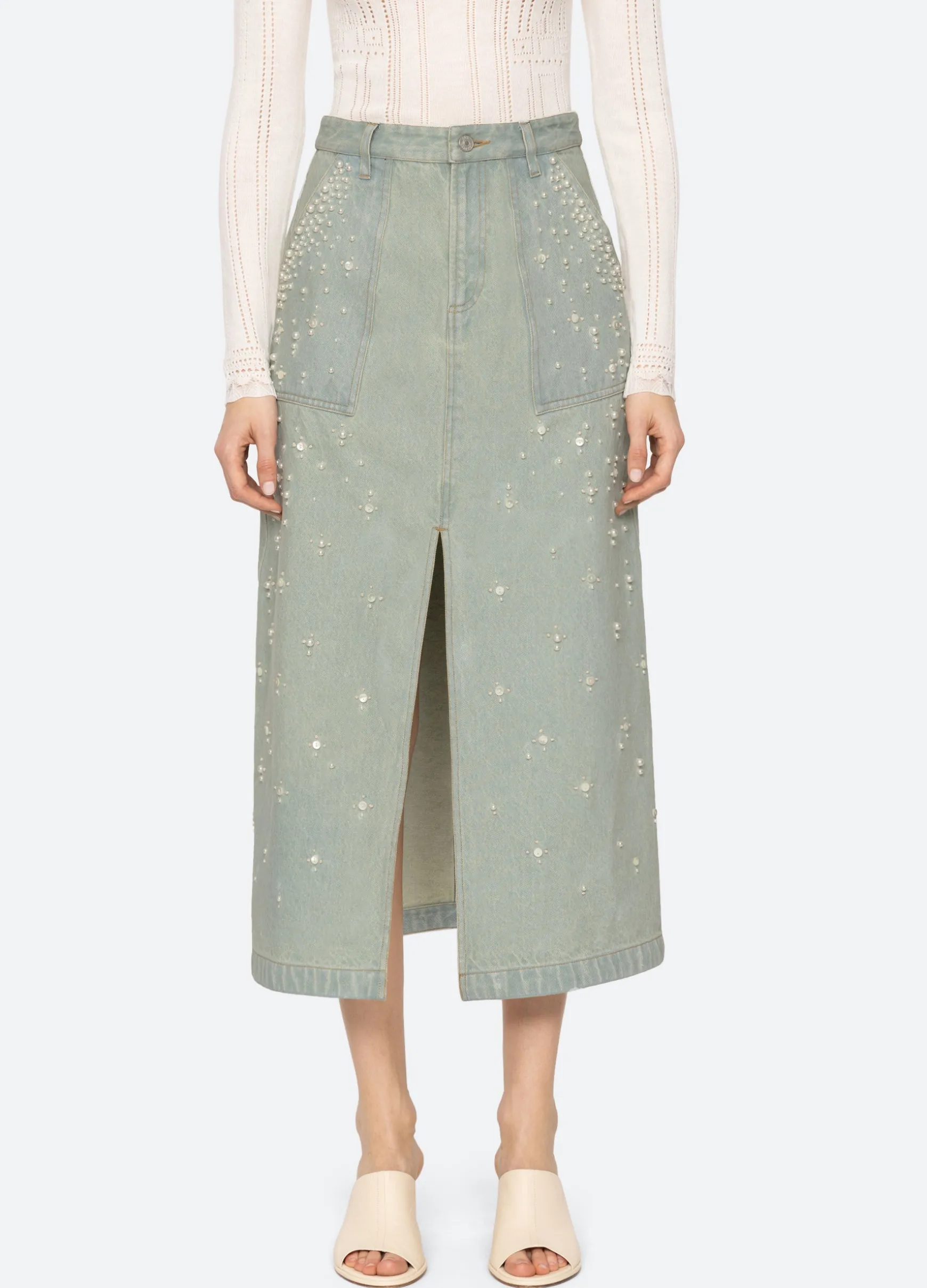 The Perlette denim skirt features a high rise waist, front slit, and is embellished with beads and pearl accents.