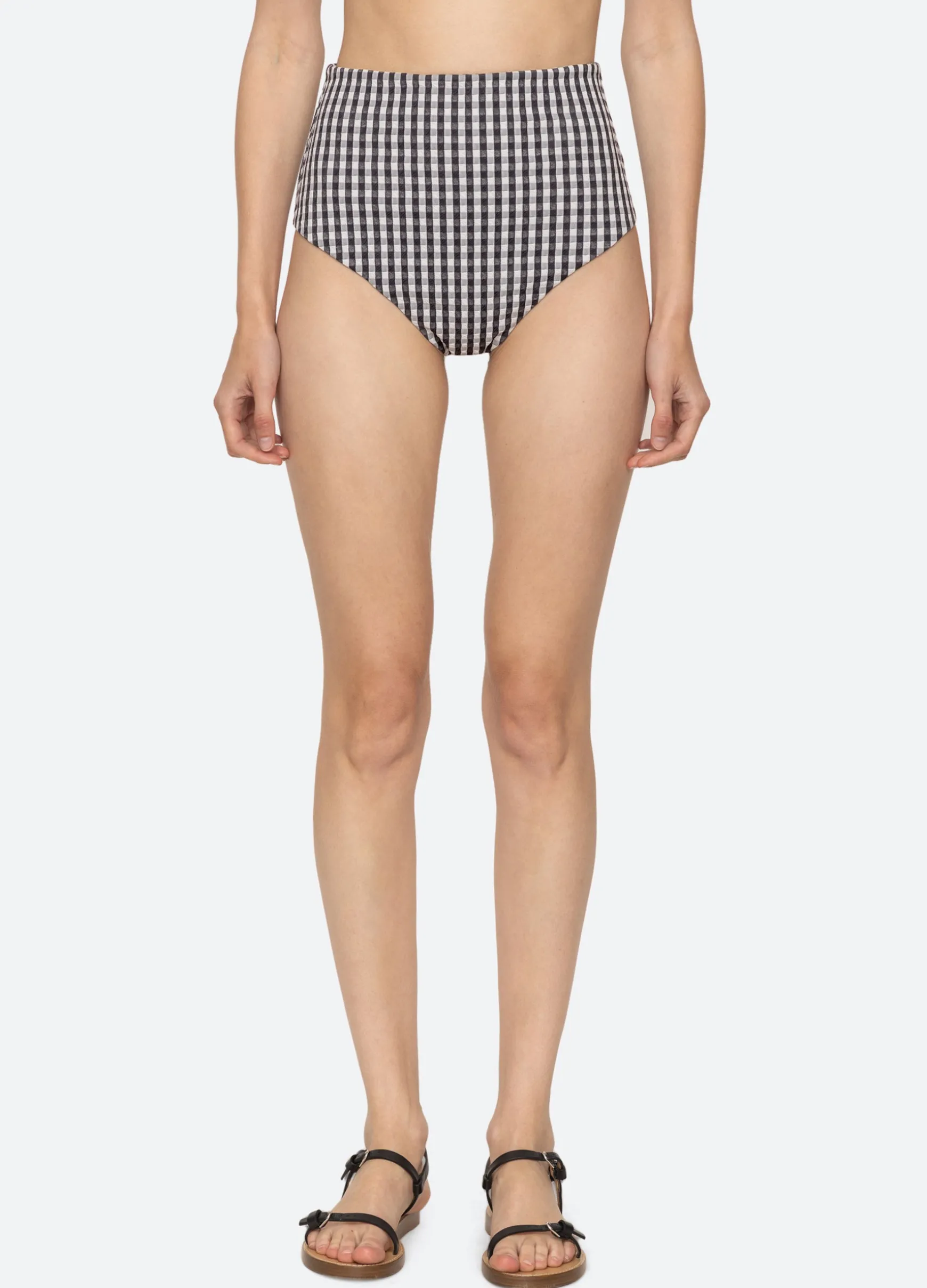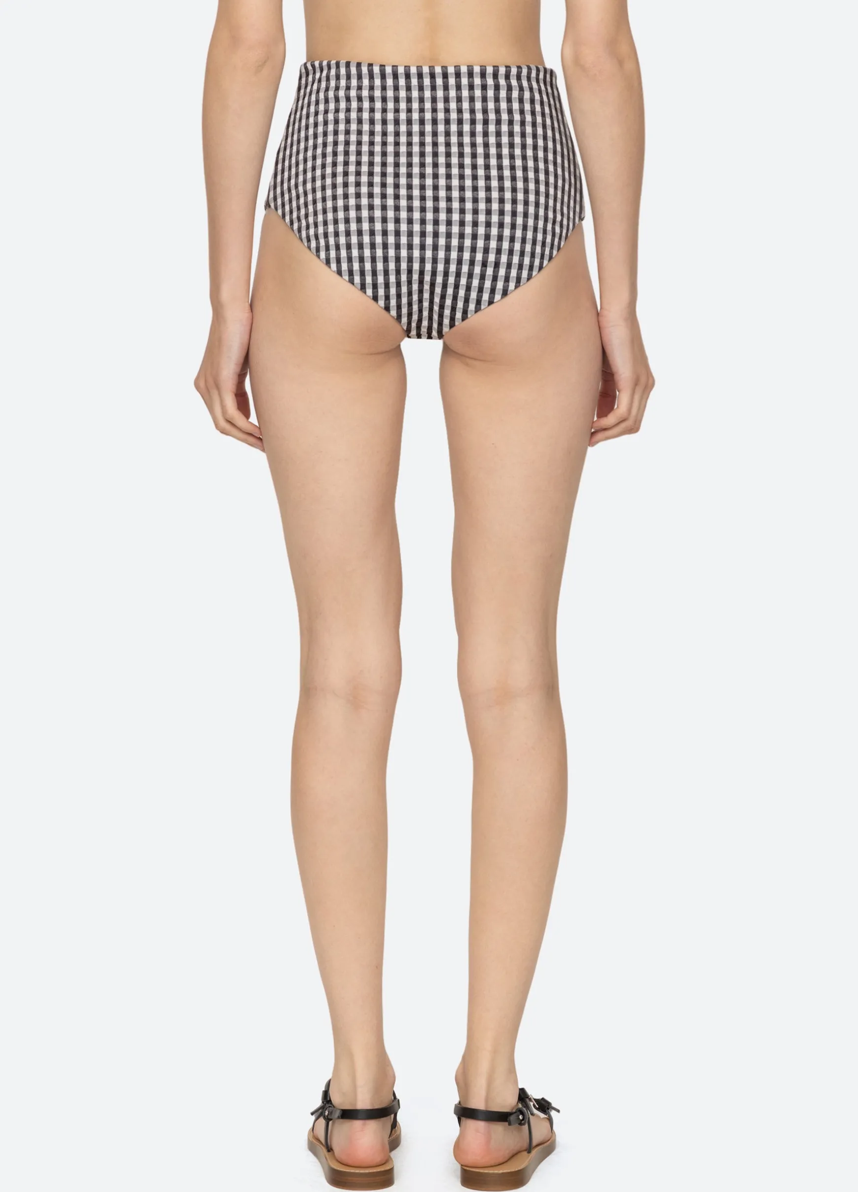 The Pucker gingham smocked bikini bottom features a high waisted silhouette, textured fabric and classic gingham print.