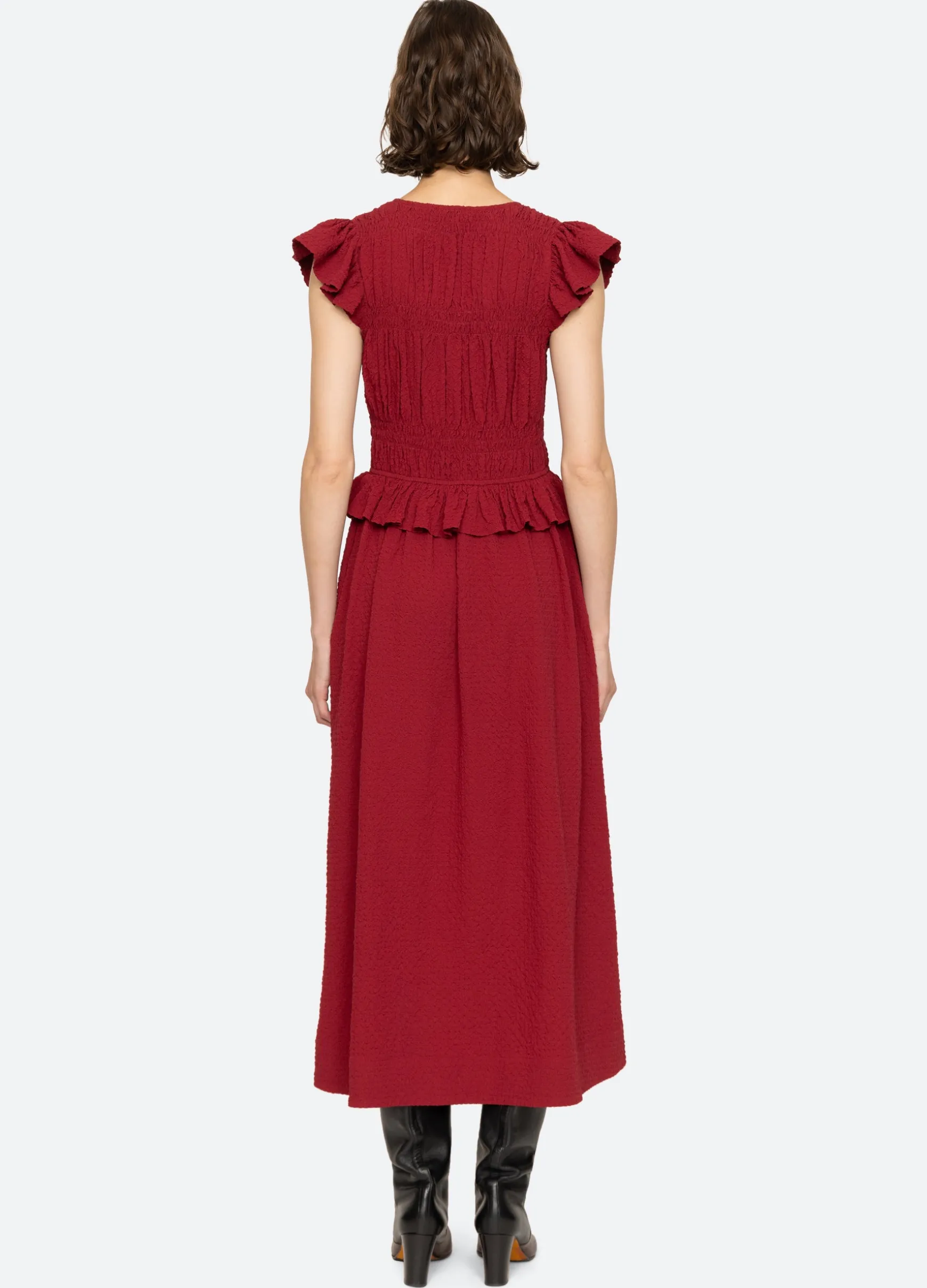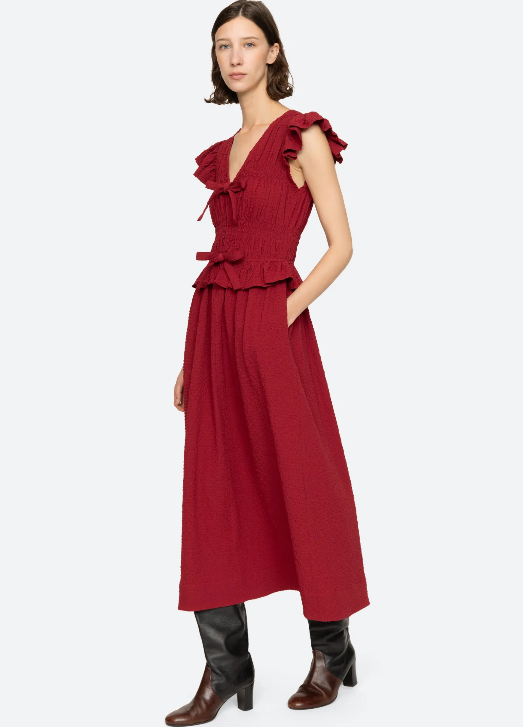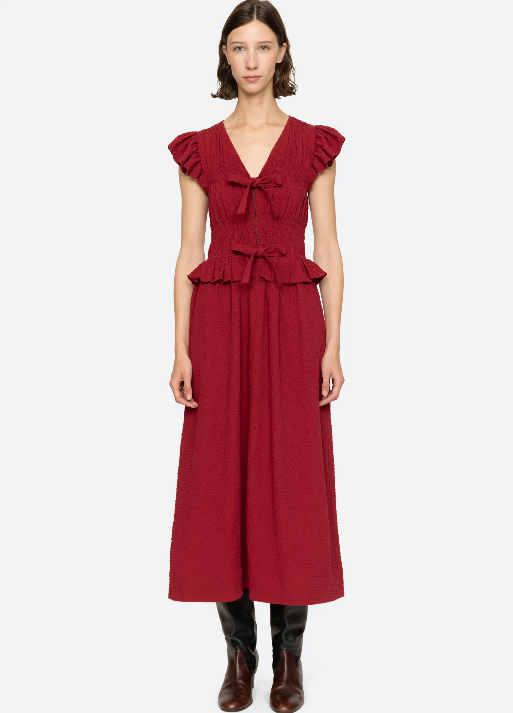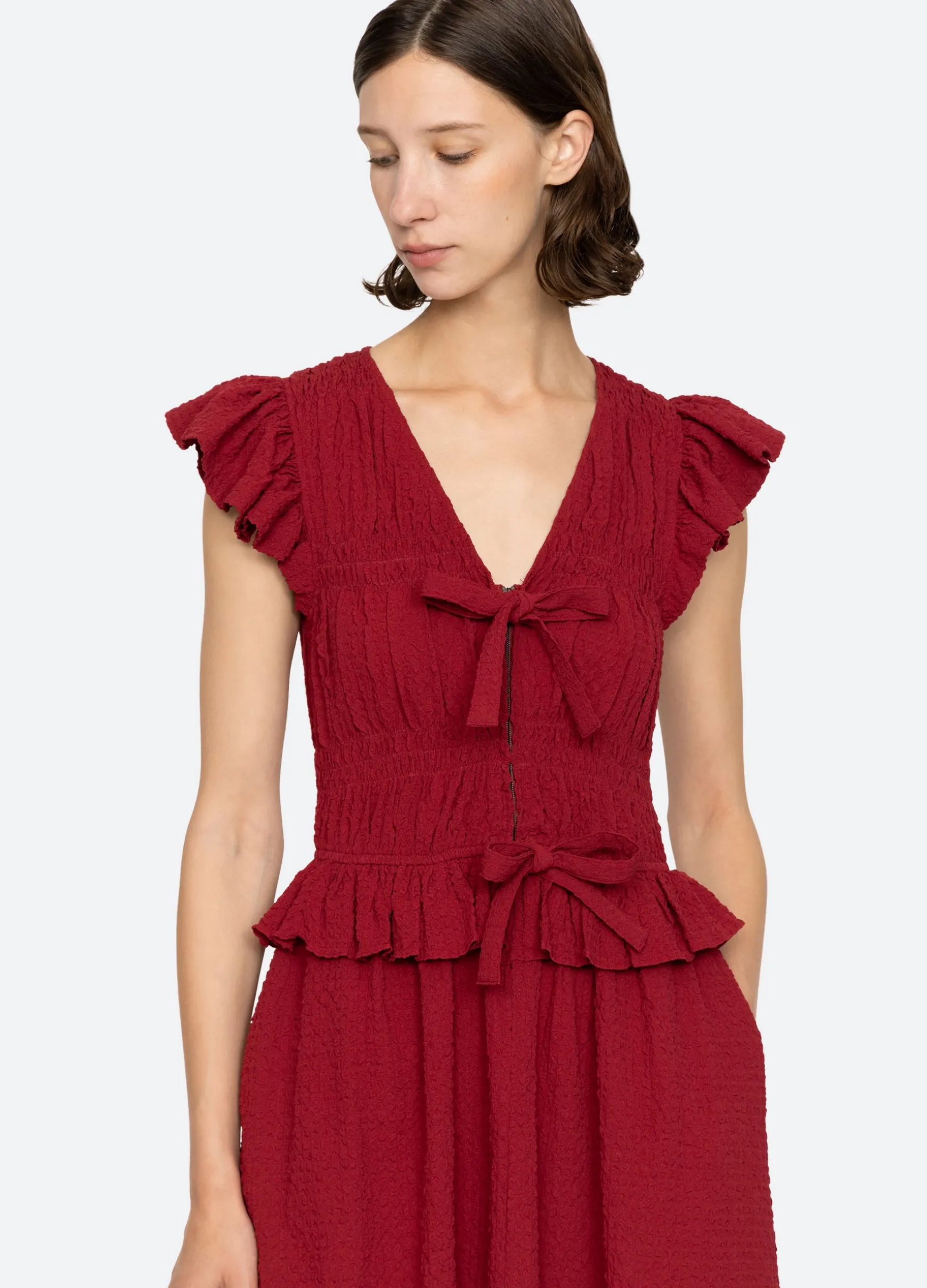 The Regina seersucker dress features a v-neckline, flutter sleeves, ruffle detailing and front tie closures.