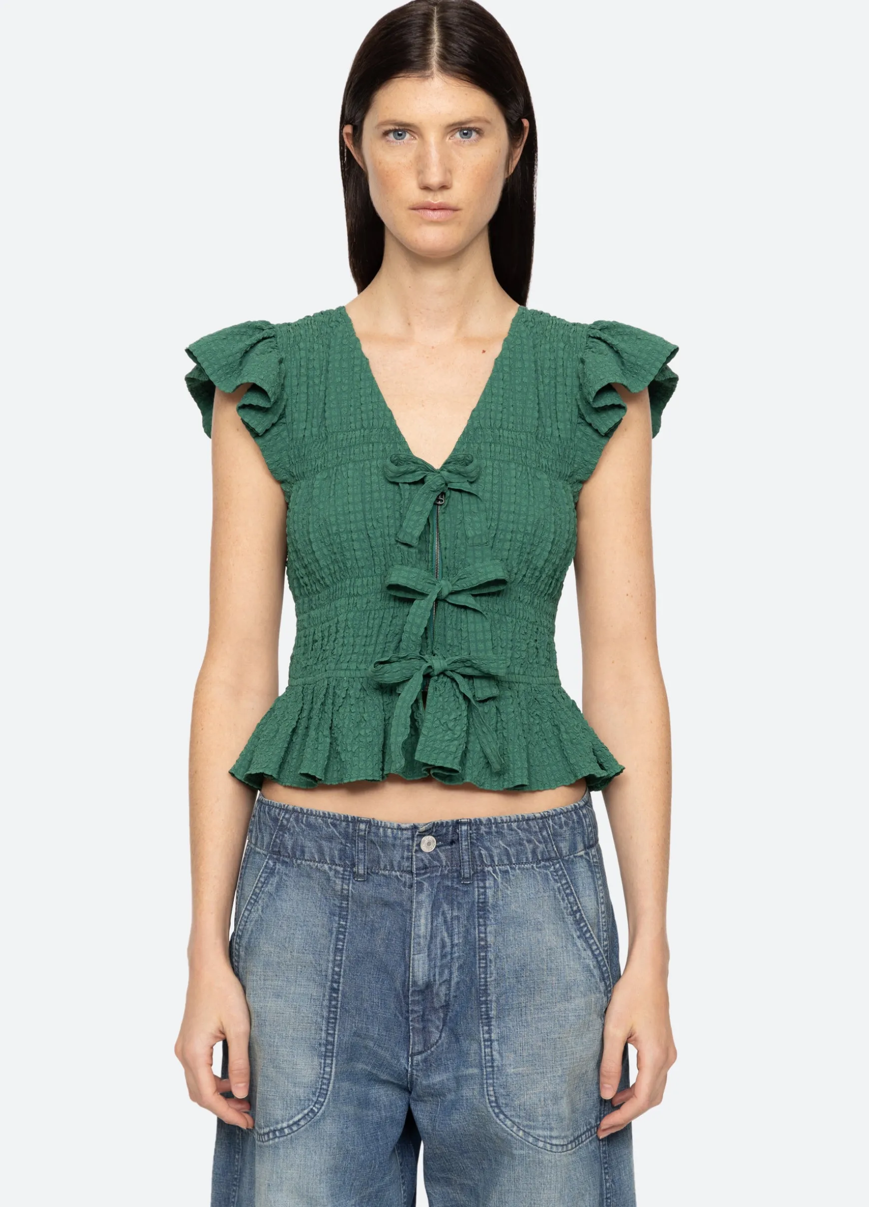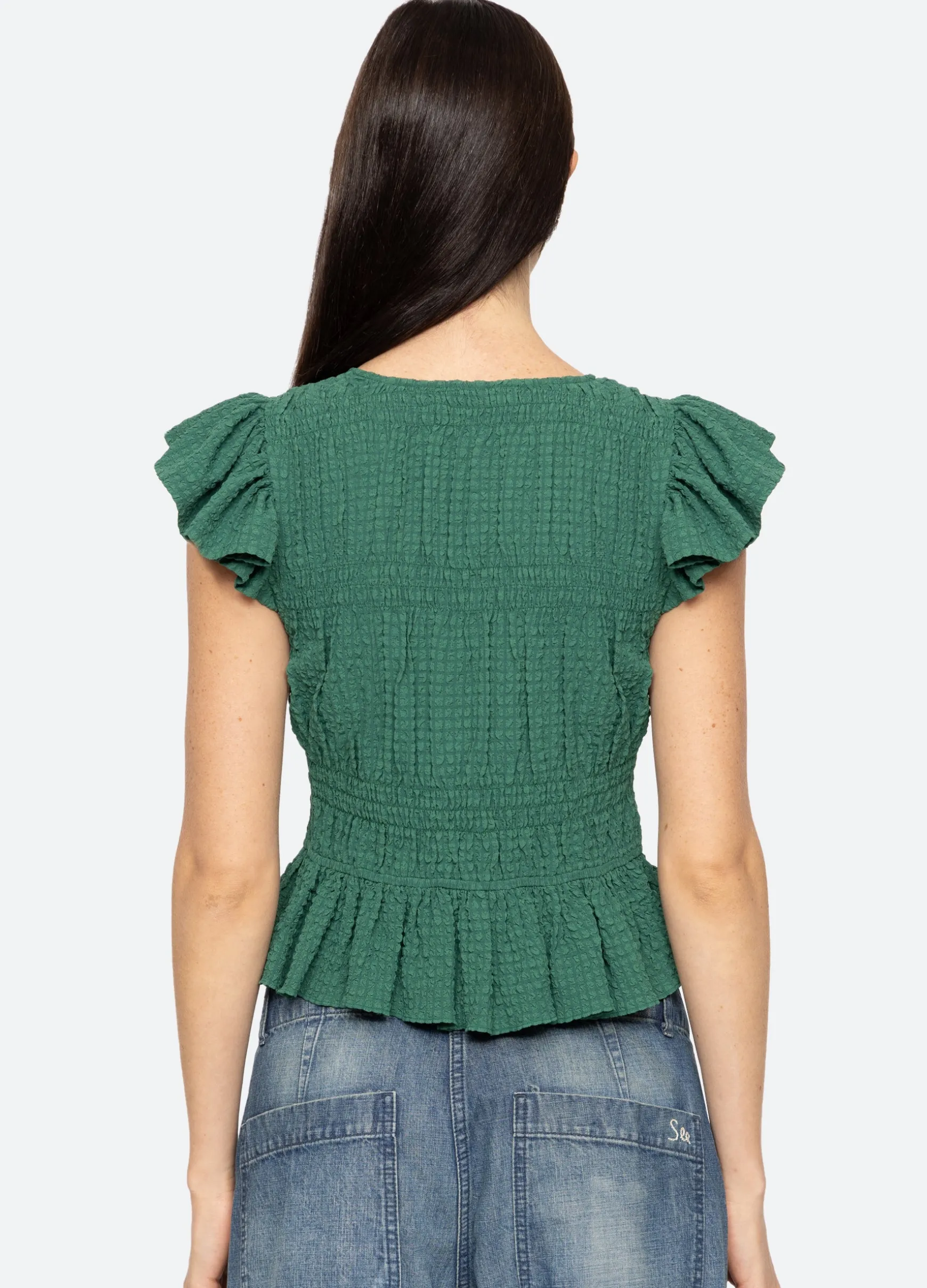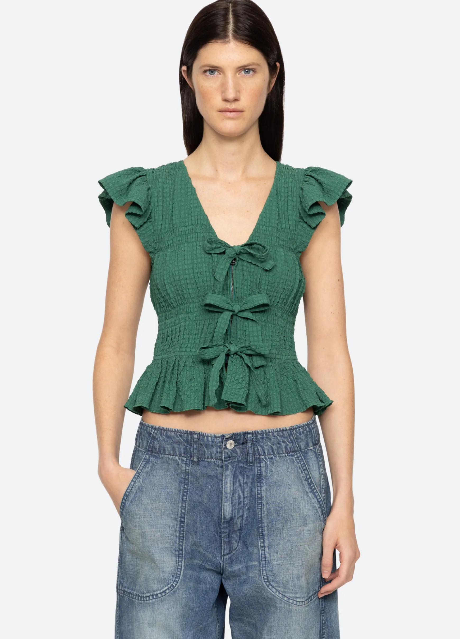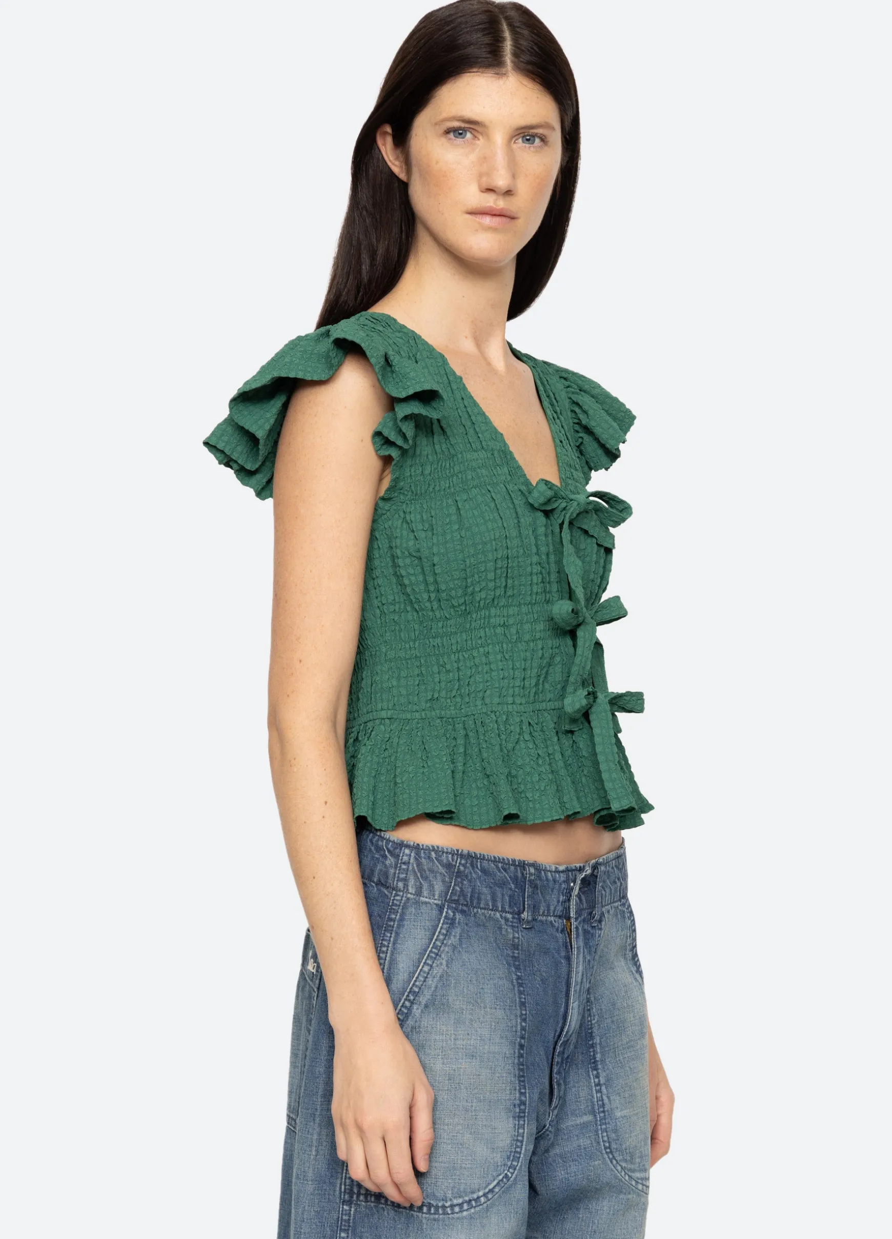 The Regina seersucker top features flutter sleeves and front tie front closures.
