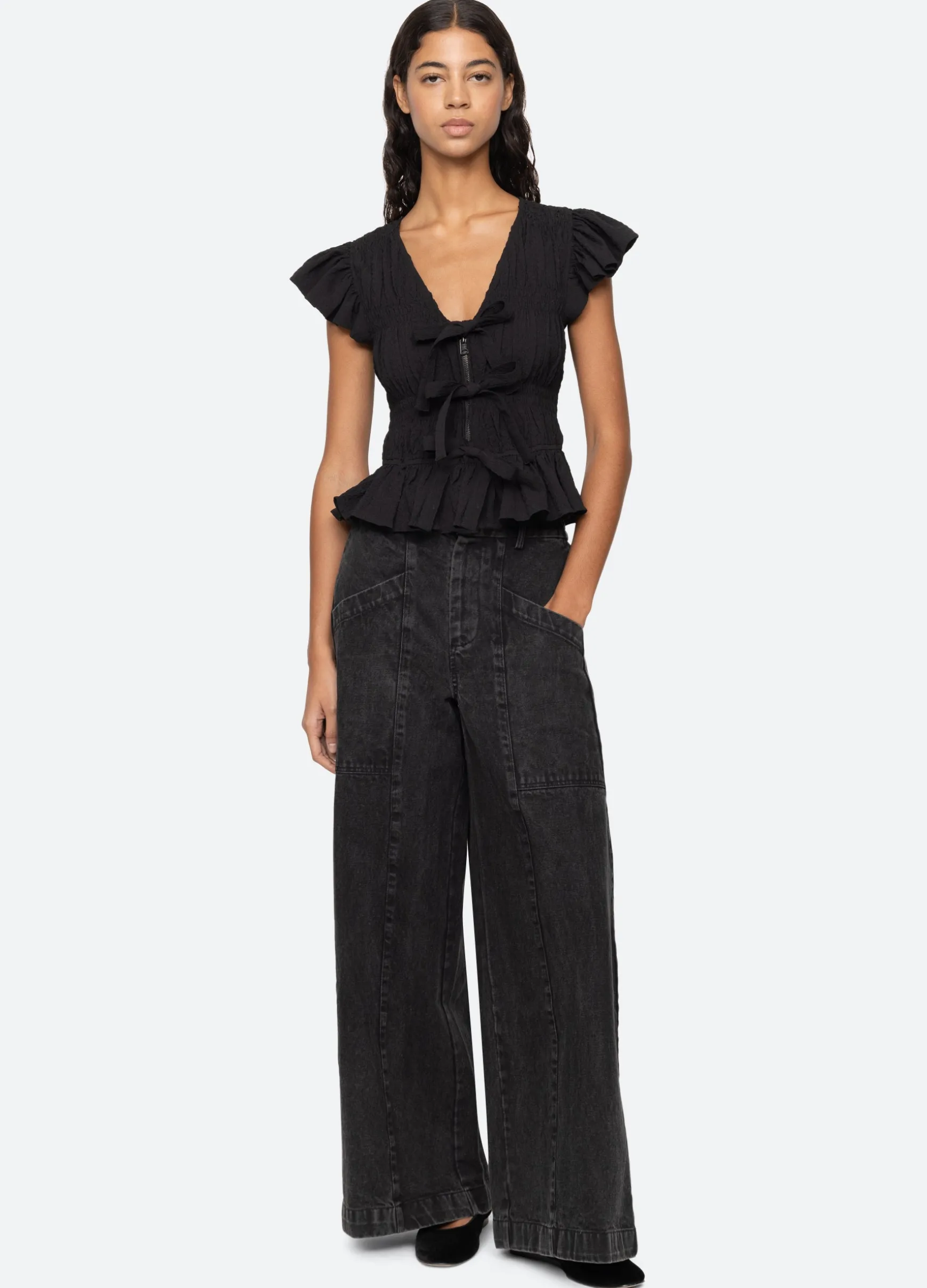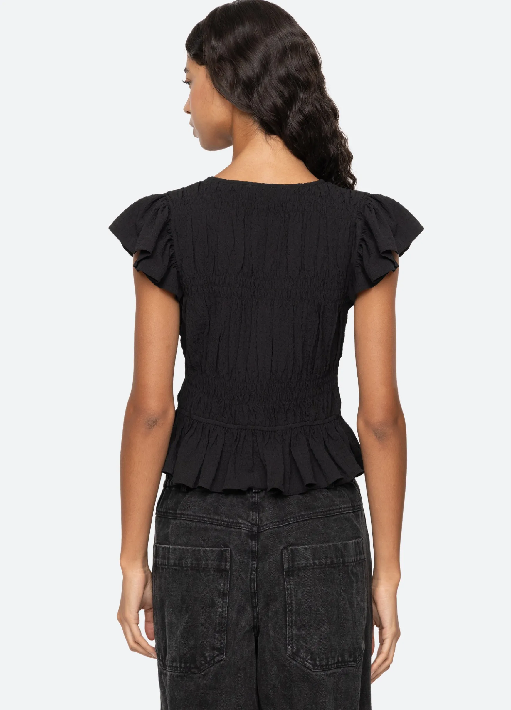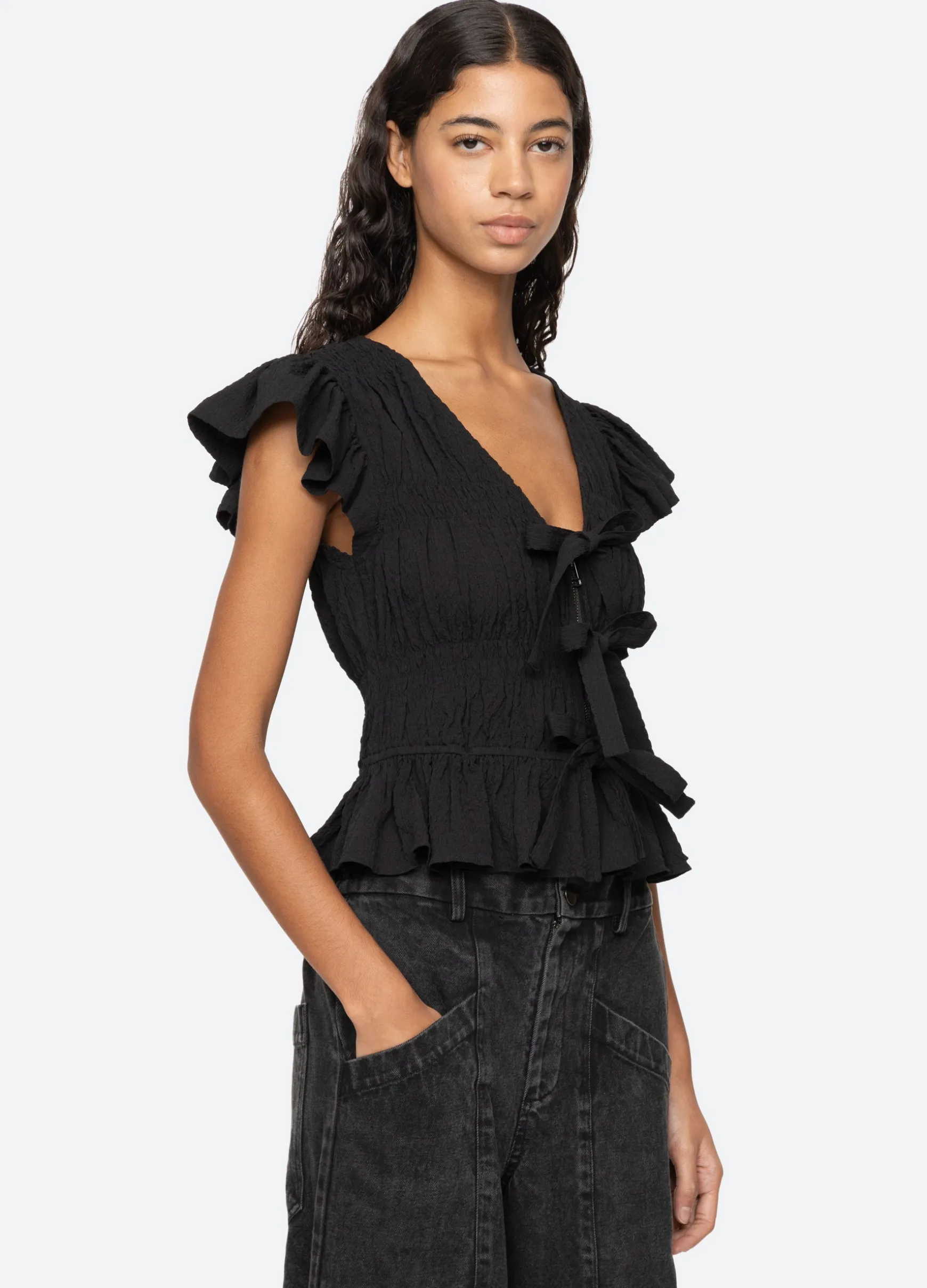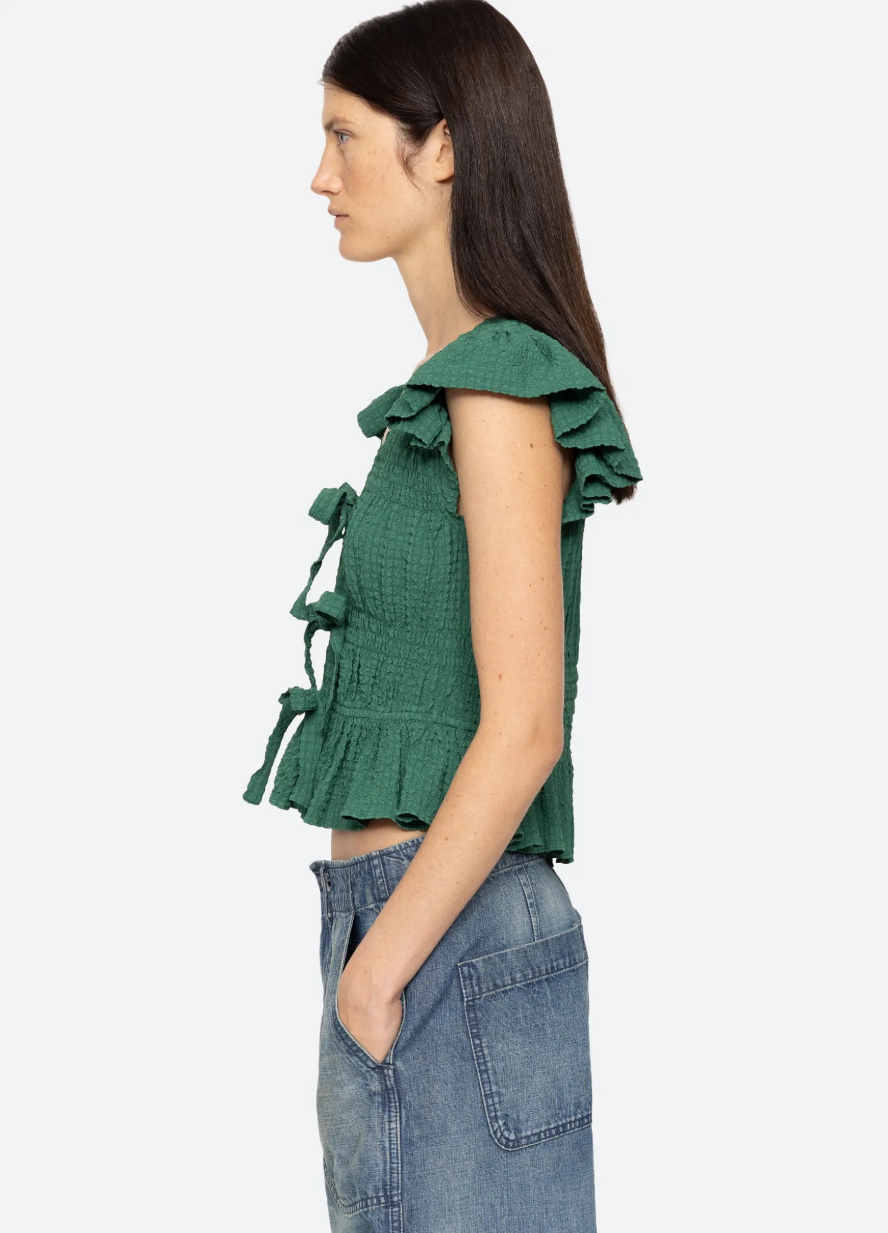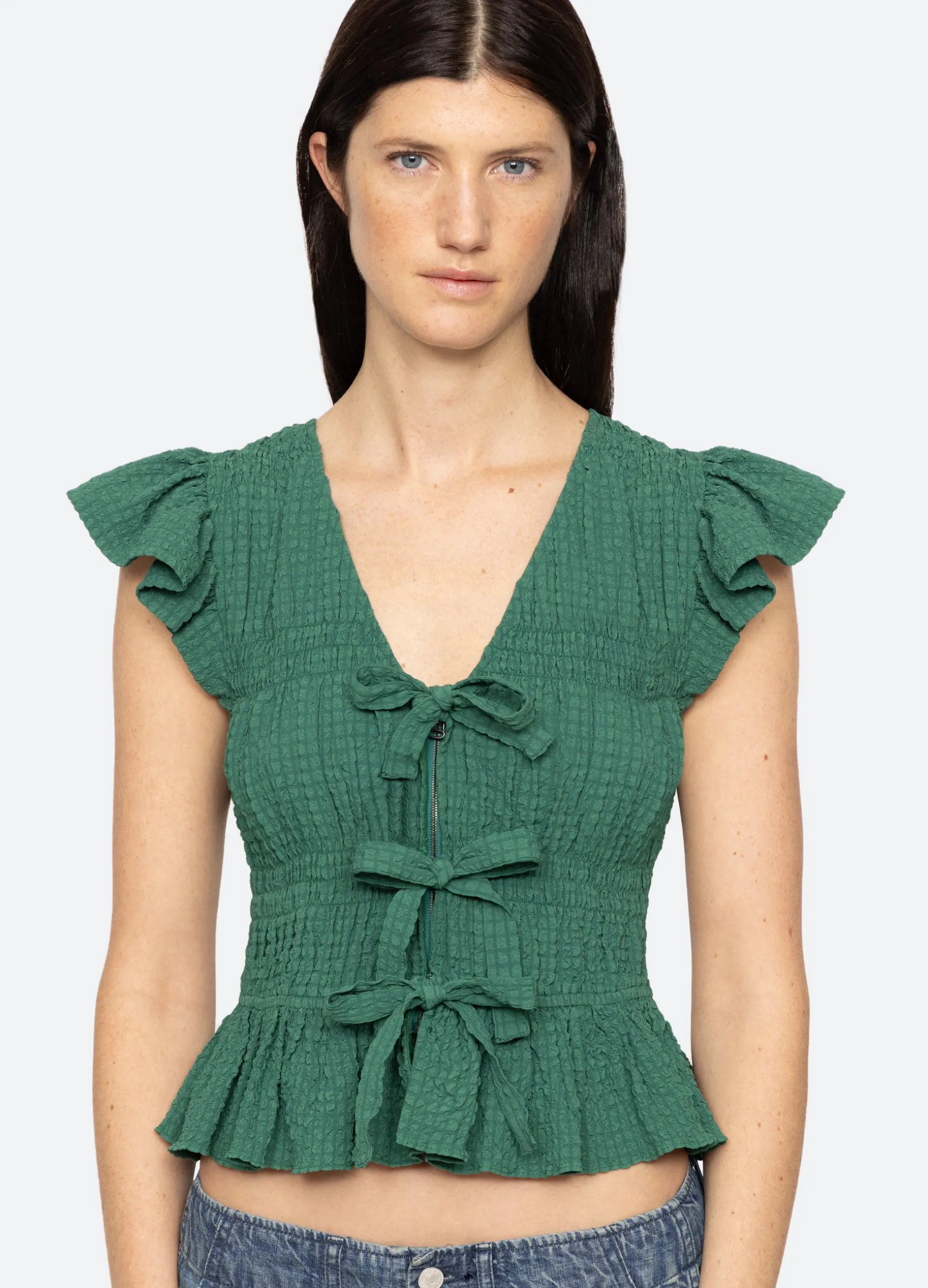 The Regina seersucker top features flutter sleeves and front tie front closures.
