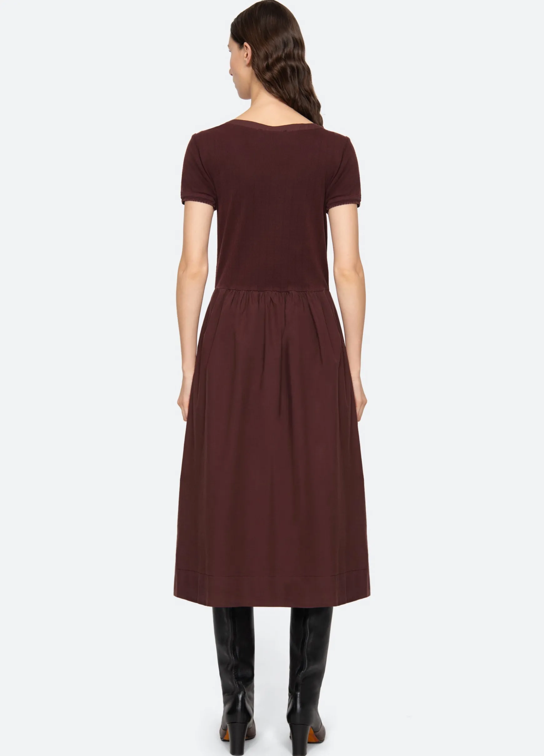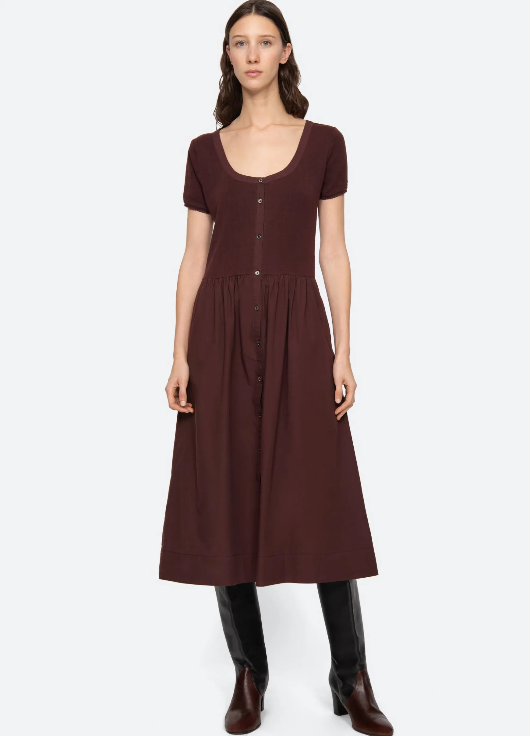 The Renata dress features short sleeves, ribbed bodice and button front closure.