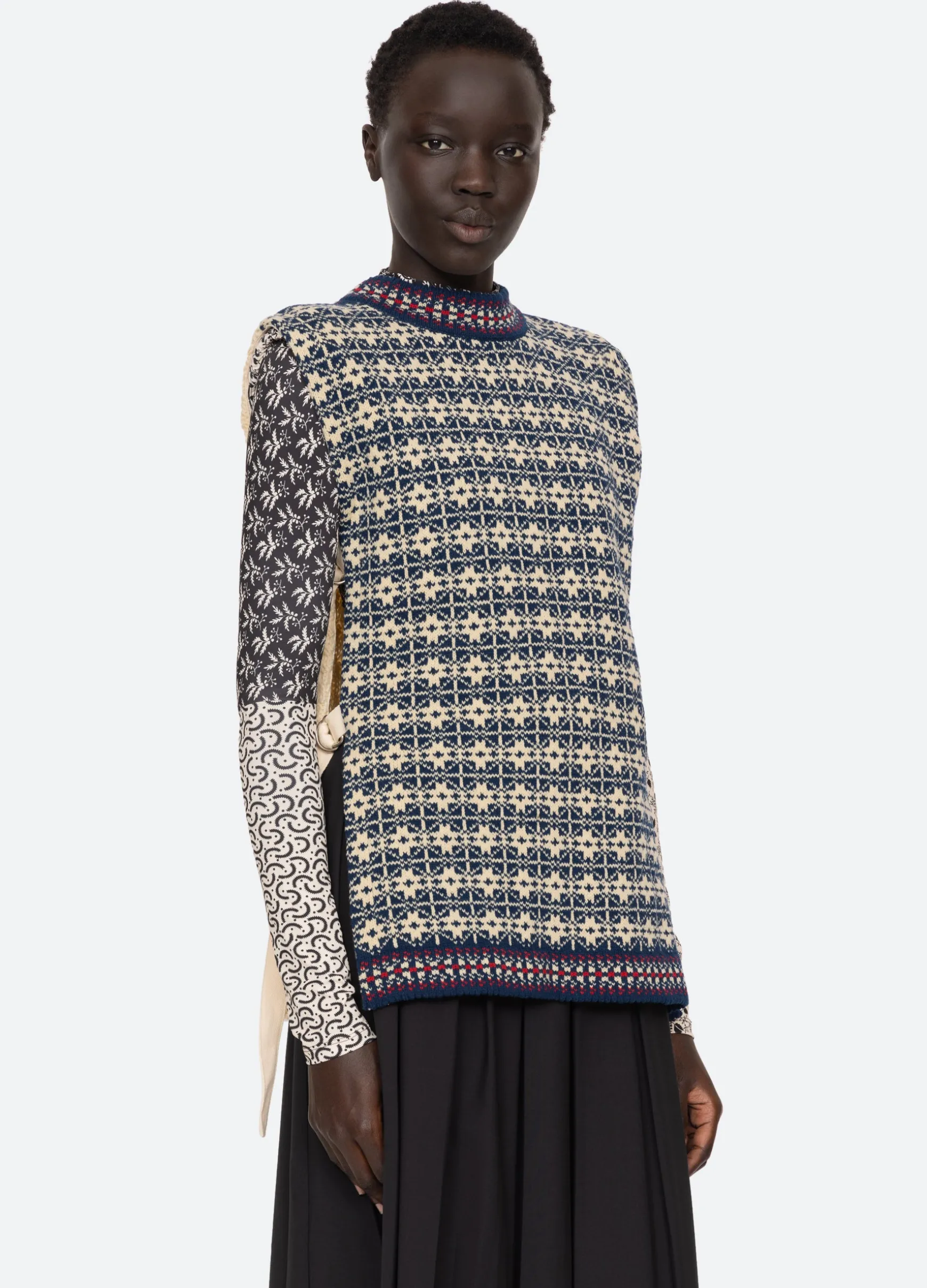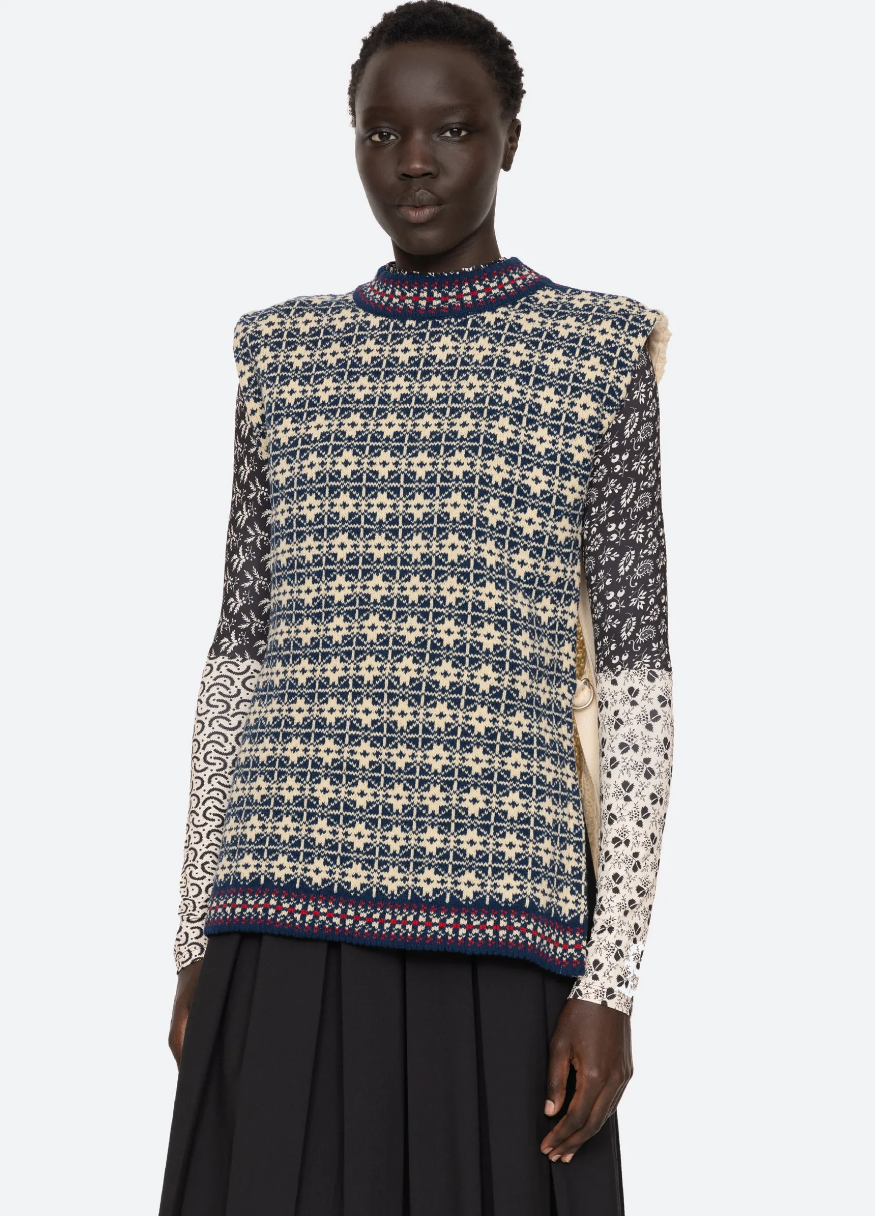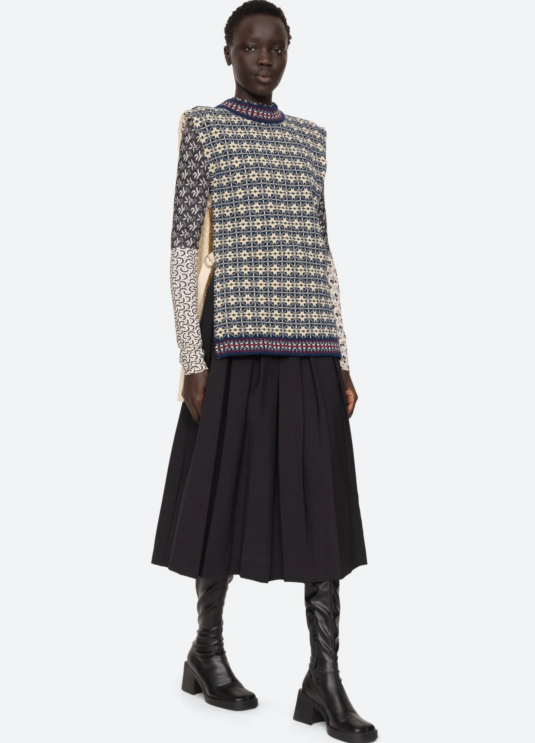 The Rory knit sweater vest features a fair isle pattern on the front, solid cable knit on the back, high neckline, and adjustable D-ring tabs.