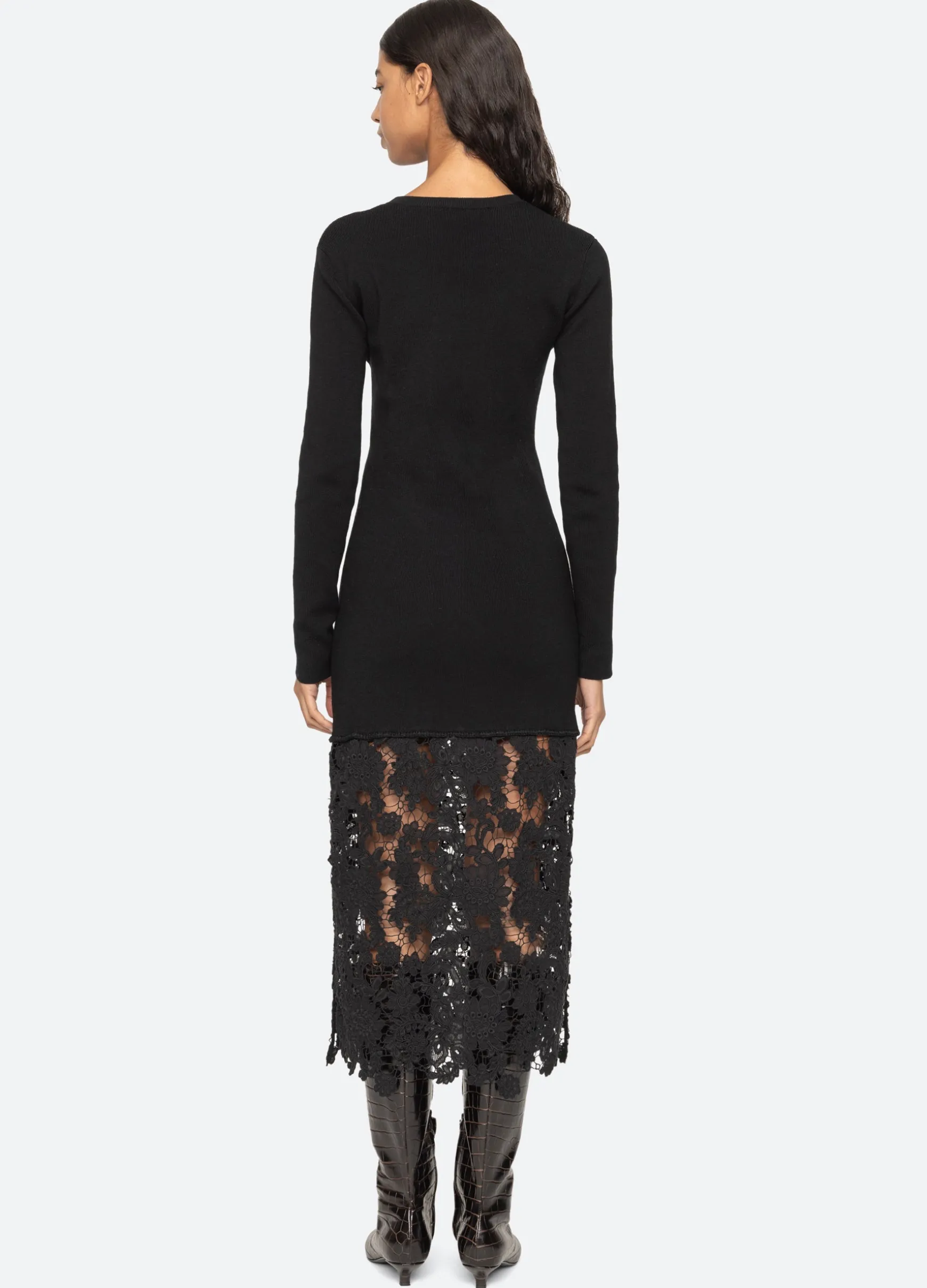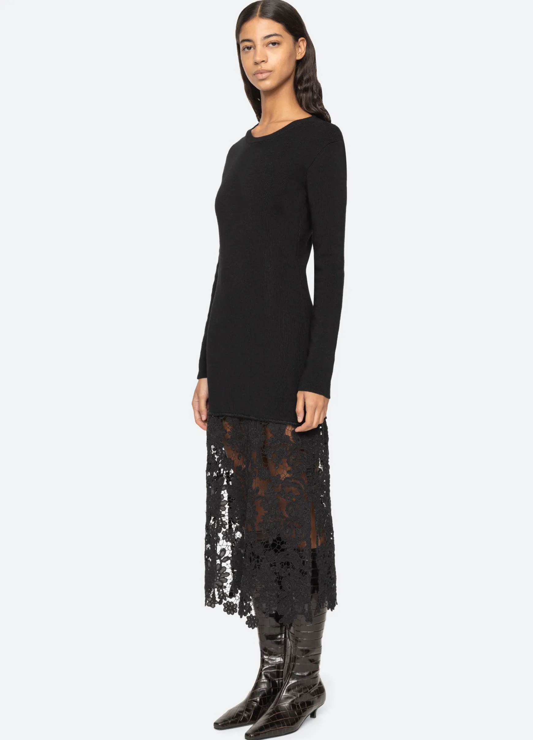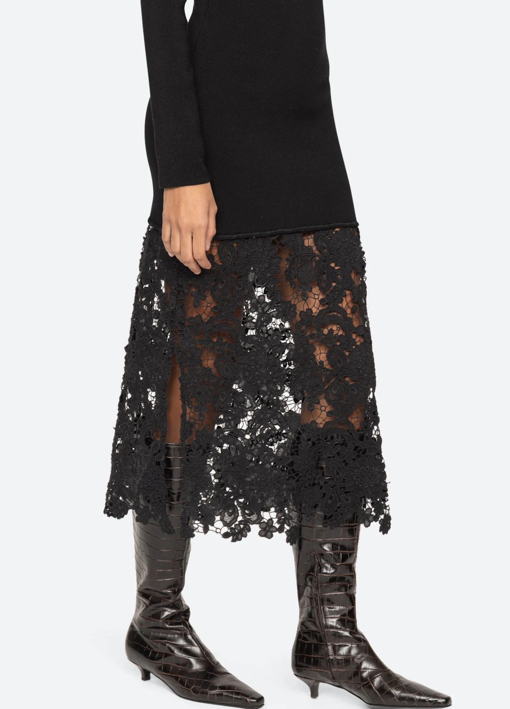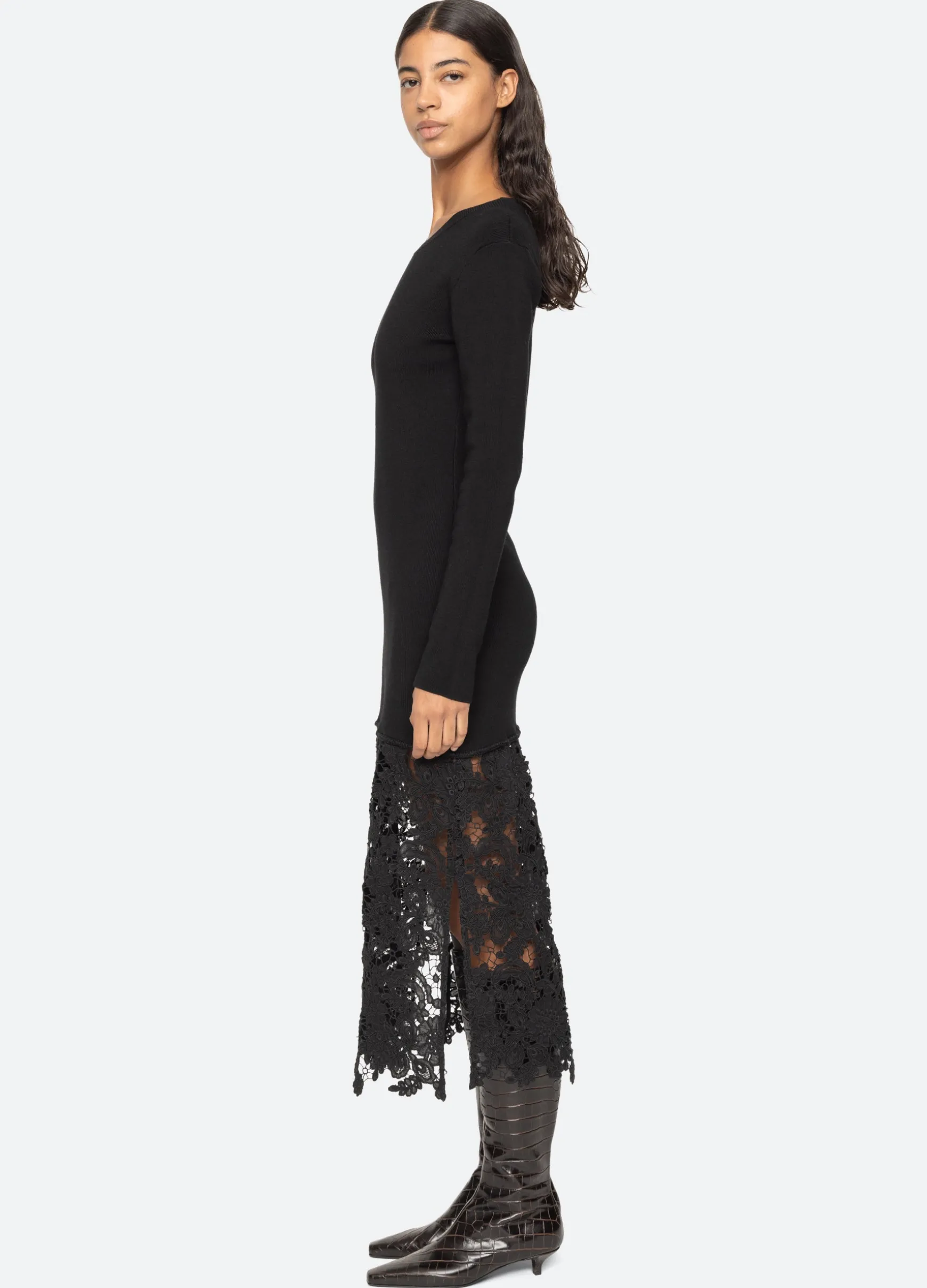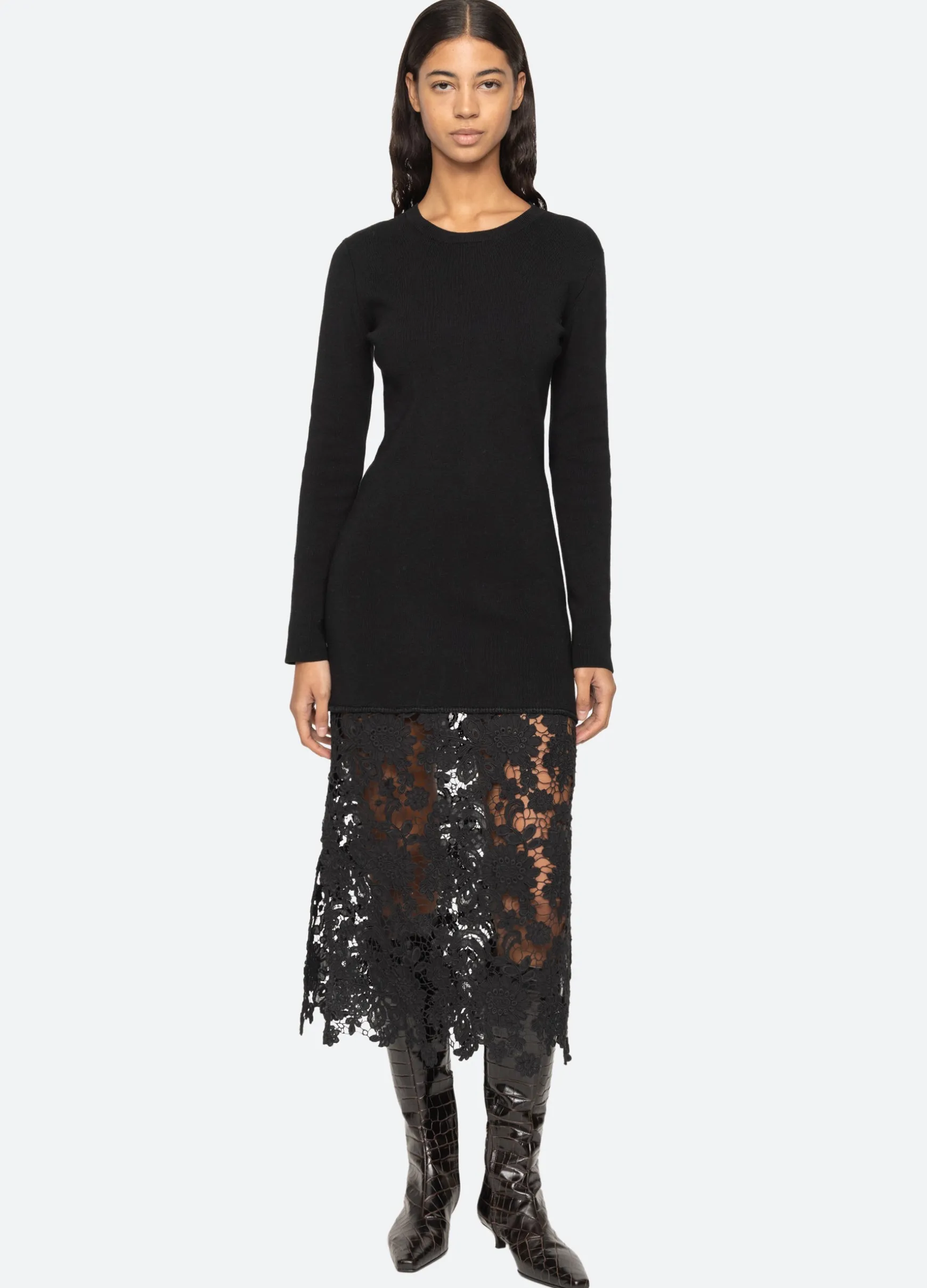 The Sabine embroidered lace combo dress features long sleeves and a sheer applique lace skirt.