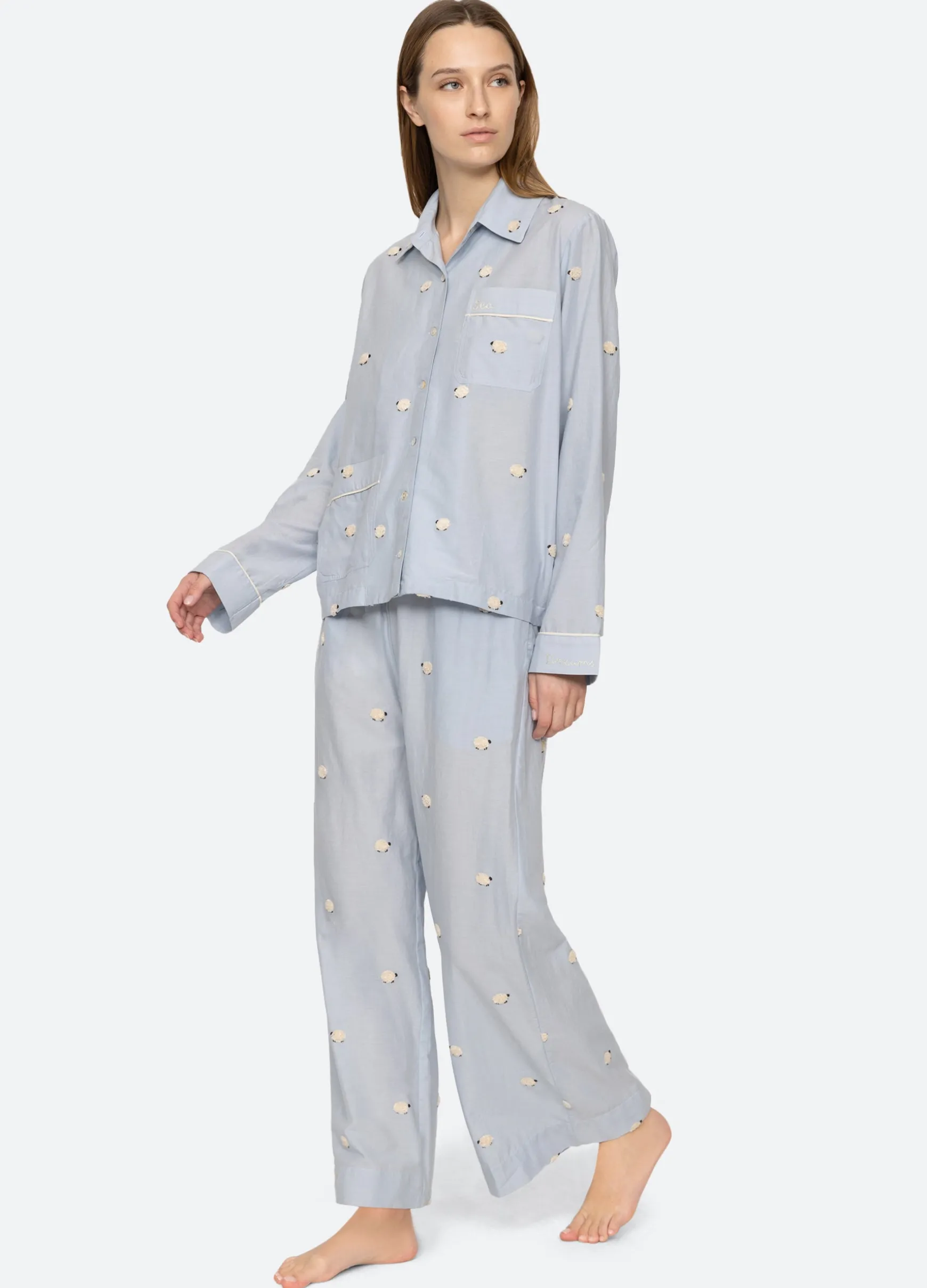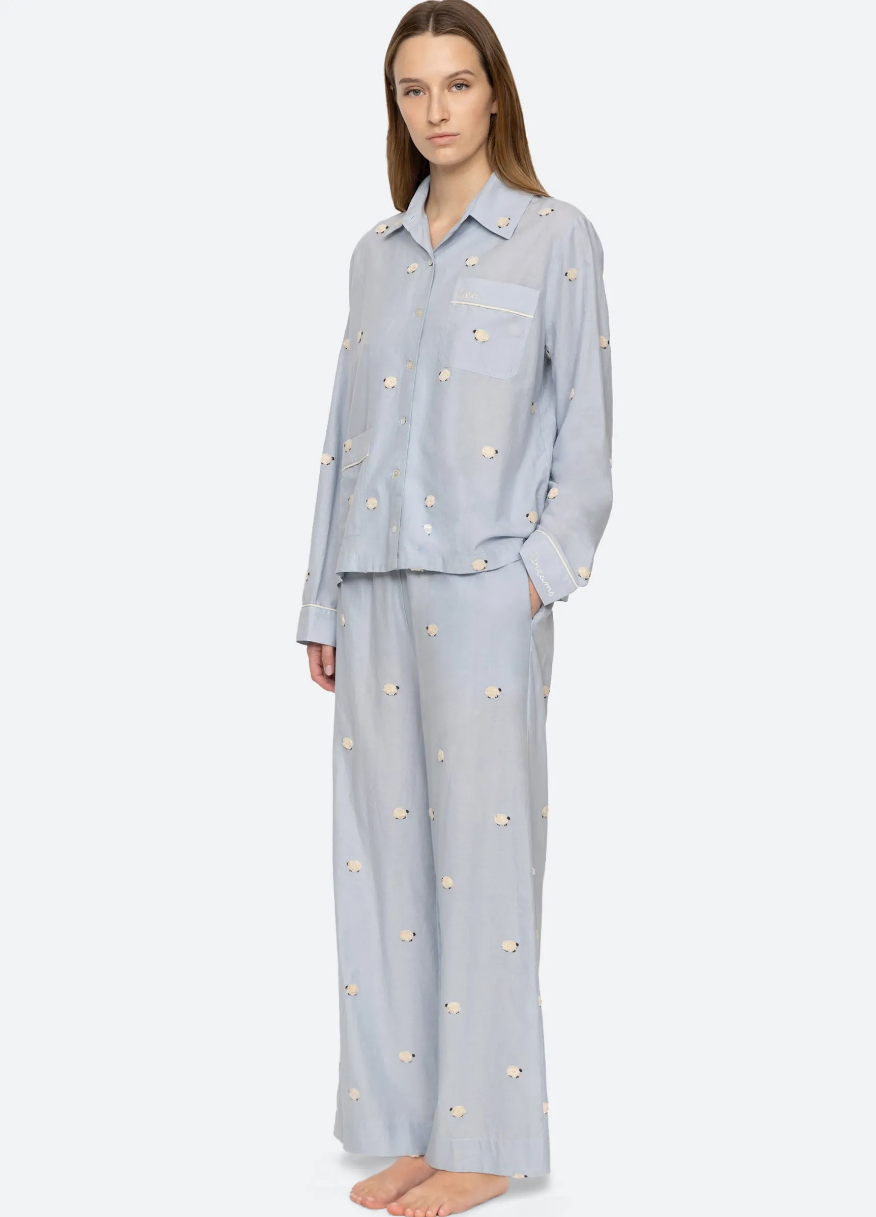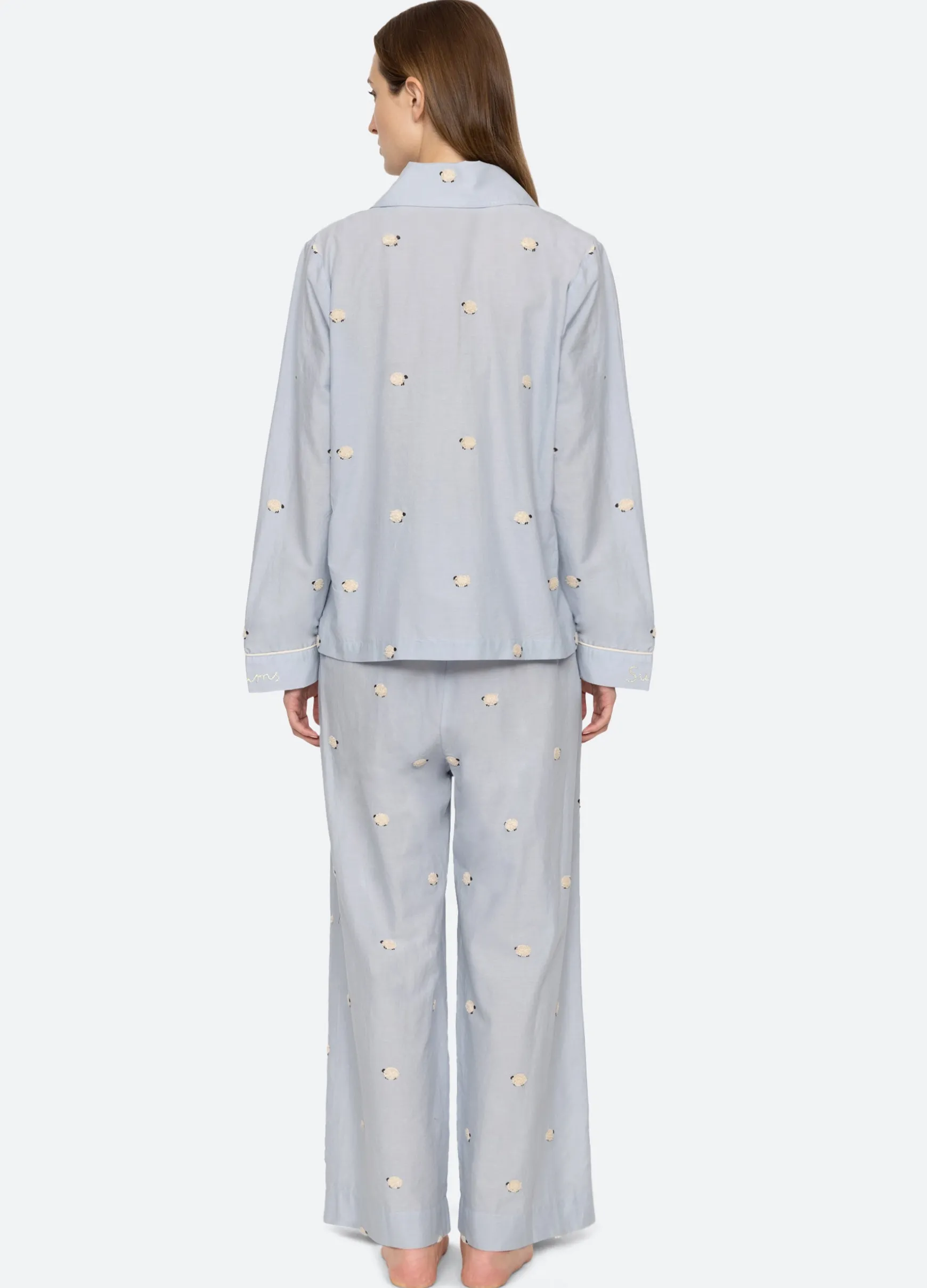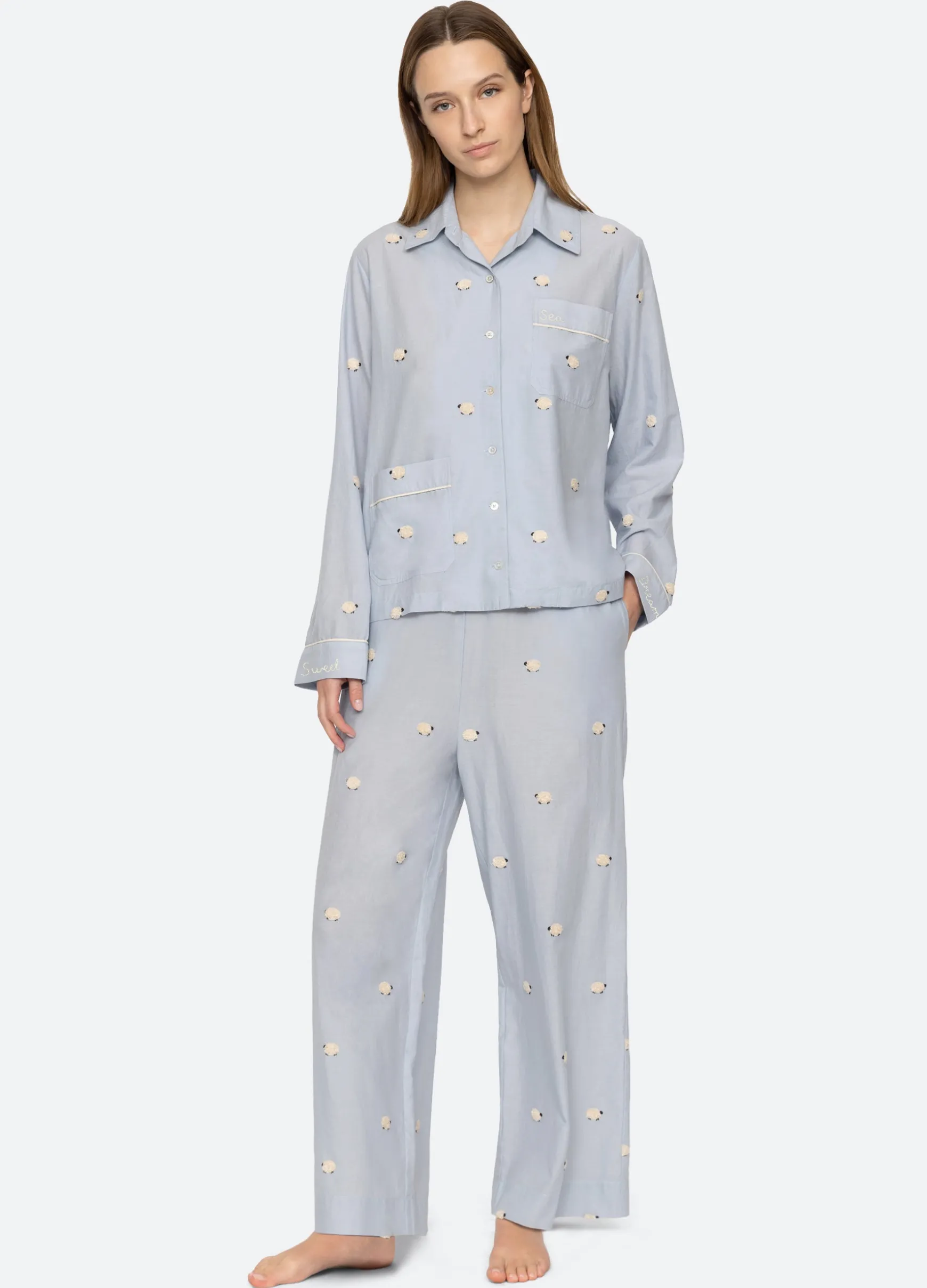The Sheep pajama set features long sleeves, embroidered sheep accents throughout and embroidered “Sweet Dreams” on the cuff.