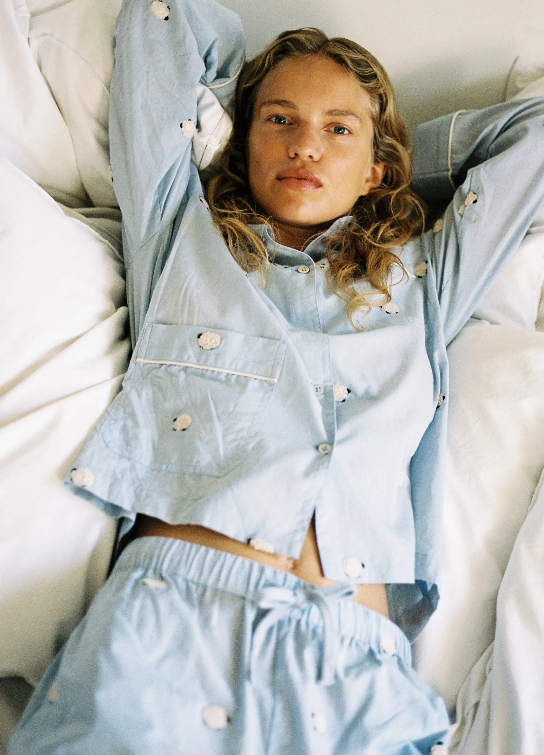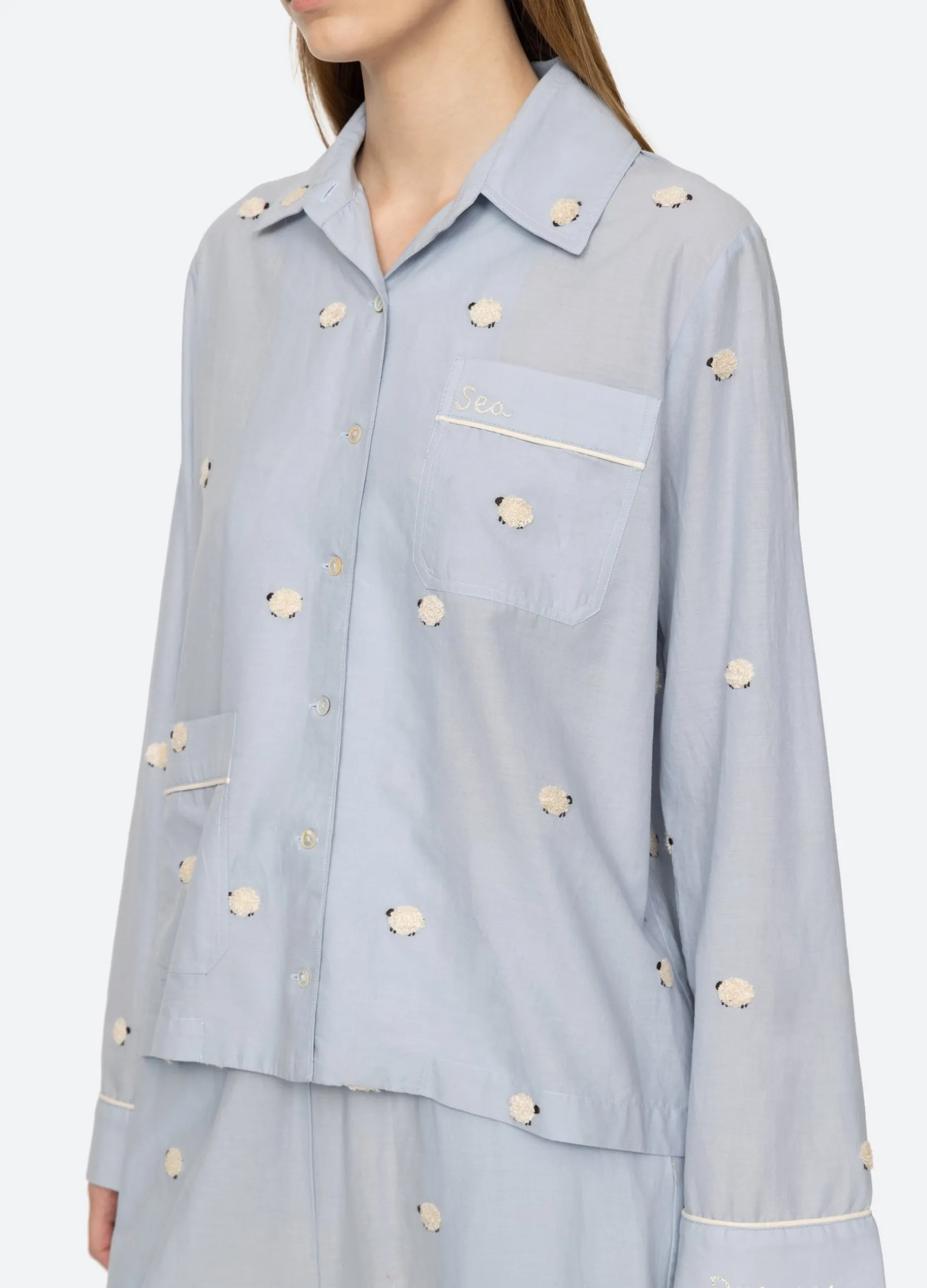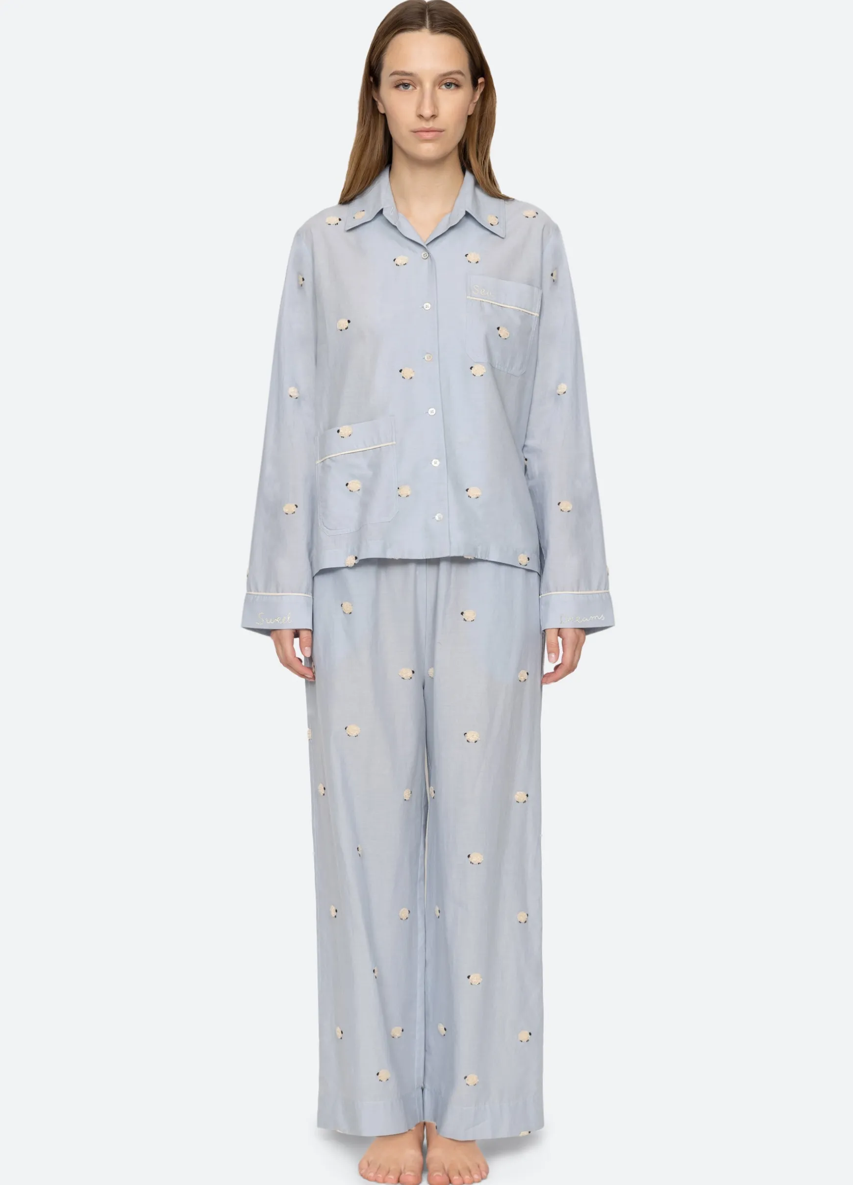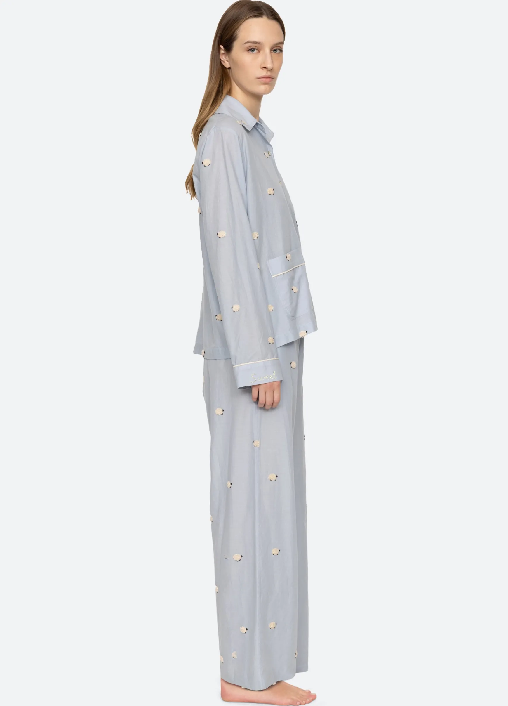 The Sheep pajama set features long sleeves, embroidered sheep accents throughout and embroidered “Sweet Dreams” on the cuff.