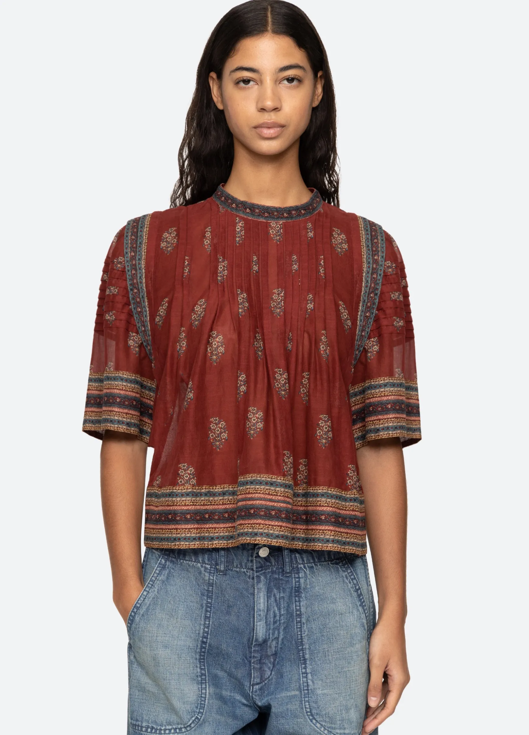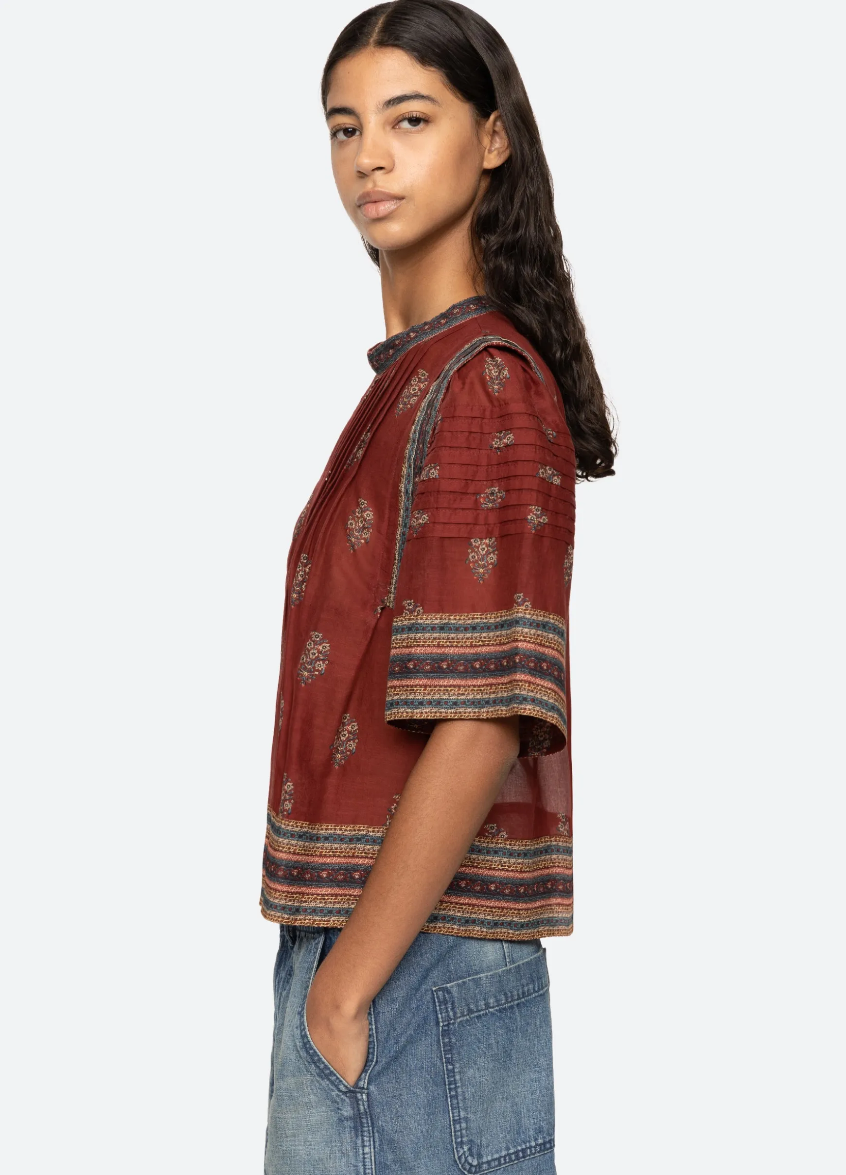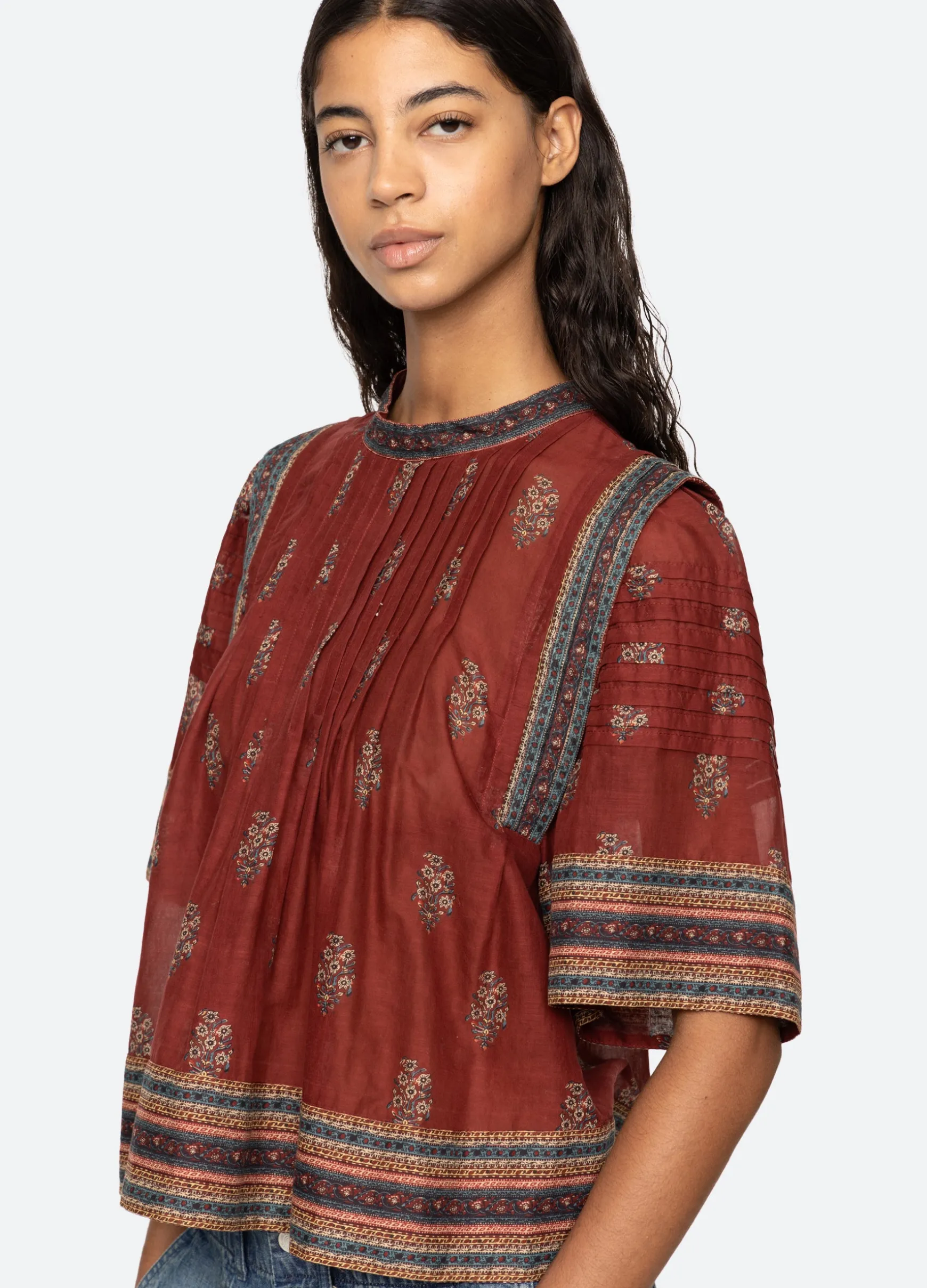 The Sierra floral print border top features pleated detailing, short sleeves and is designed for an easy, relaxed fit.