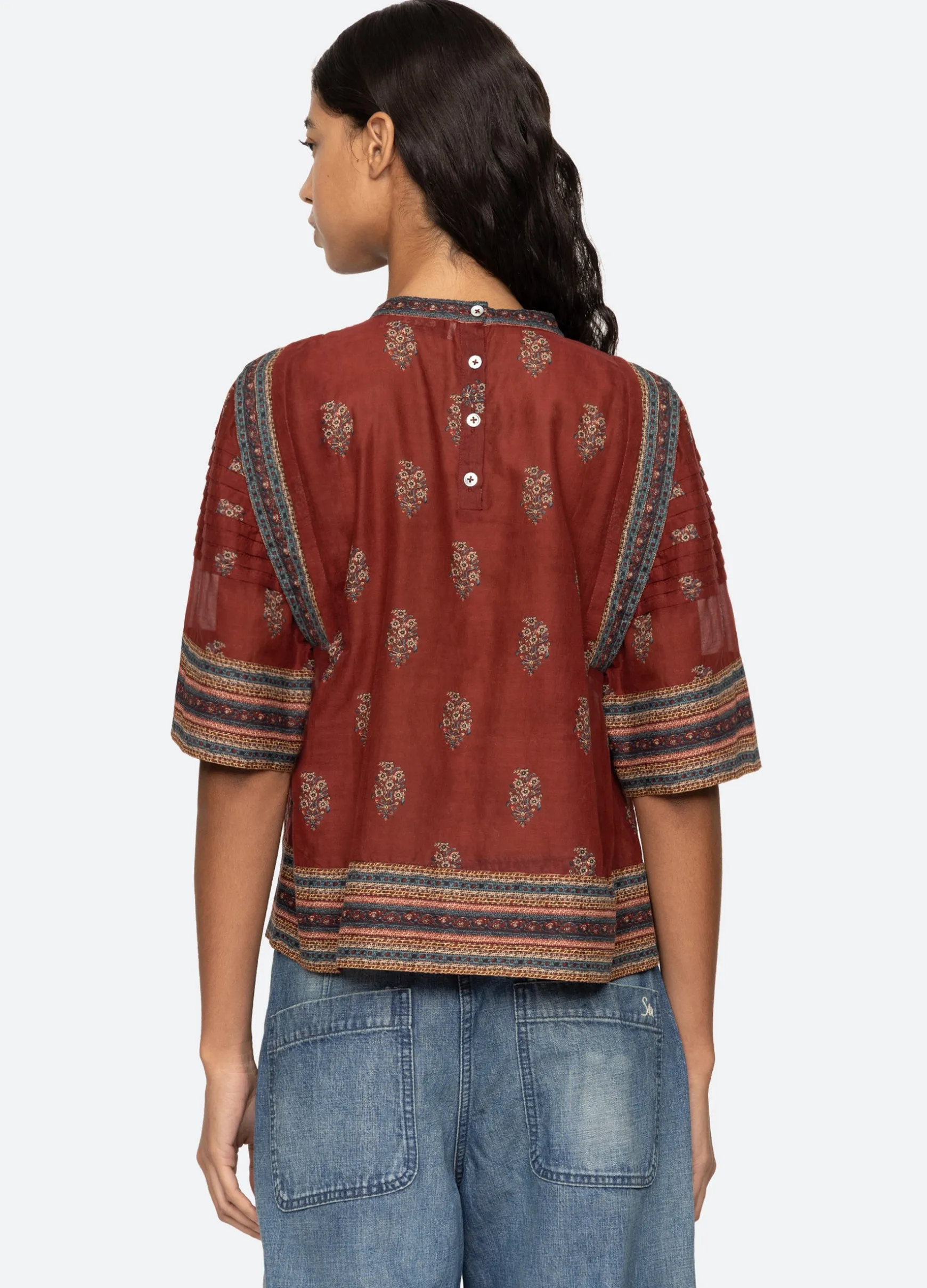 100% cottonbutton back closuredesigned for a relaxed fitmodel is 5’10” and wearing a size SThe Sierra floral print bord…