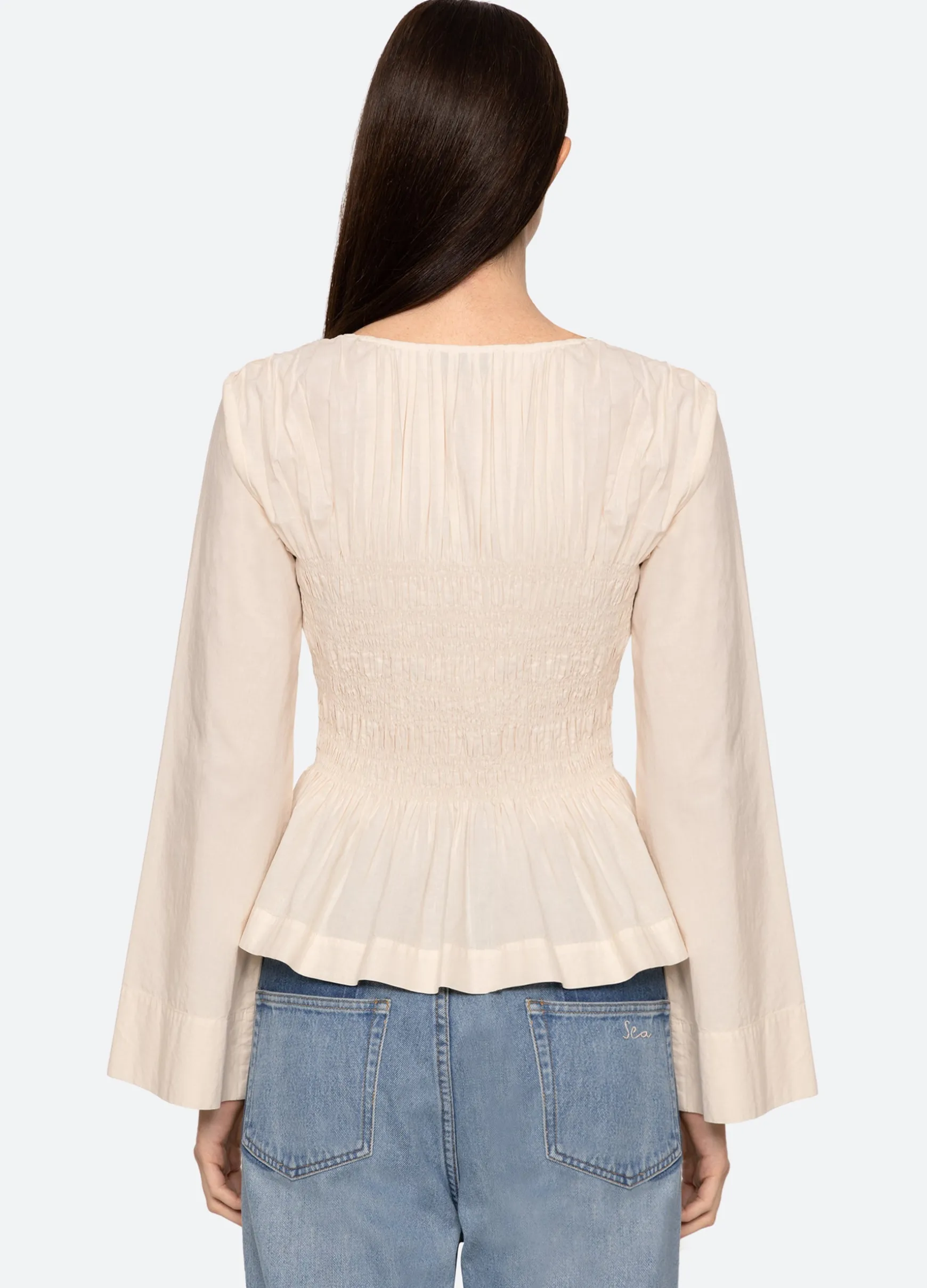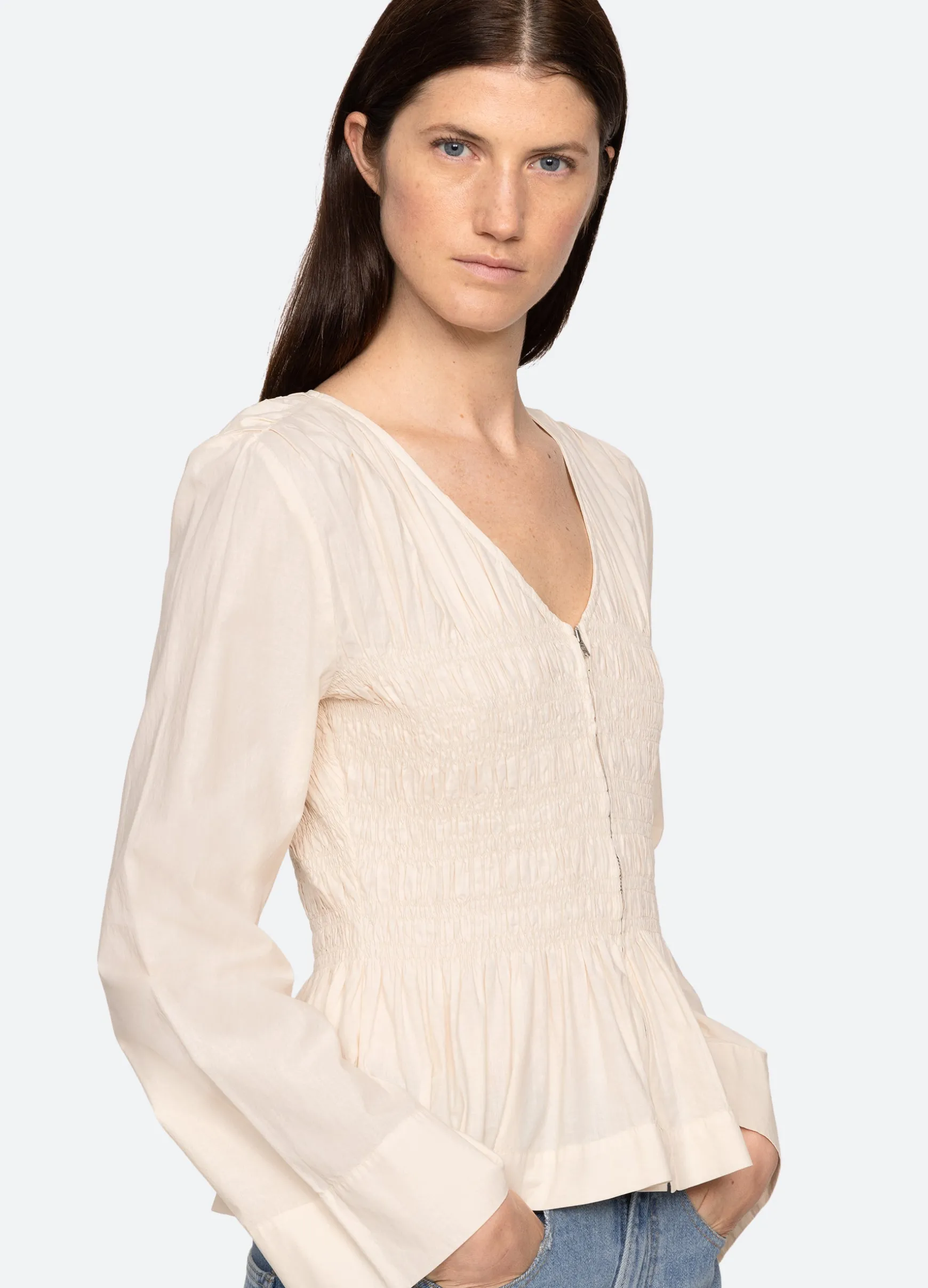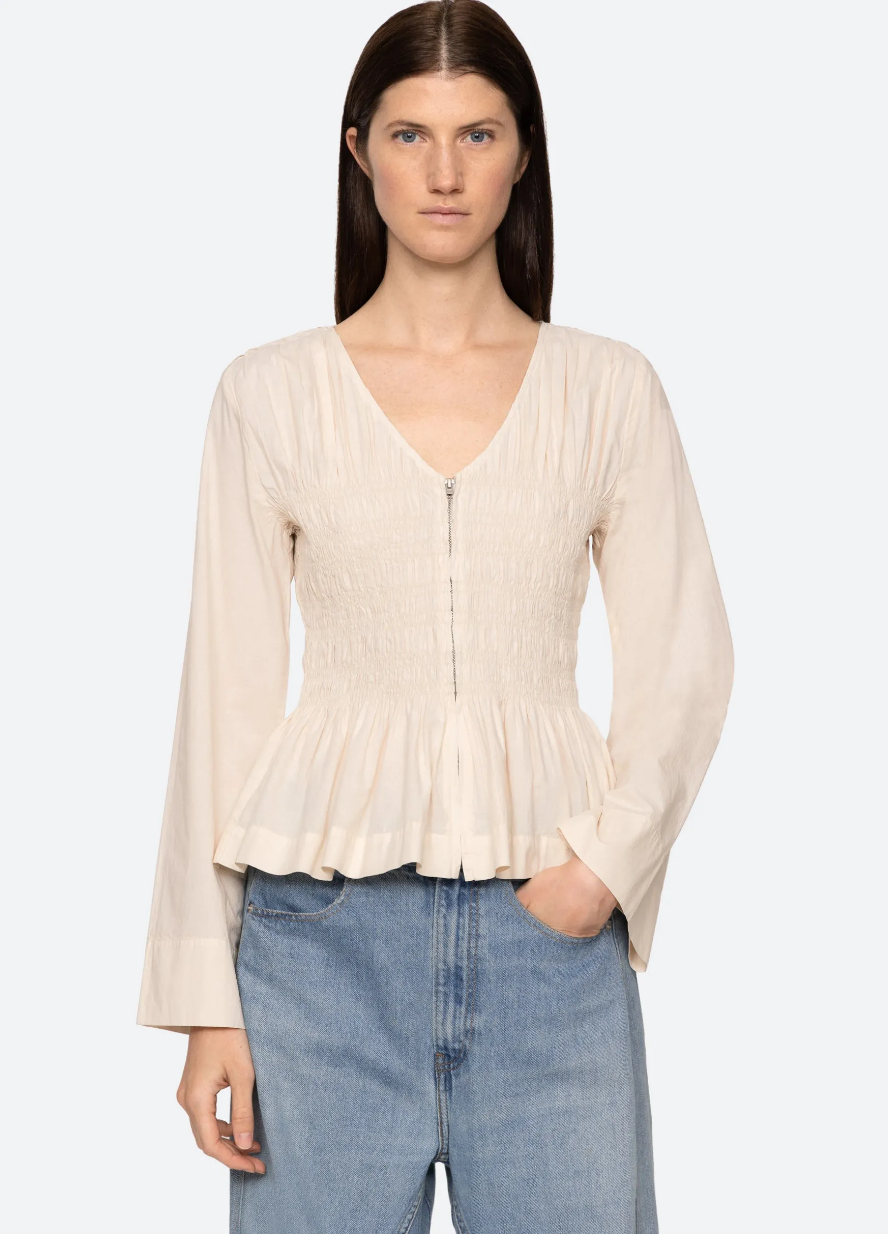 The Teri top features long voluminous sleeves, v-neckline, smocked bodice, exposed front zipper and peplum hem.