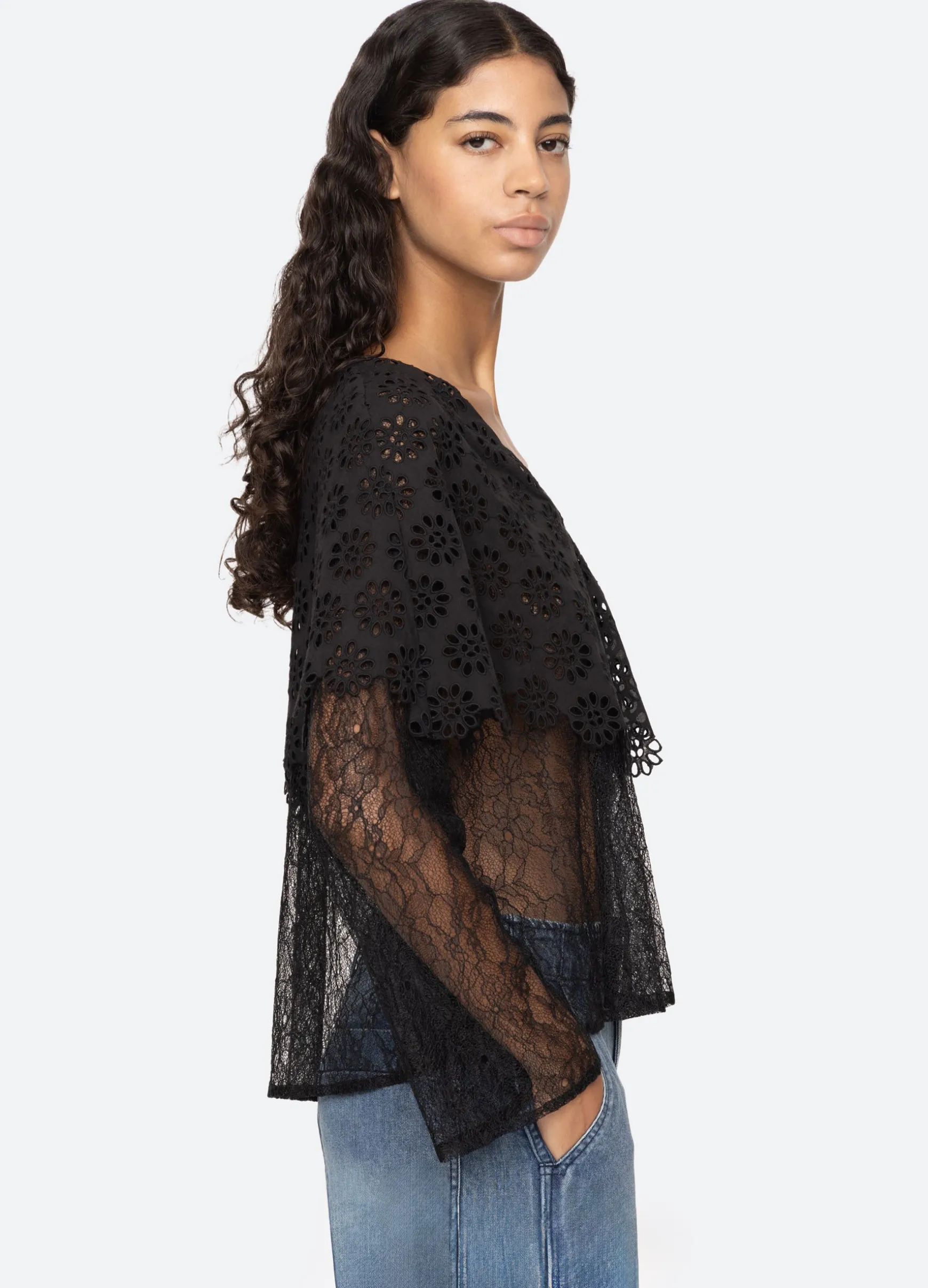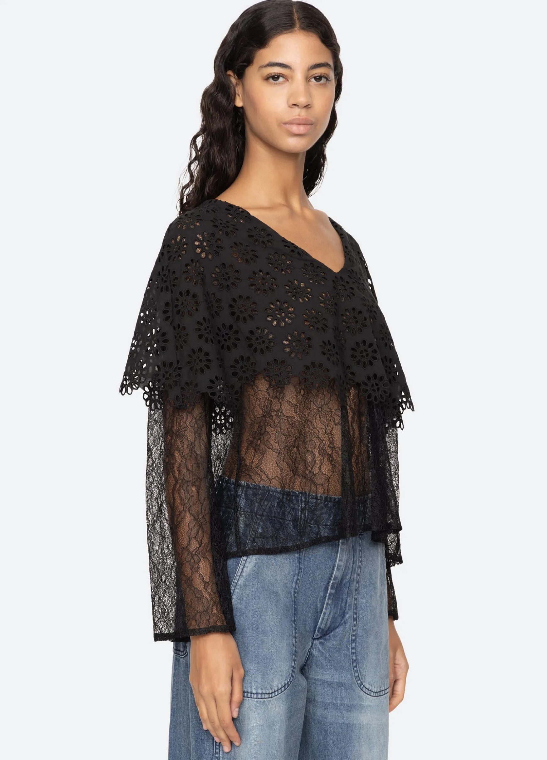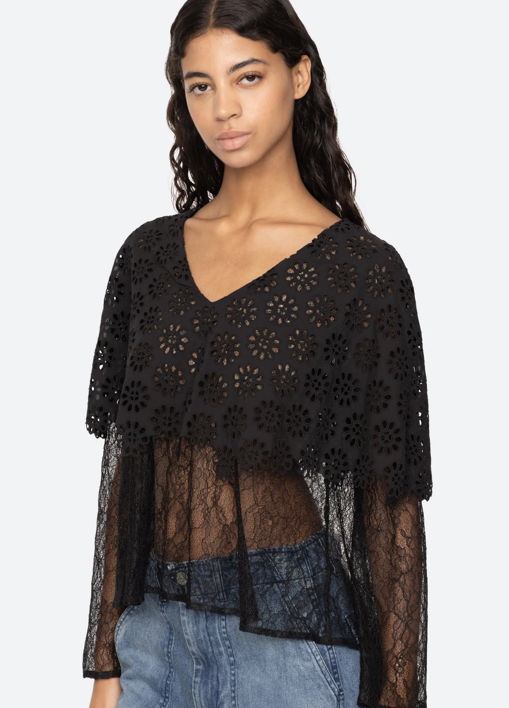 A online and in store exclusive. The Vale lace capelet top features long sleeves, v-neckline and delicate lace and embroidered detailing throughout.