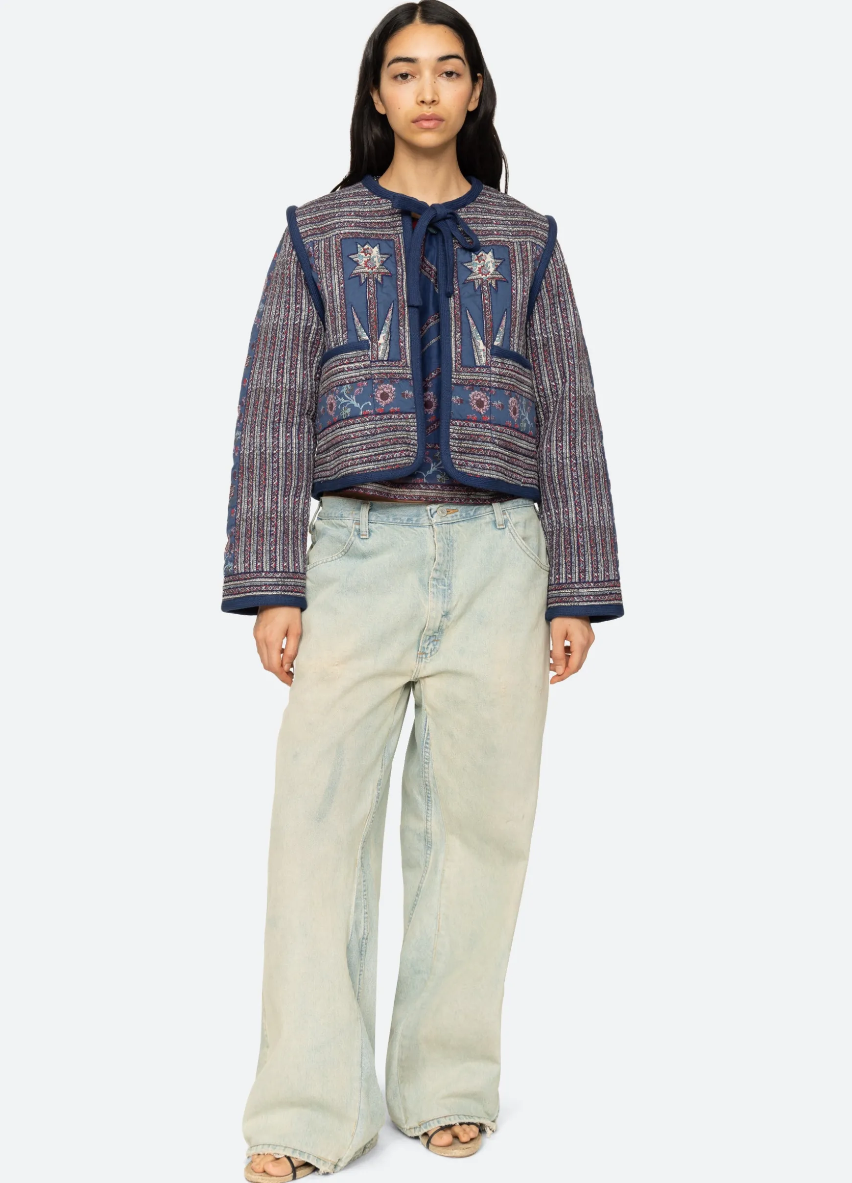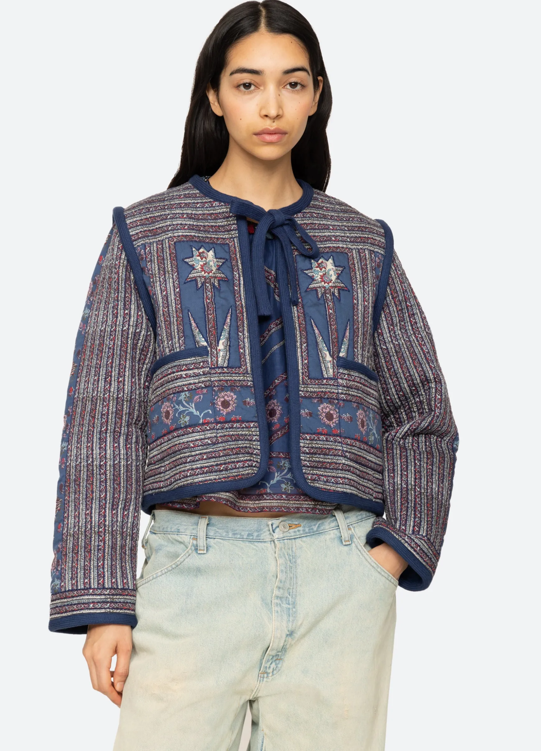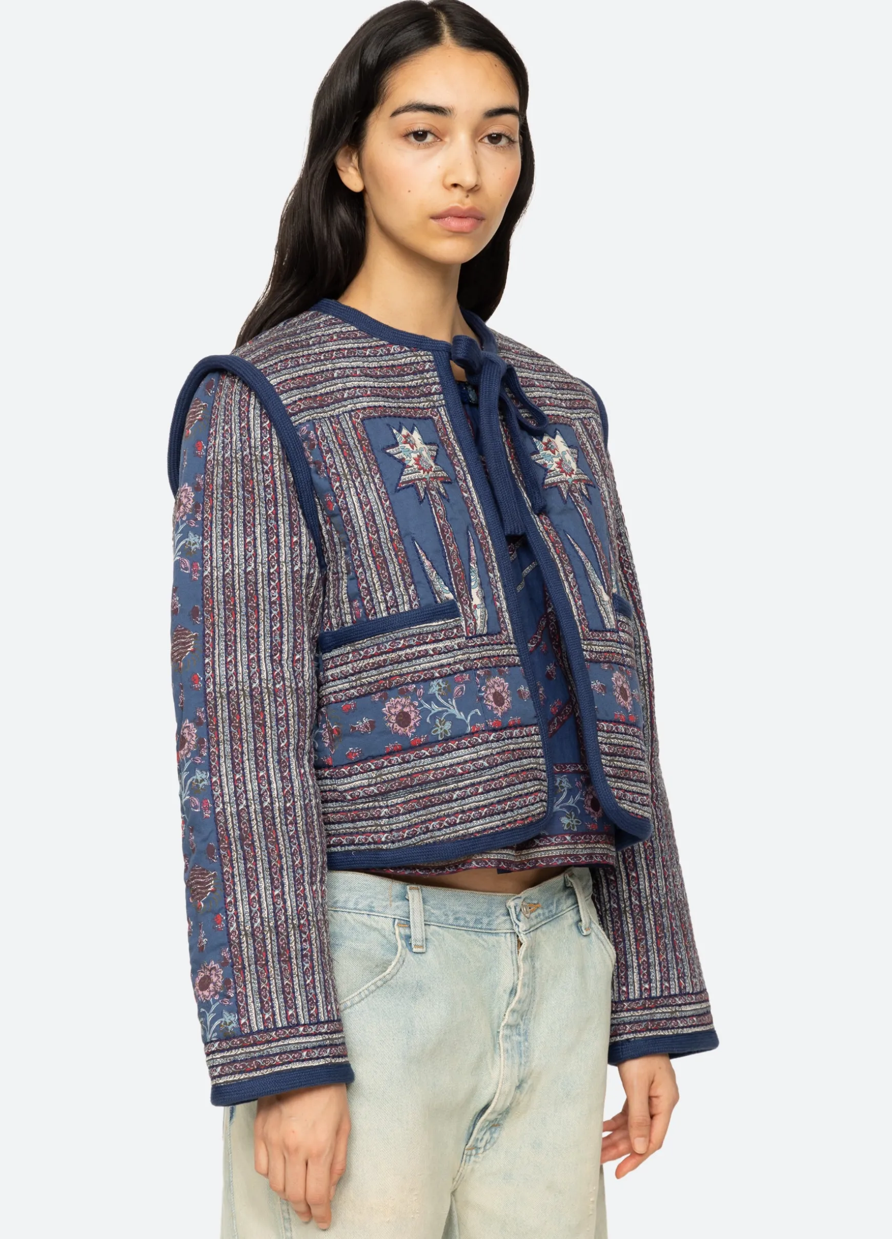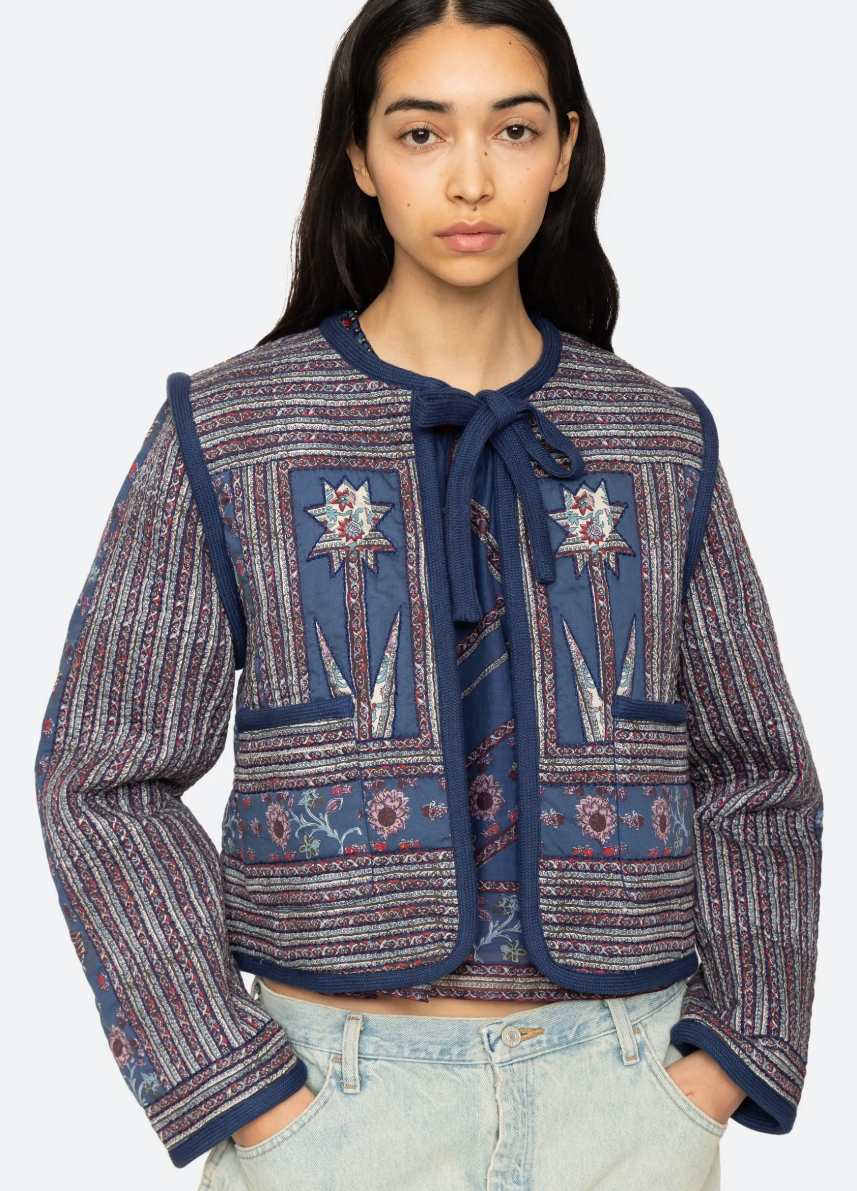 The Valeria floral print jacketfeatures quilted detailing and contrast trim accents.
