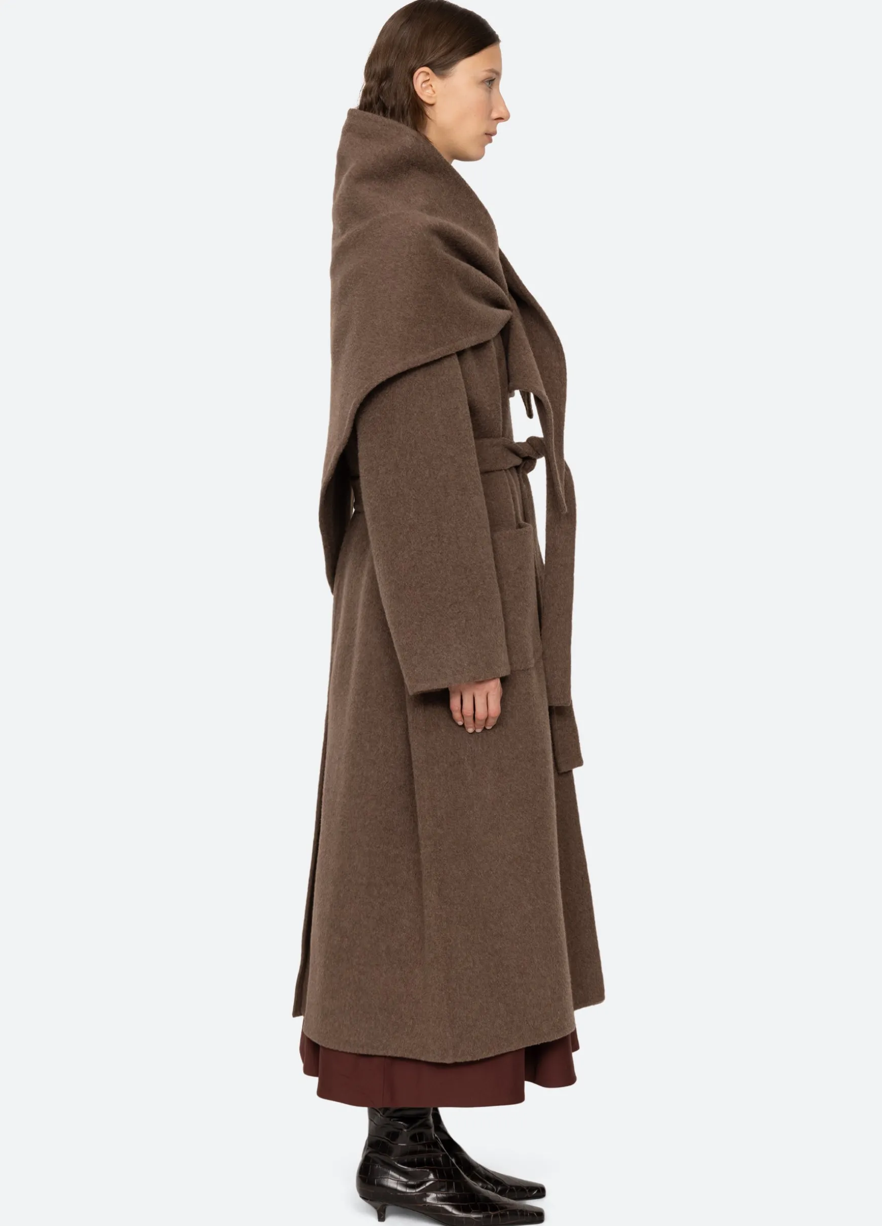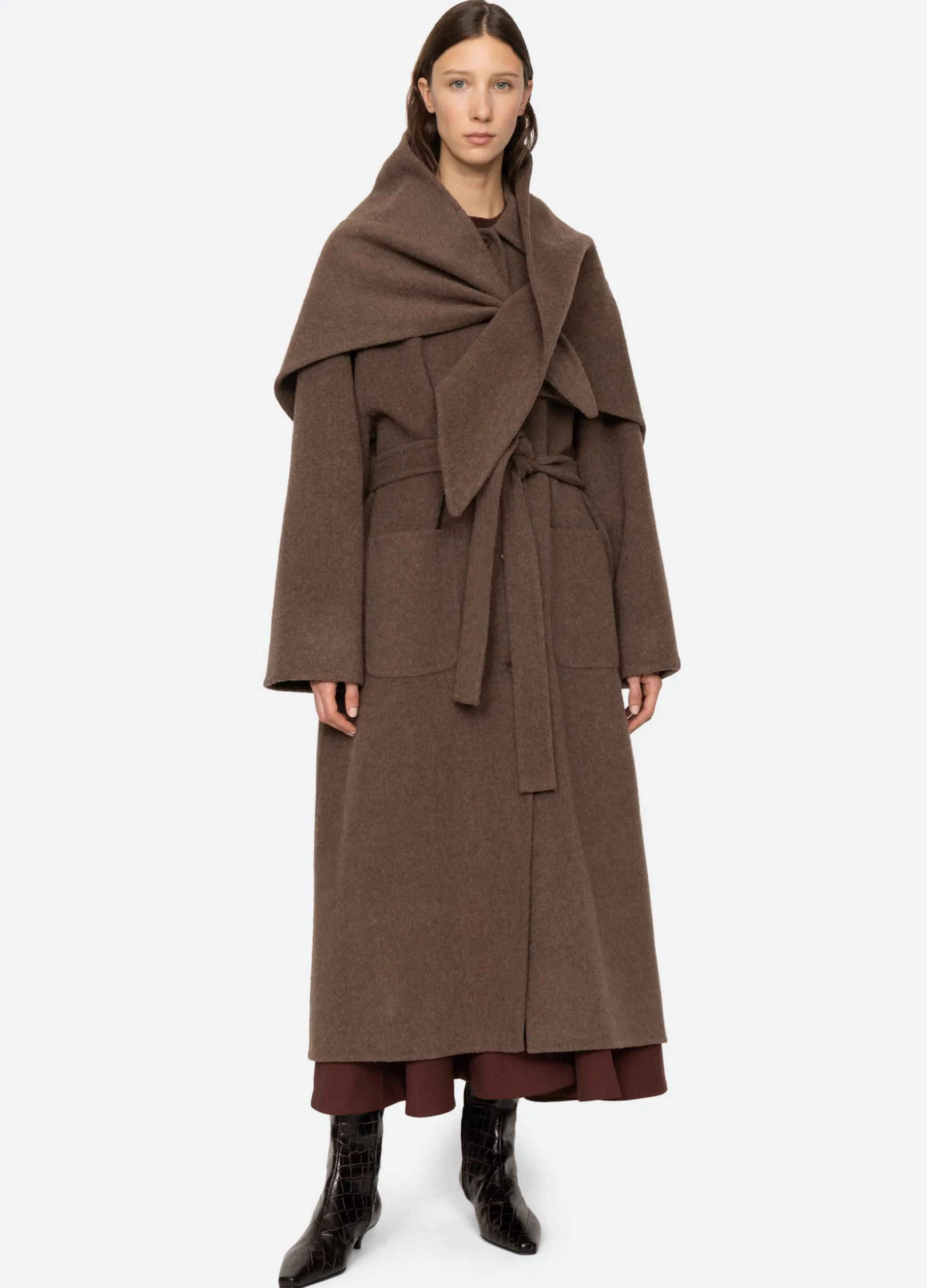 The Viv wool coat features an oversized detachable scarf and removable belt.