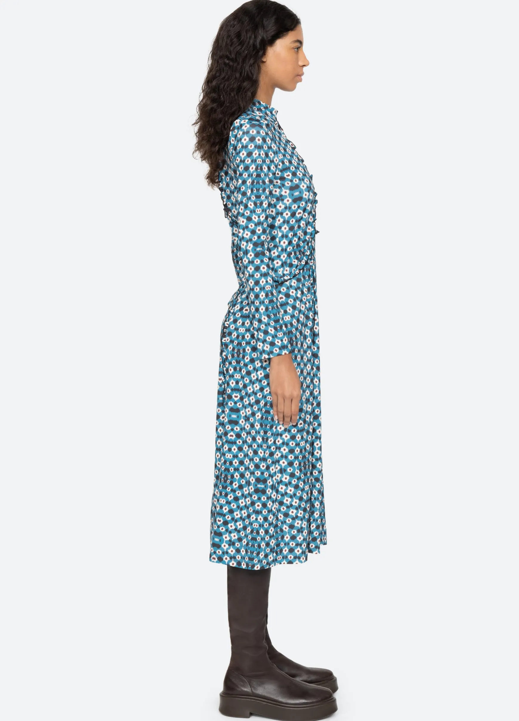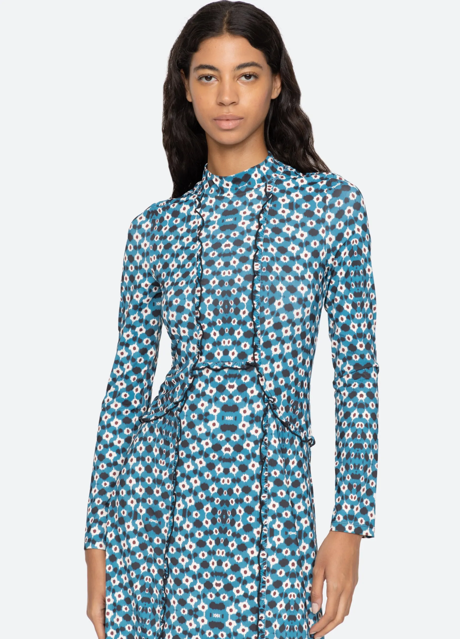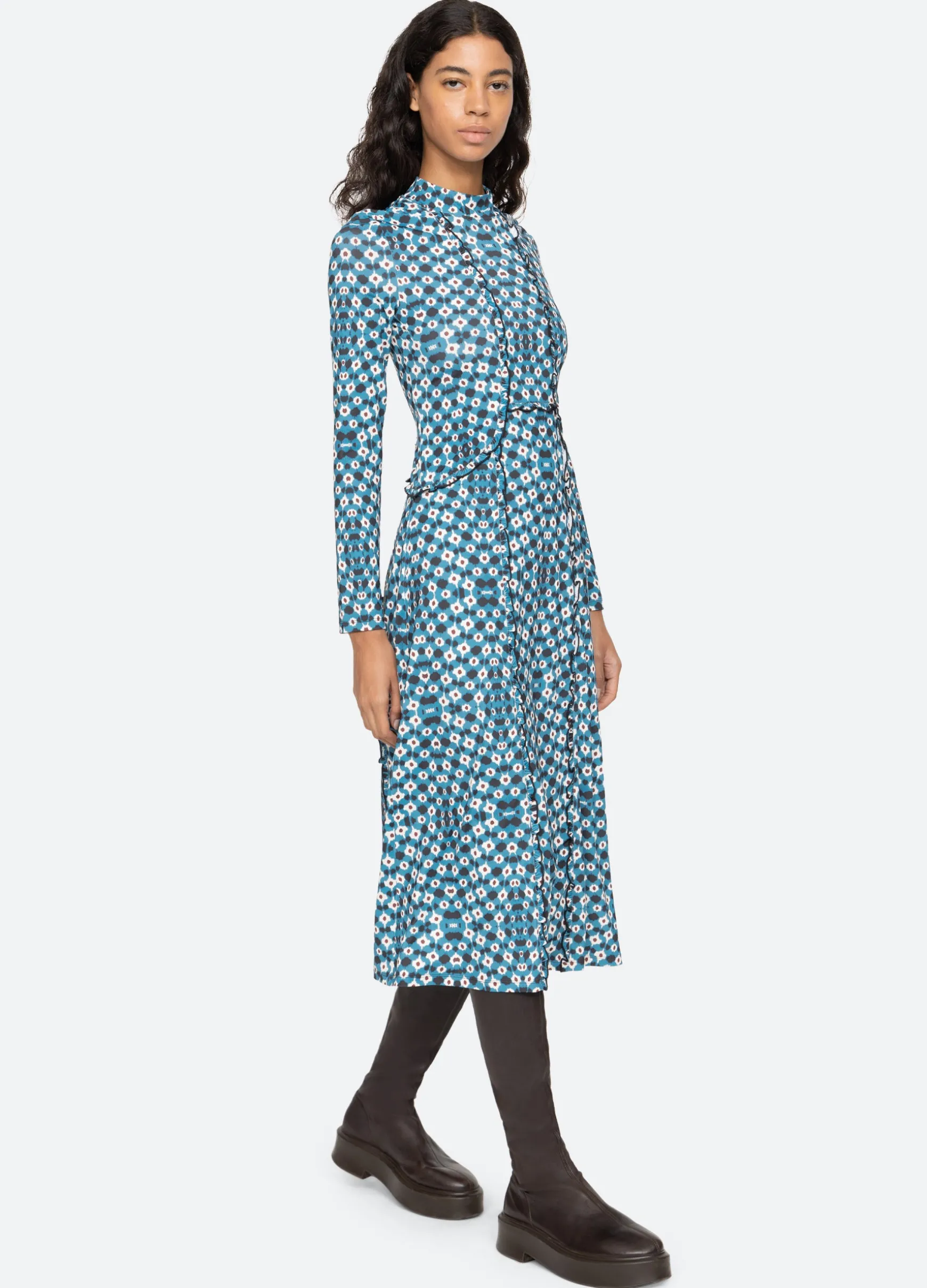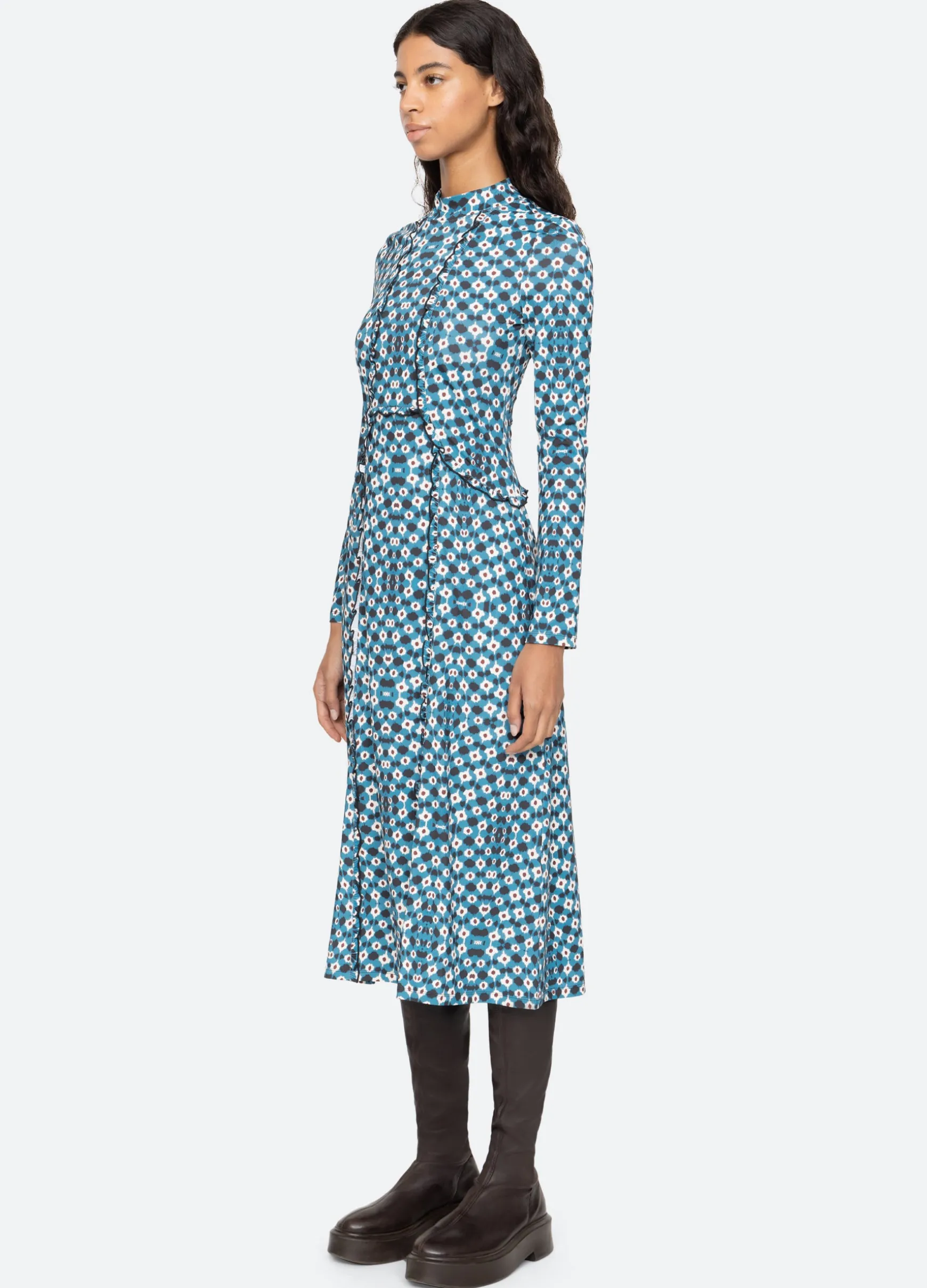 An online and in store exclusive. The Zina graphic print dress features ruffle detailing, long sleeves, turtleneck, and midi silhouette.